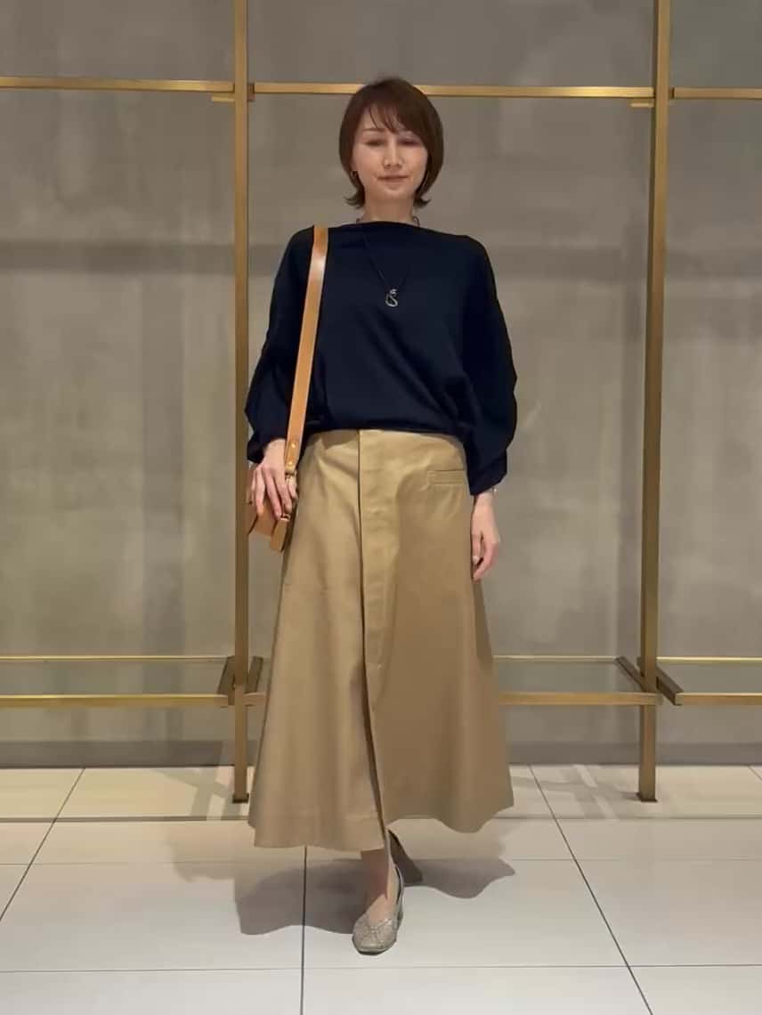 清涼感のある風合いがこれからの季節に心地よい一着。袖や後ろ身頃に深く取られたタックが、着るだけで立体的なシルエットを作り出し、痩せ型の私でも体が泳ぐような理想的なボリューム感を楽しめます。バックのVラインの抜け感が、重たくなりがちなネイビーを軽やかに、そして女性らしく見せてくれます。
