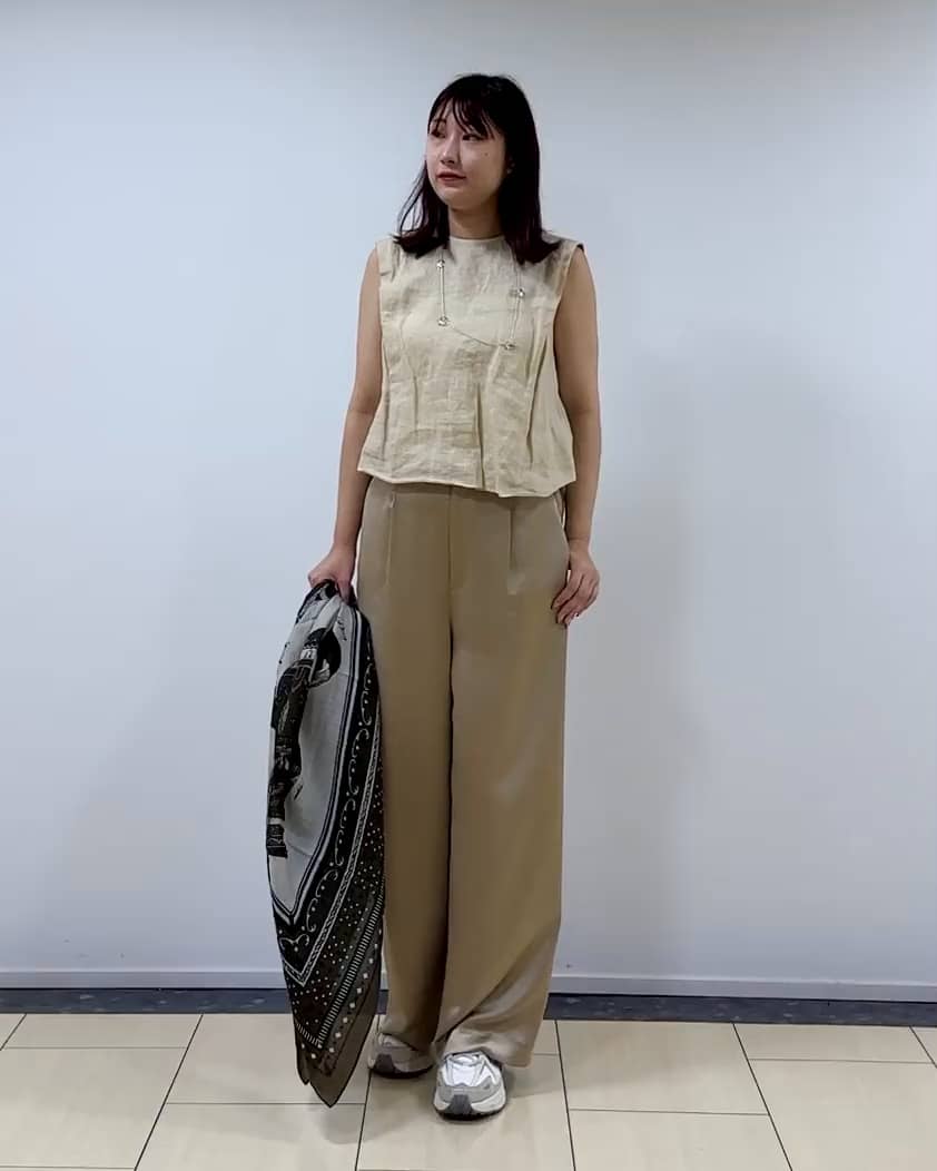 着用感:麻素材で涼やかなノースリーブ。肩や二の腕の気になる部分を隠してくれるデザインなのも嬉しいポイント。一枚で涼しくお召いただけます。