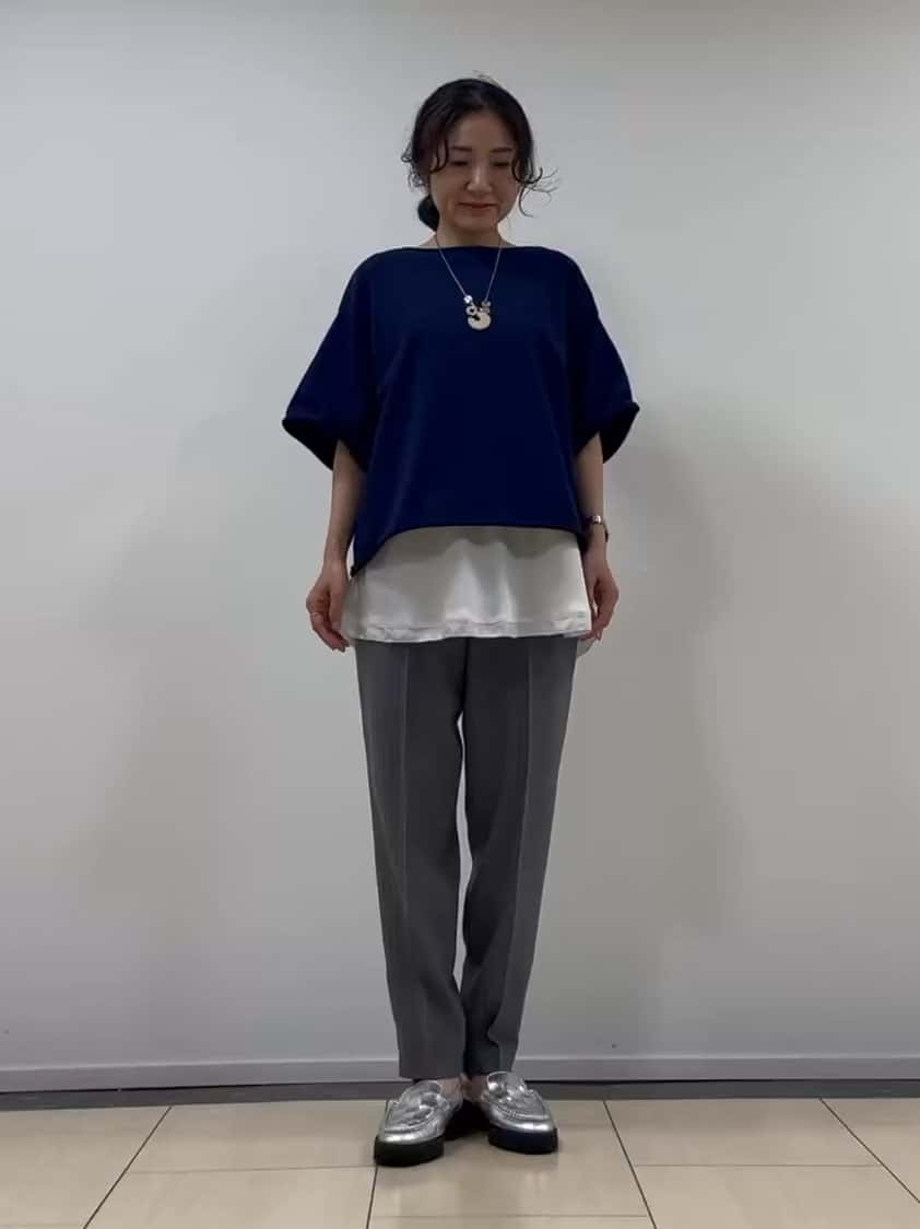 光沢と清涼感が心地よい、Tシャツ型のニット。152cmの私が着て、短めの着丈が腰位置を高く見せてくれます。袖口や裾のカーリング始末が、シンプルな中のさりげないアクセントに。