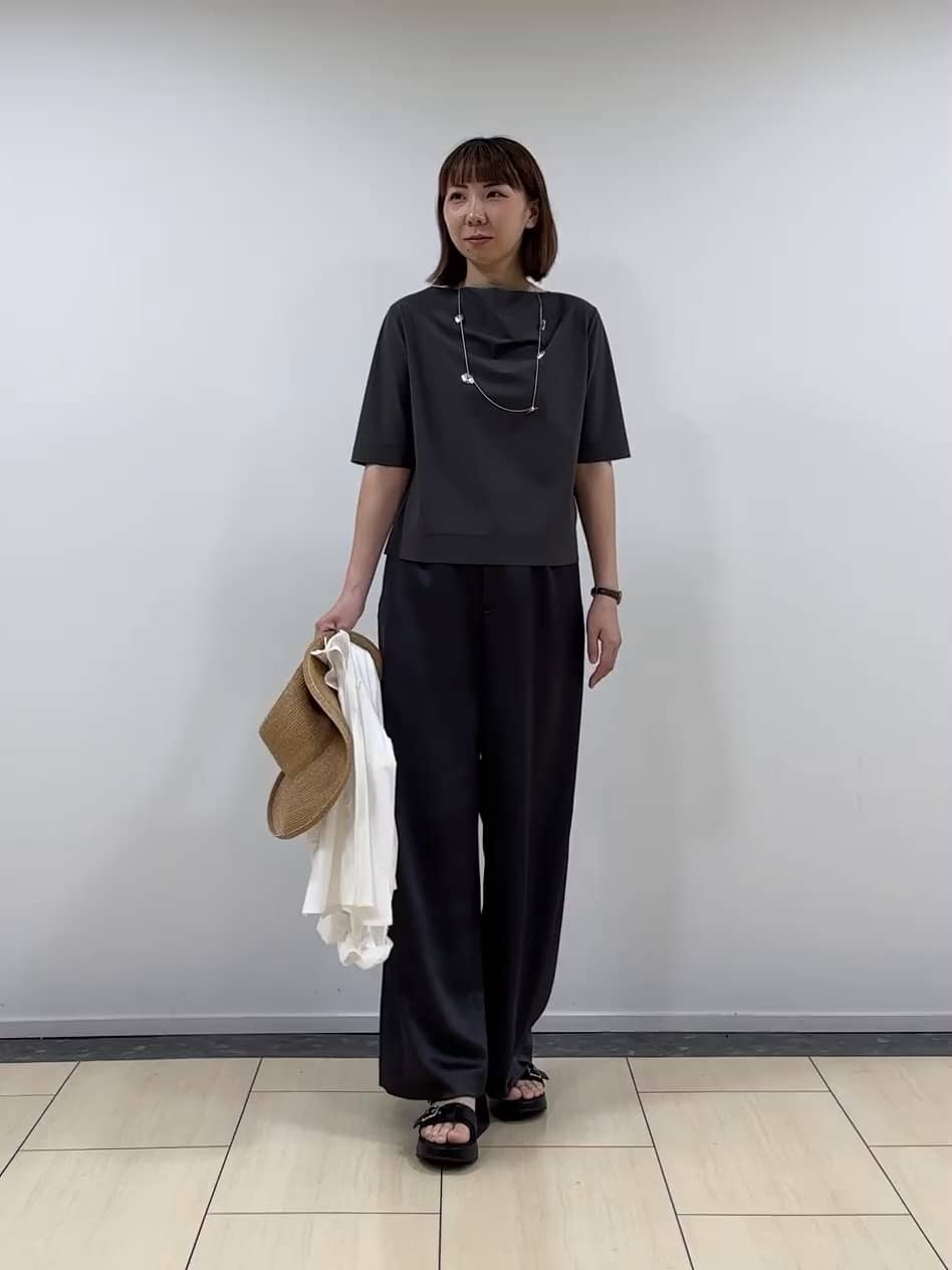 着用感:襟元が控えめなドレープでスッキリ見えします。