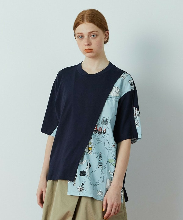 「旅」をモチーフにイラストレーターの大野まみさんに描いてもらった柄を無地のTシャツにドッキングしたカットソー。