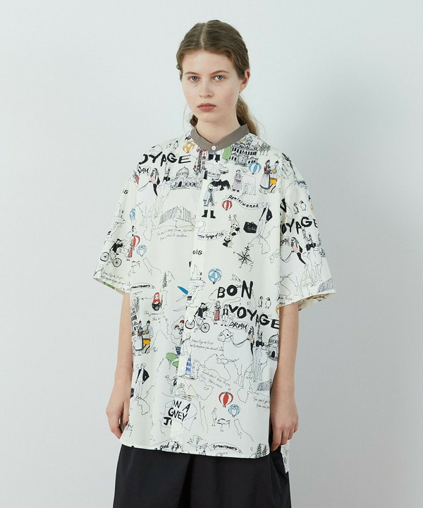 日本の北からスコットランドを目指す旅をモチーフに描いた柄のロングシャツを使ったコーディネートです。
