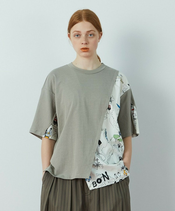 柔らかい色味のベージュのTシャツに、オリジナルイラストがプリントされた生地がドッキングしたデザインカットソーを使ったコーディネートです。