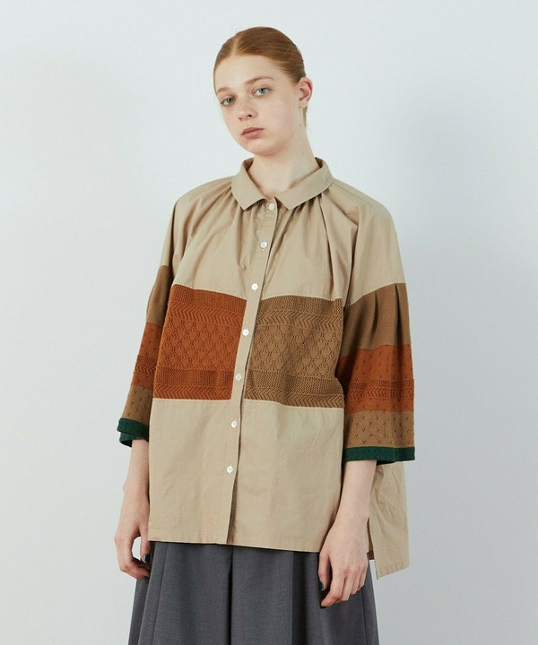 タイプライター生地にハイゲージニットがドッキングした、秋を感じさせるブラウスを着ました。