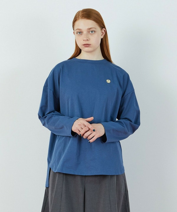 ドライタッチな綿素材を使ったロンTと、サラッとした軽い肌触りのボリュームパンツのコーディネートです。