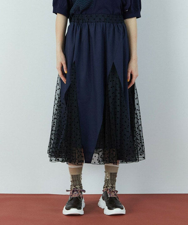 ネイビー地のスカートに透け感のあるブラックのチュールが大人っぽいミモレ丈は、ニットをドッキングする事で女性らしいふんわりとしたシルエットのトップスと合わせる事で、甘い雰囲気になりました。