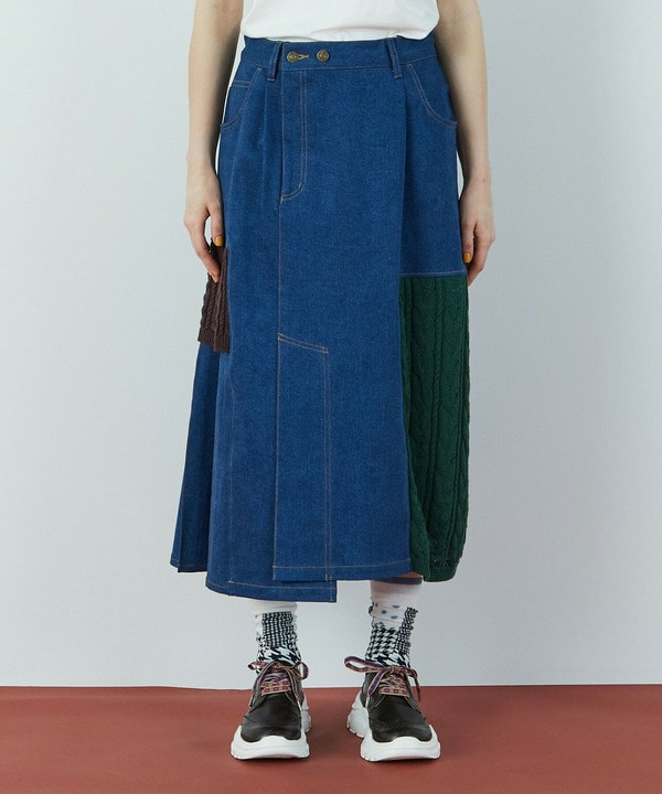 左右で折柄の違うニットプルオーバーとデニムスカートのコーディネート。