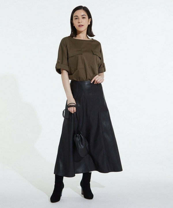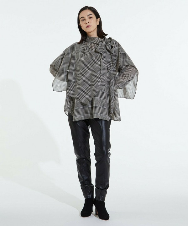 ケープ付きブラウスはスカートとコーディネートするとより華やかに。エコレザーのスカートを合わせれば甘くなりすぎない大人の装いになります。ケープを外せばデイリーにもお召しいただけます。