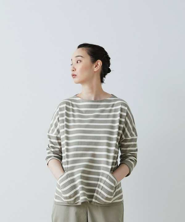 ライトカーキのボーダーバスクシャツにはリラックス感のあるテーパードパンツを◎ウエストゴム使用ではきやすい上にきれいめに見える優秀パンツです。