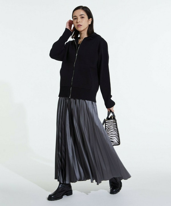 店頭でも一番人気のサテンのプリーツスカートを合わせています。