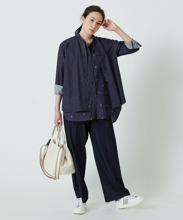 新作シリーズのデニムセットアップスタイル。前身頃が2重になったデニムシャツは他にない遊び心のある一枚です。さっと羽織るだけでお洒落に。モノグラム柄が新鮮なデニムパンツもタックが大人な印象です。軽く着やすい5オンスのデニムは夏~秋でロングランで着ていただけます。