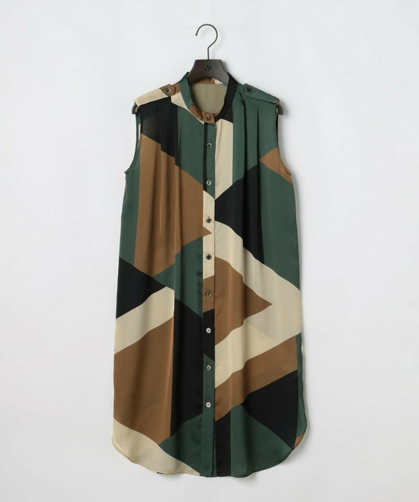 幾何学柄のミリタリーテイストのカラーも光沢のある素材を選べば上品な雰囲気に。