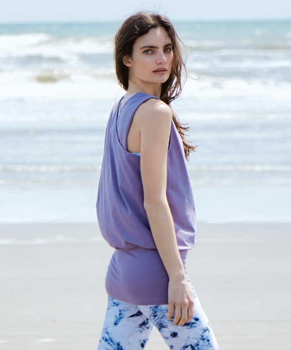 トップスは伸縮性があり、着心地抜群。肩にかかるデザインが二の腕をきれいにみせてくれ、バックスタイルもポイントです。