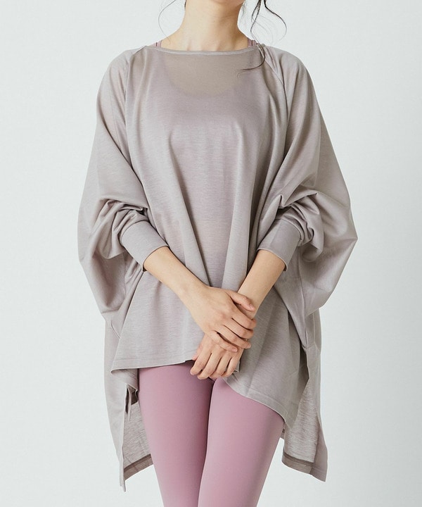 ベージュ×ベージュのワントーンコーディネートです。トップスはポンチョ型でヒップが隠れる丈なので、スタジオへの行き帰りにもぴったりです。
