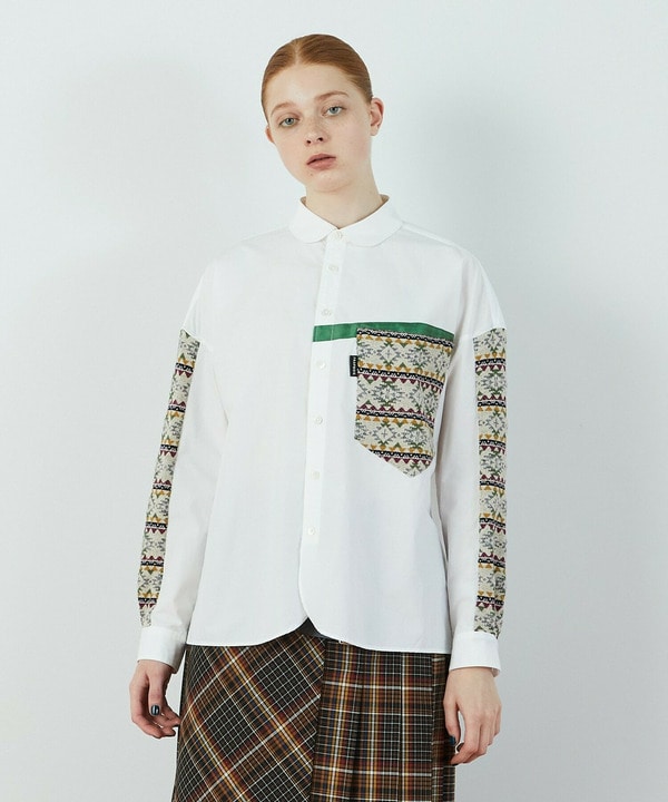 リラックスしたシルエットの白シャツに、フォークロア調の編み柄がかわいいパーツをドッキングしたシャツブラウス。