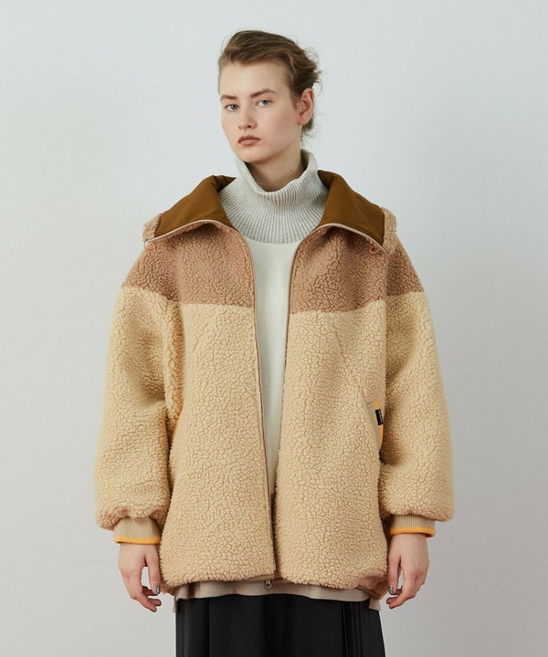 冬らしいボアを使ったブルゾンを、女性らしいブラウスとスカートのセットアップに合わせて着ました。