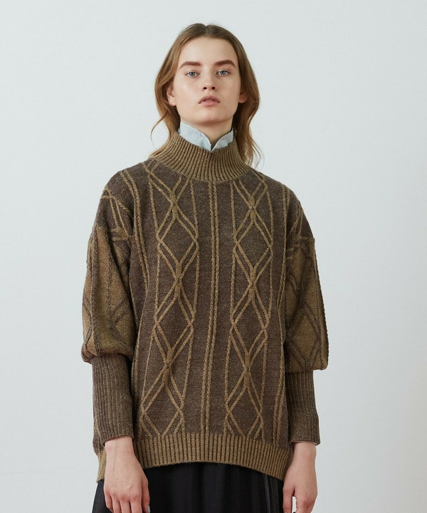 袖口の長めのリブや、ハイネックが少し変わったデザインのニットなので、1枚で着てもサマになるのが嬉しいポイント。