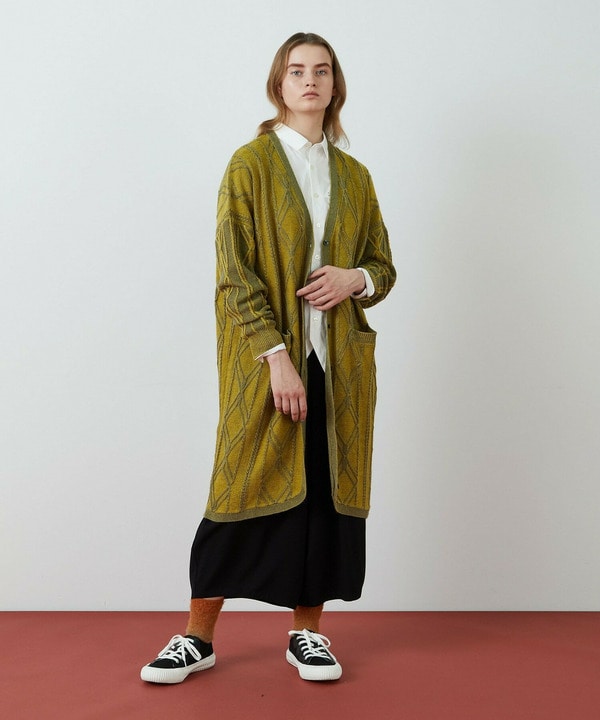ゆったりとしたリラックスシルエットのワンピースとロングカーデの組み合わせ。