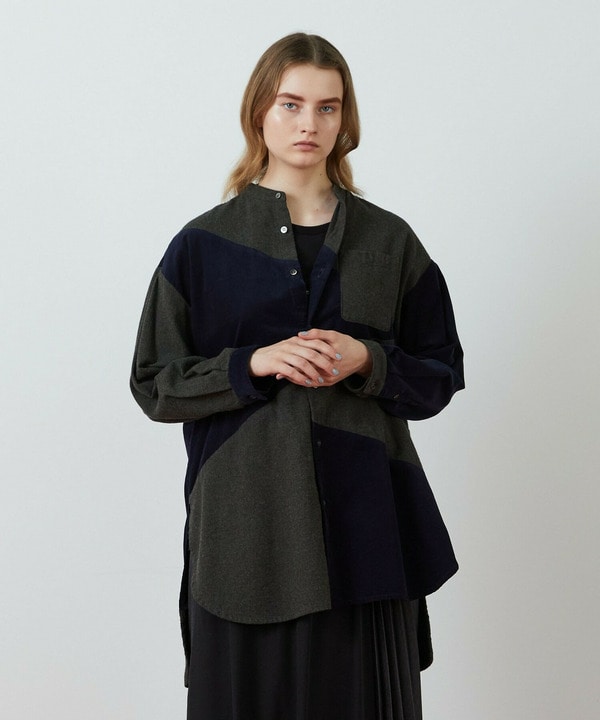 起毛素材とコーデュロイがパッチワークされたロングシャツを冬らしくコーディネートしました。