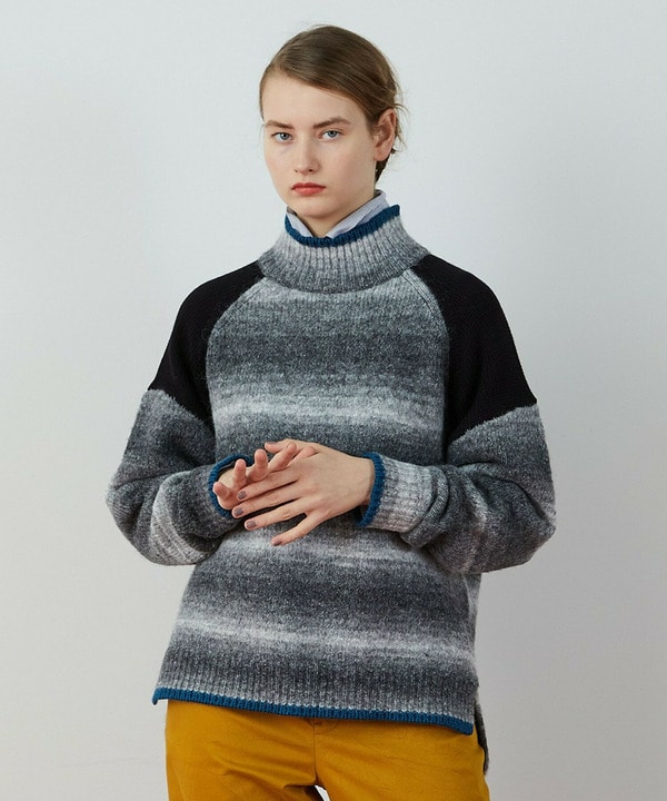 糸自体がグラデーションになった特殊な糸で編み上げたハイネックセーター。