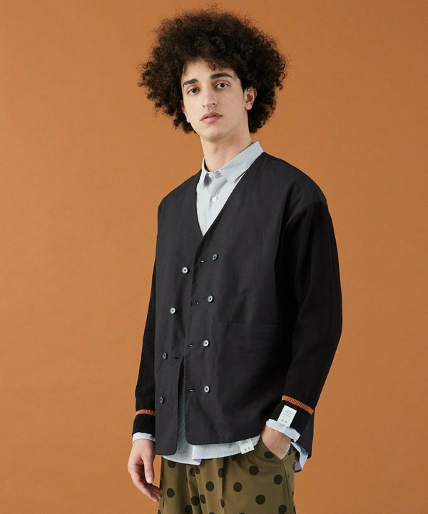 綿100%でお手入れもしやすいジャケットはノーカラーのVネックとダブルボタンが特徴。