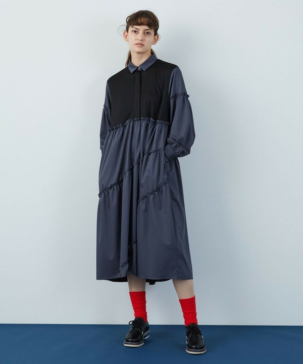 同系色の異素材ミックスと短すぎない丈が大人っぽいワンピースです。