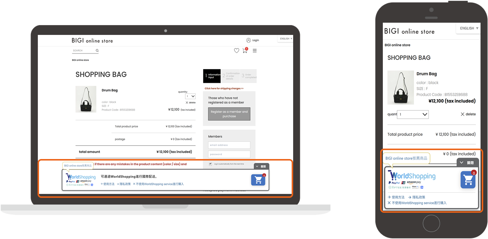 1. 当您从日本以外的国家/地区访问网站时,在页面底部会自动显示“WorldShopping Cart“(WorldShopping的购物车图标)。