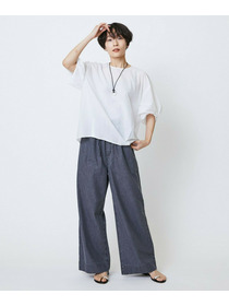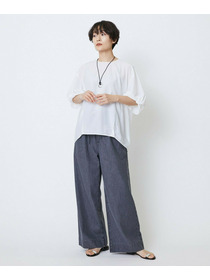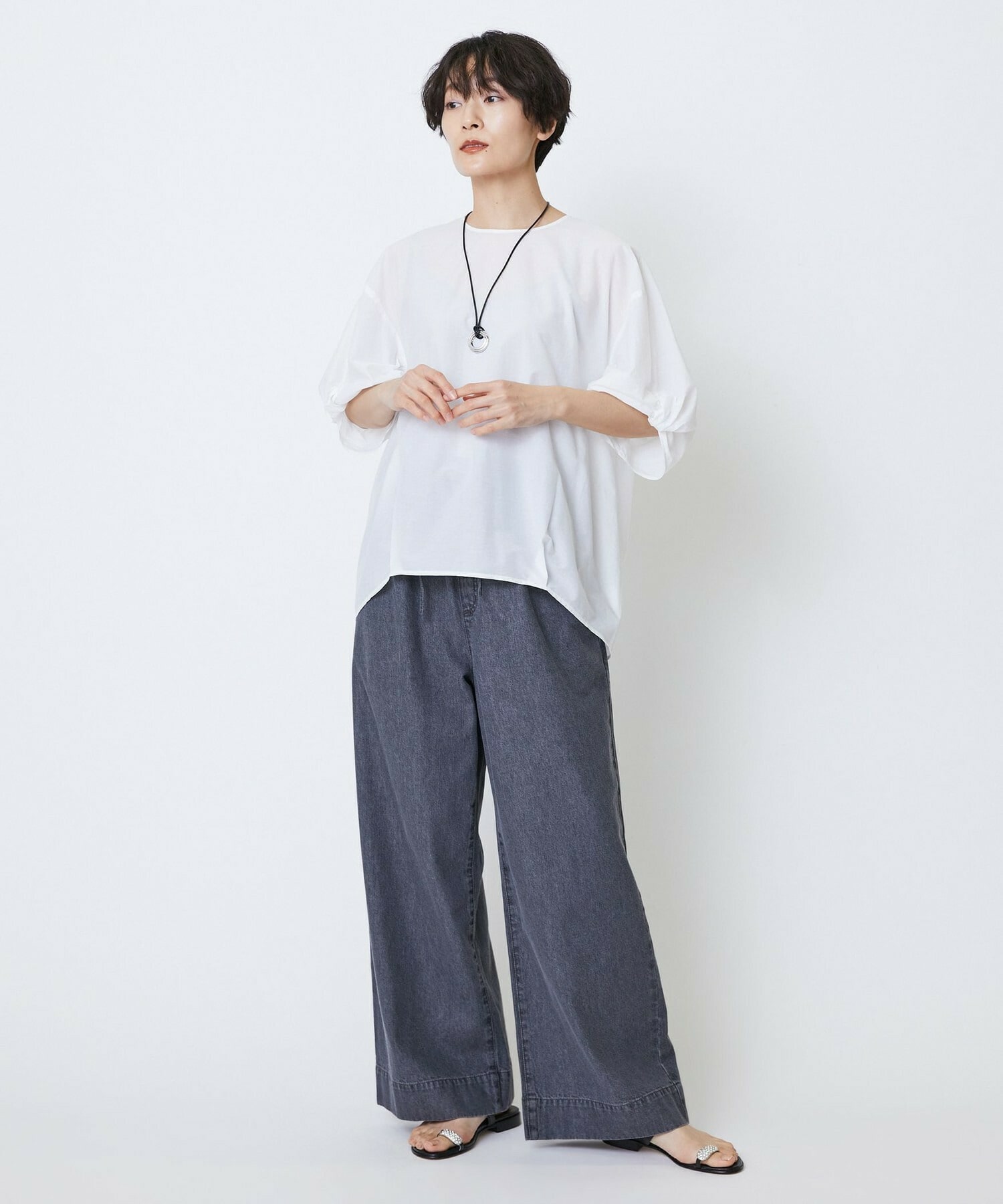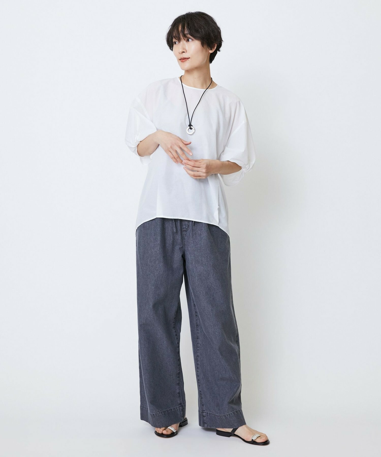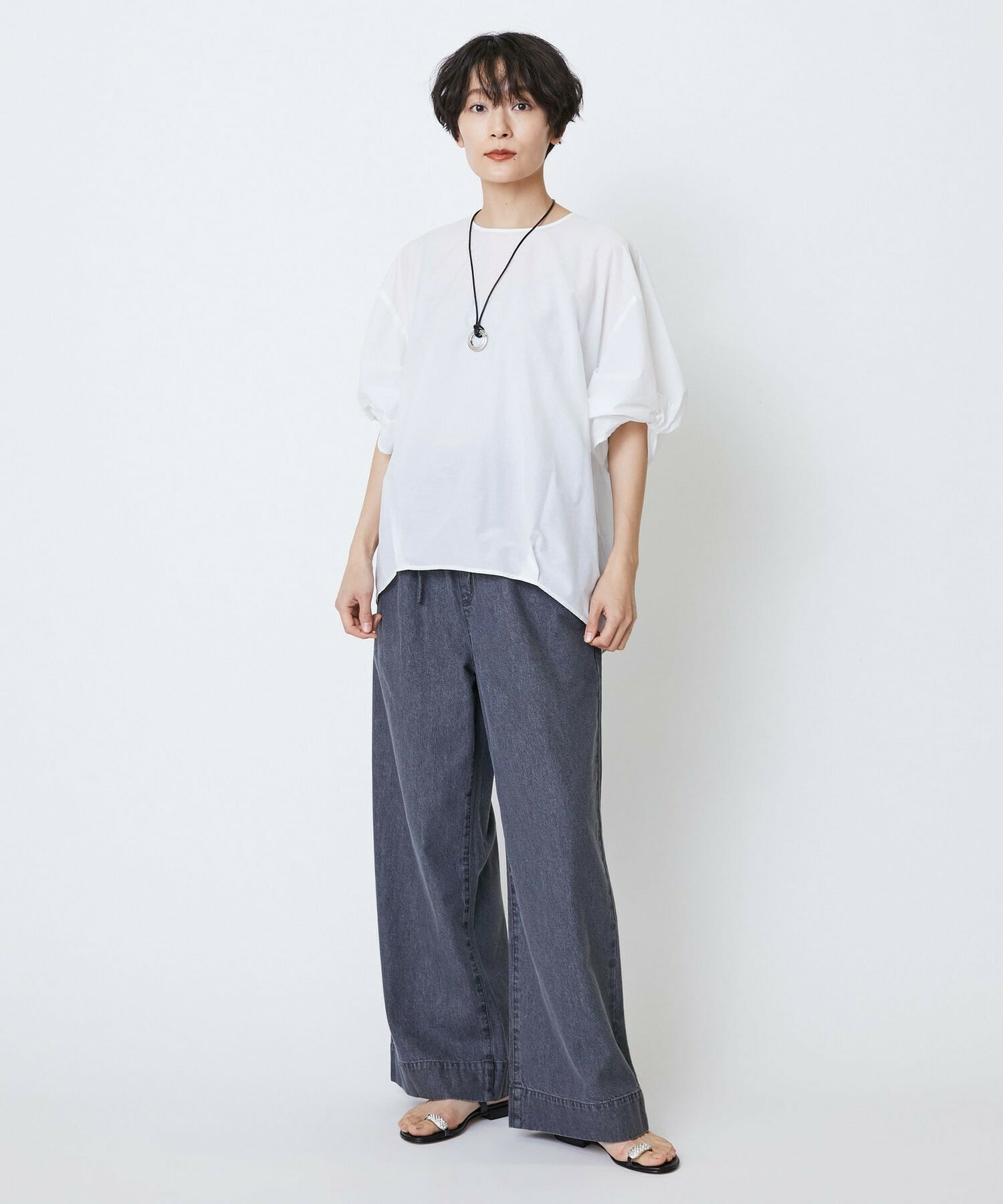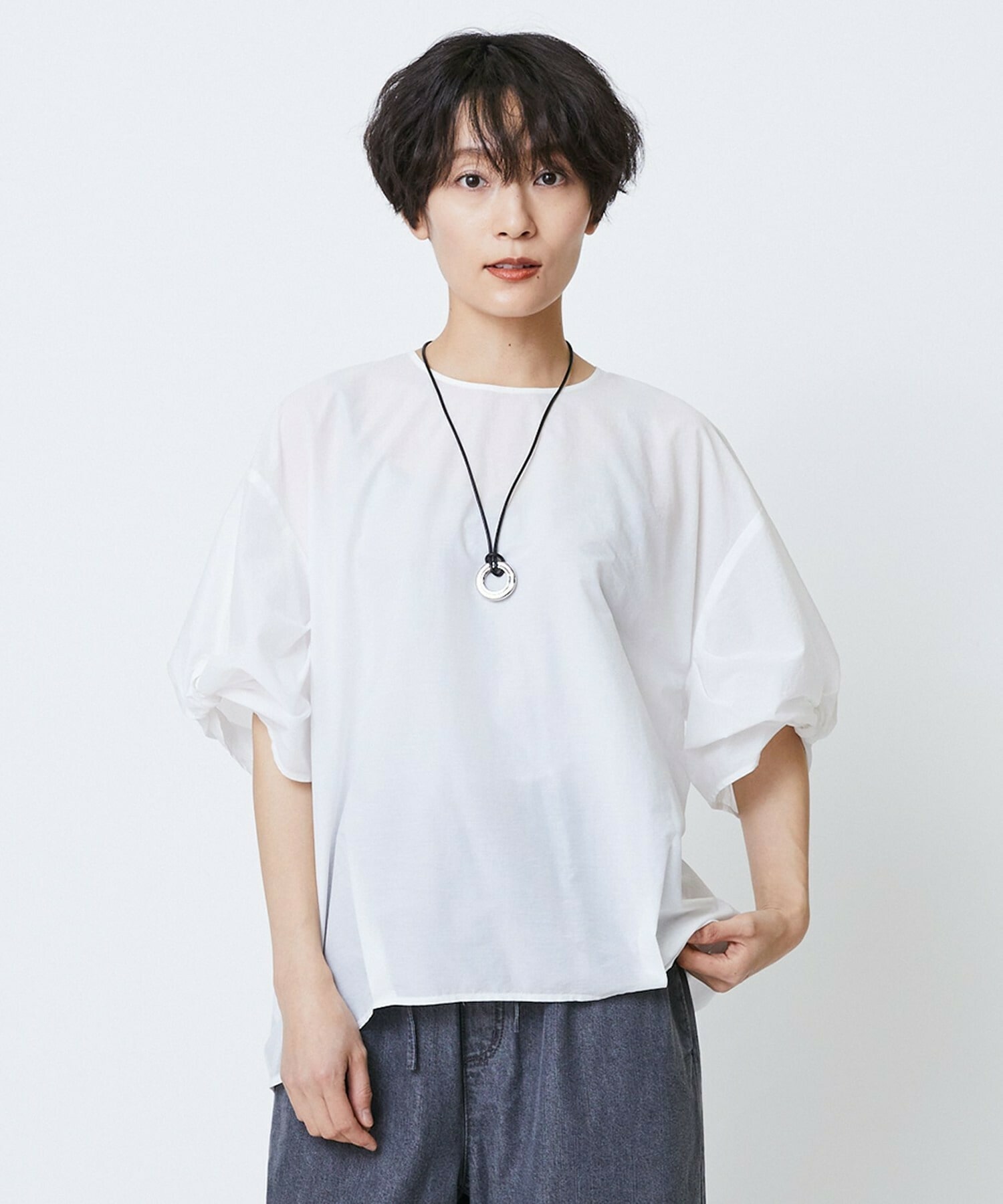袖口ツイストディティールのブラウス。普通のパフ袖と違って、少しモードな印象になっています。身頃は立体的に作ったコクーンシルエット。フロントは短めでバランスがとりやすく、バックはヒップにかかる長め丈にしています。細かいパターンにこだわって作った、女性らしく着映えするブラウスです。