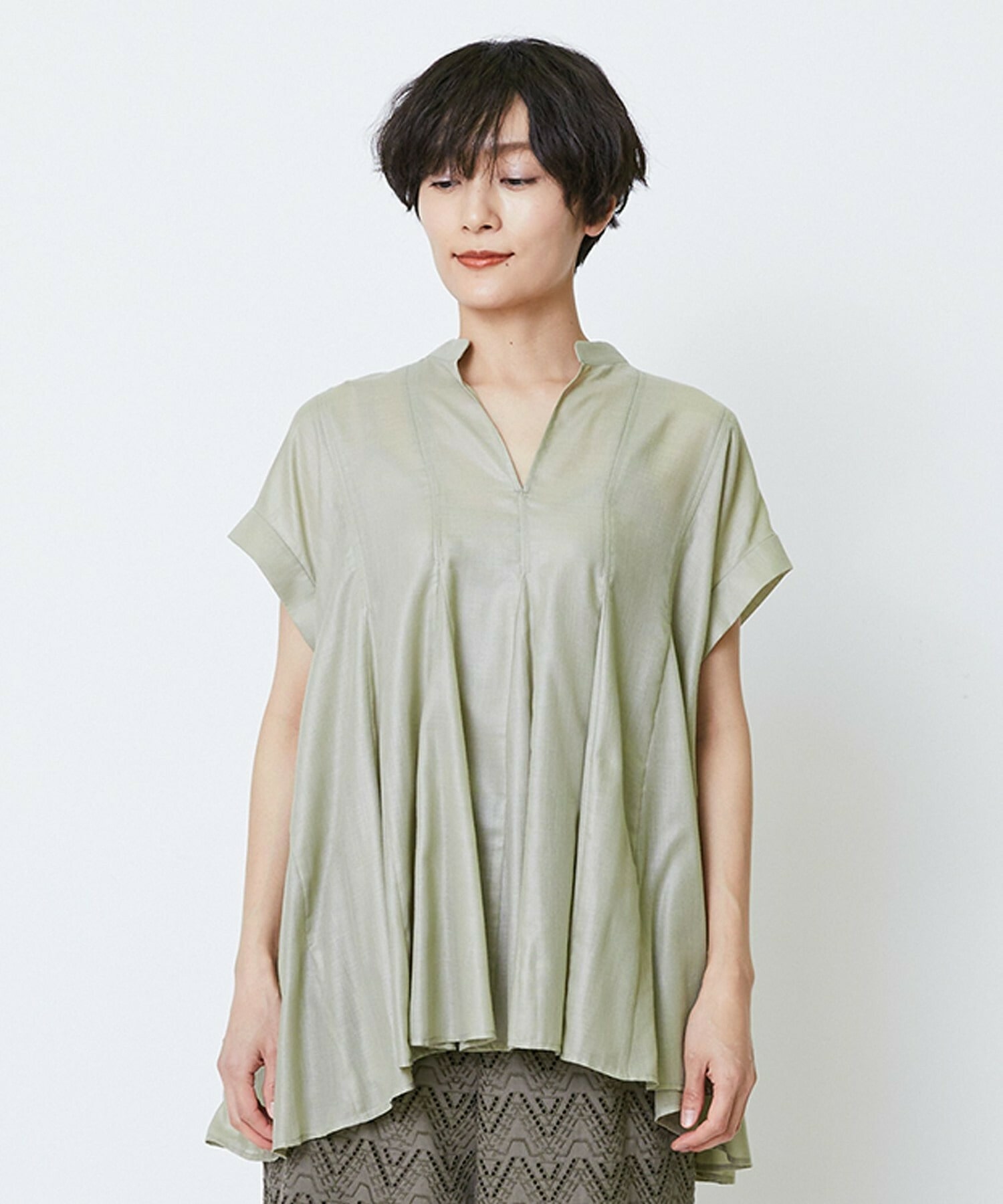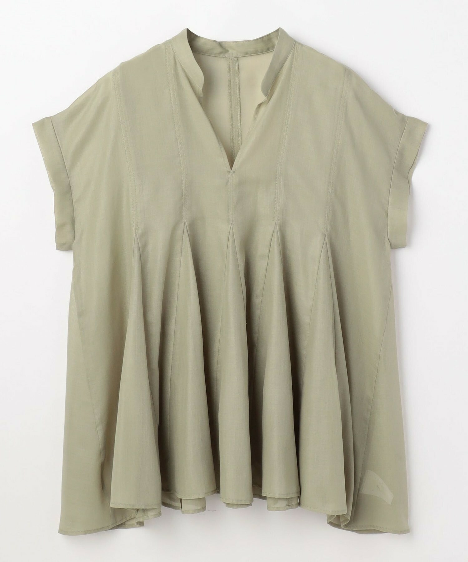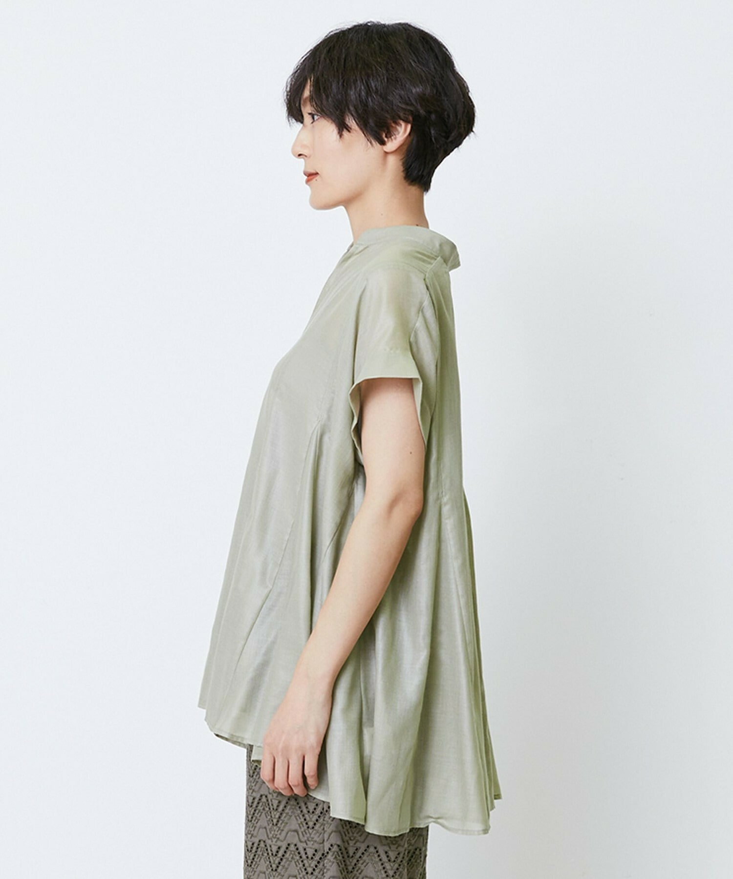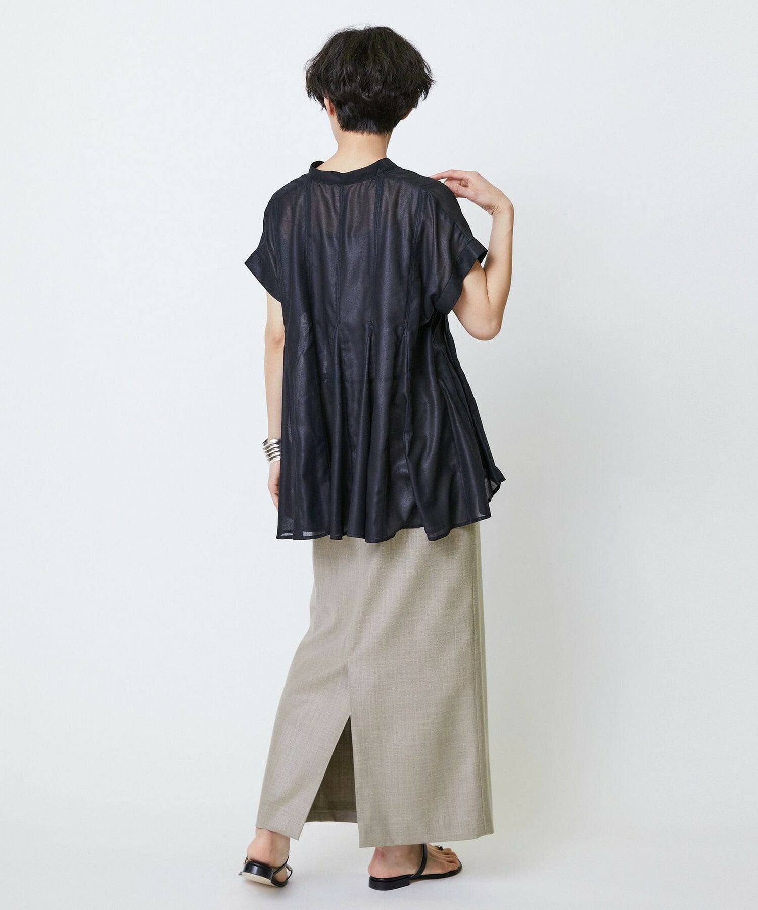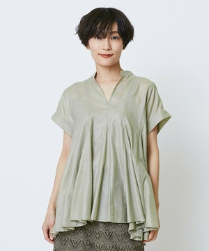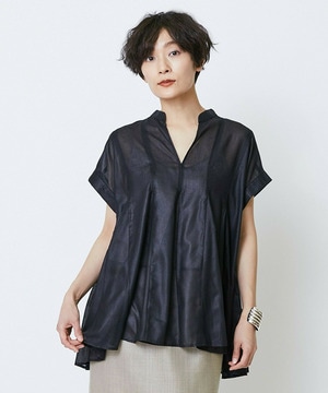 切り替えをふんだんに入れてドラマティックなシルエットを出したブラウス。生地が軽く落ち感があるのでボリュームがあってもおさまりが良く、動いたときにひらひらと表情が出て気分が上がります!夏に涼しく着られて着映えするブラウスです。