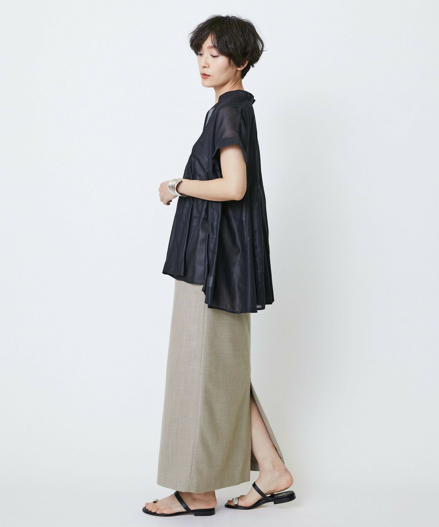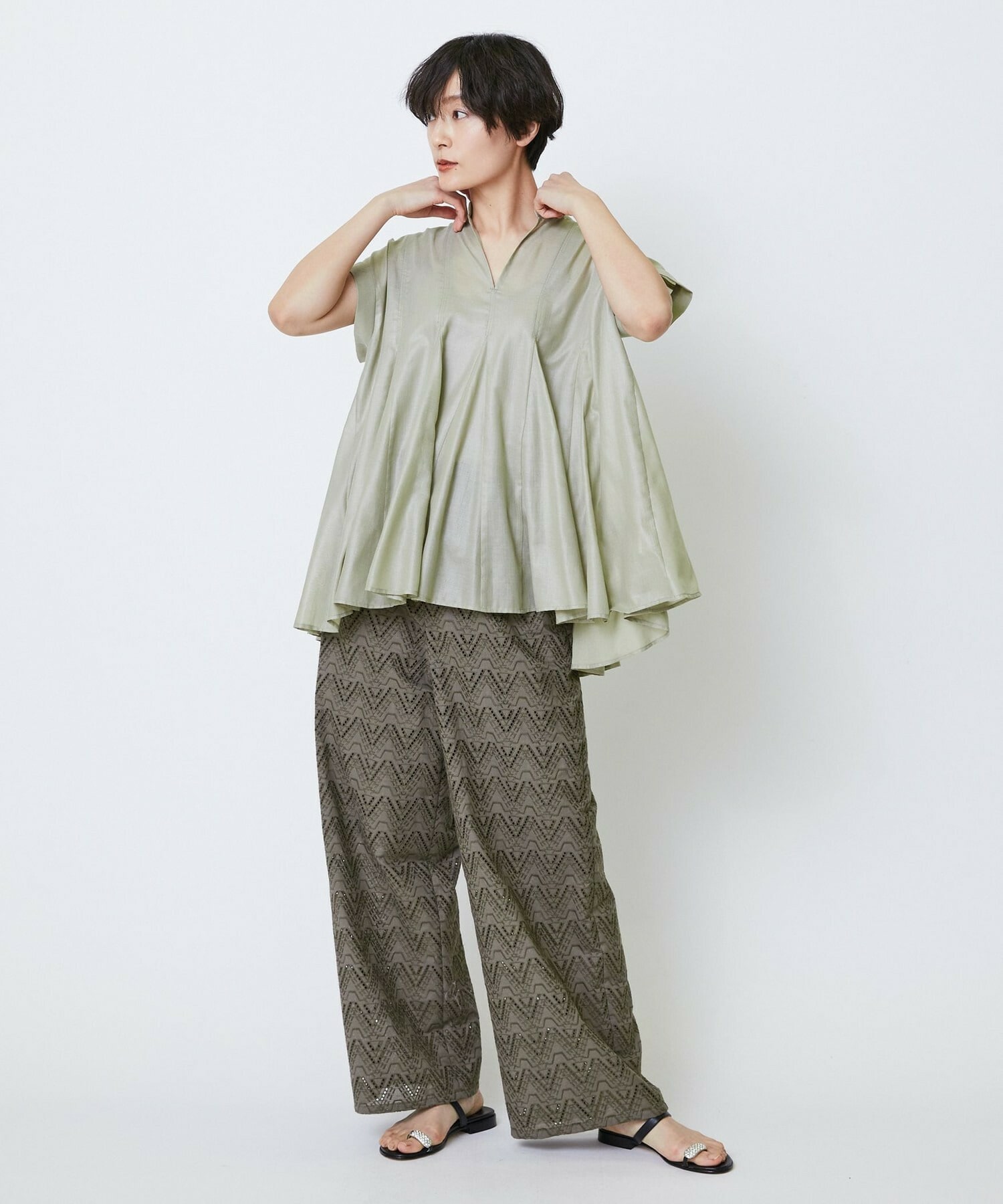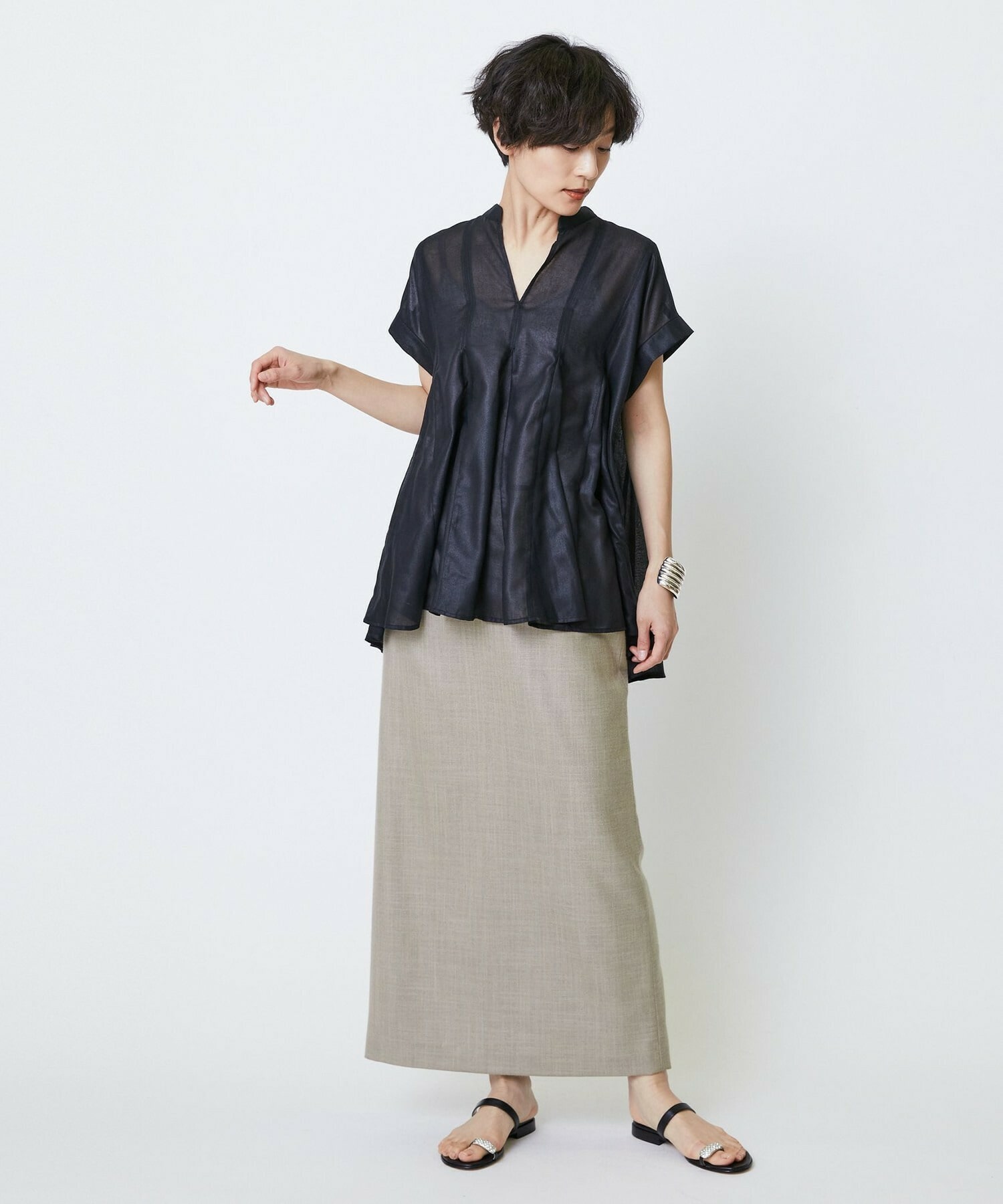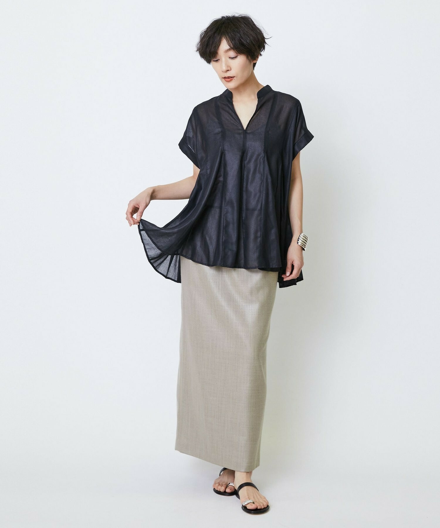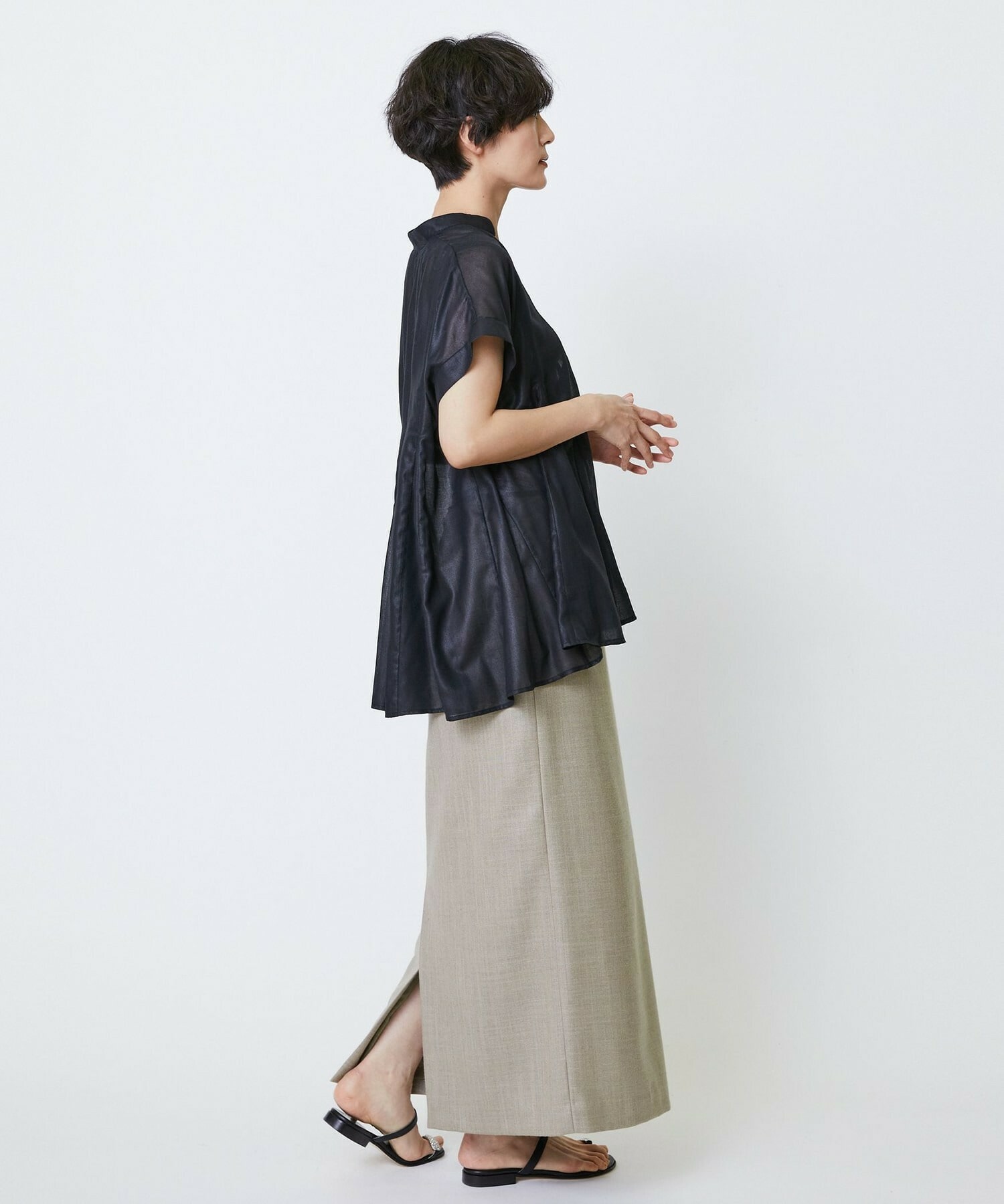 切り替えをふんだんに入れてドラマティックなシルエットを出したブラウス。生地が軽く落ち感があるのでボリュームがあってもおさまりが良く、動いたときにひらひらと表情が出て気分が上がります!夏に涼しく着られて着映えするブラウスです。