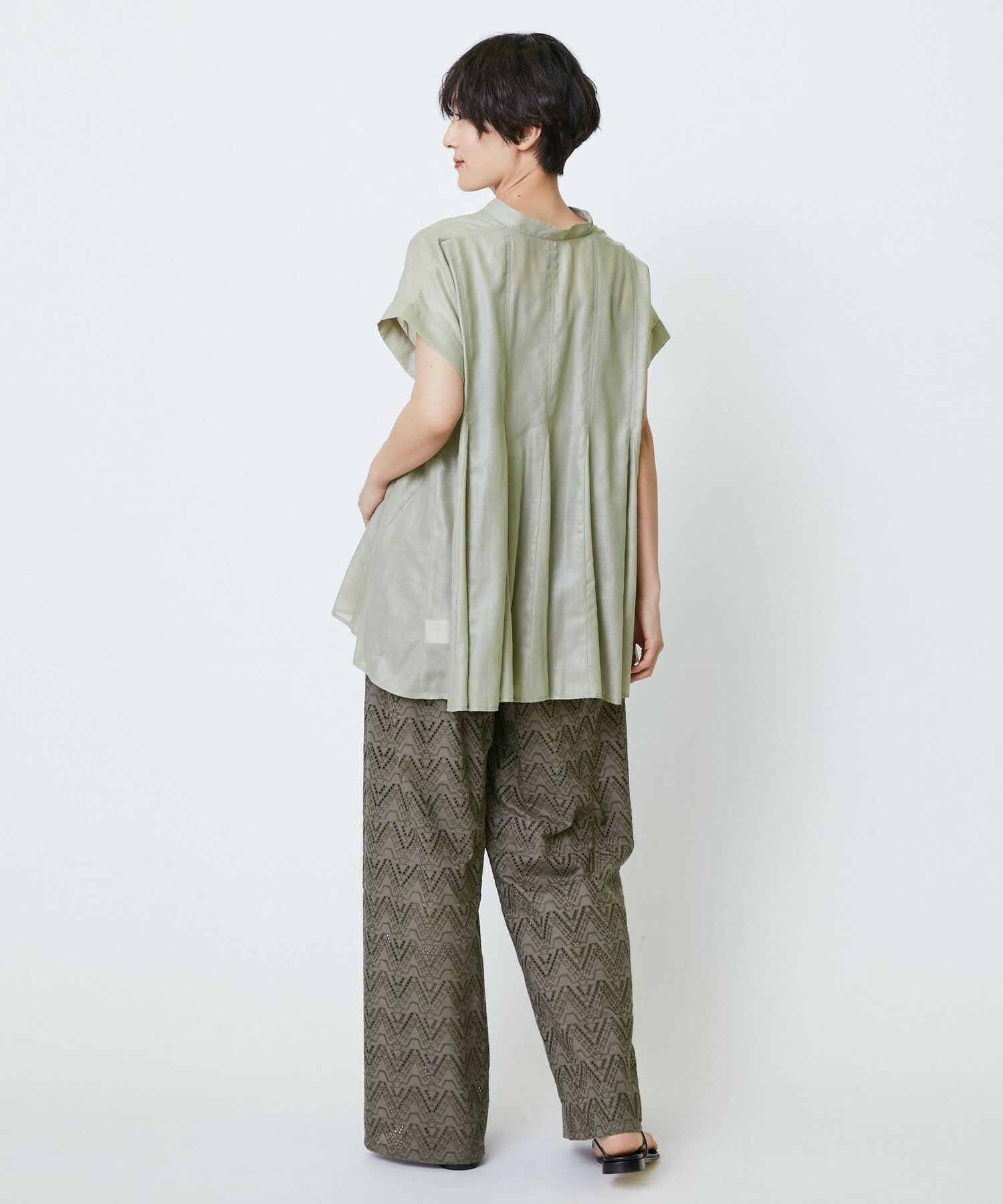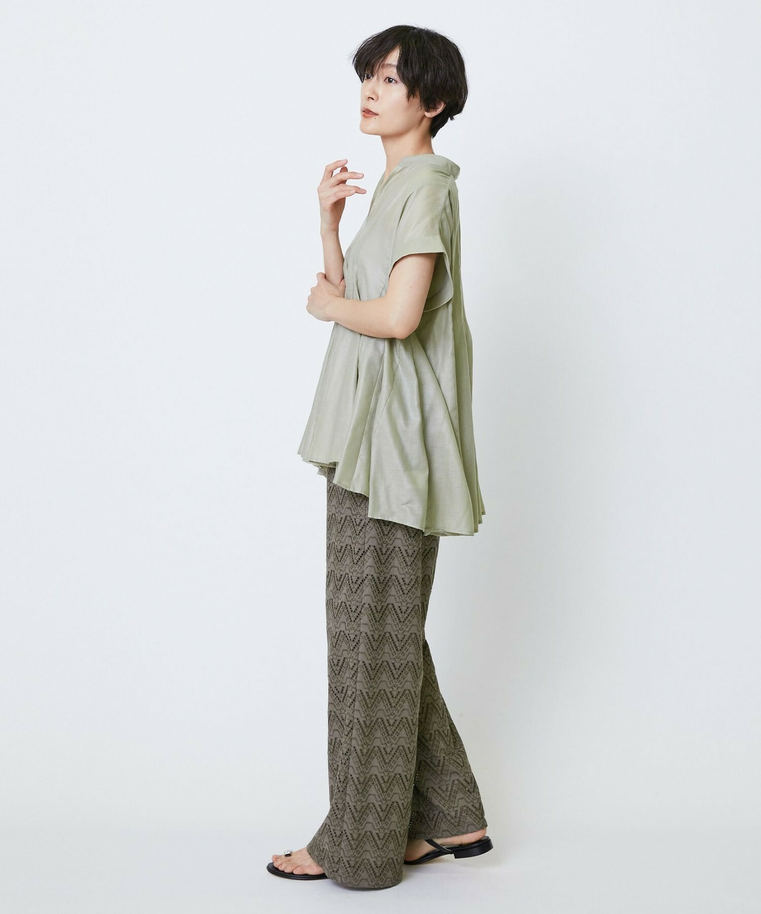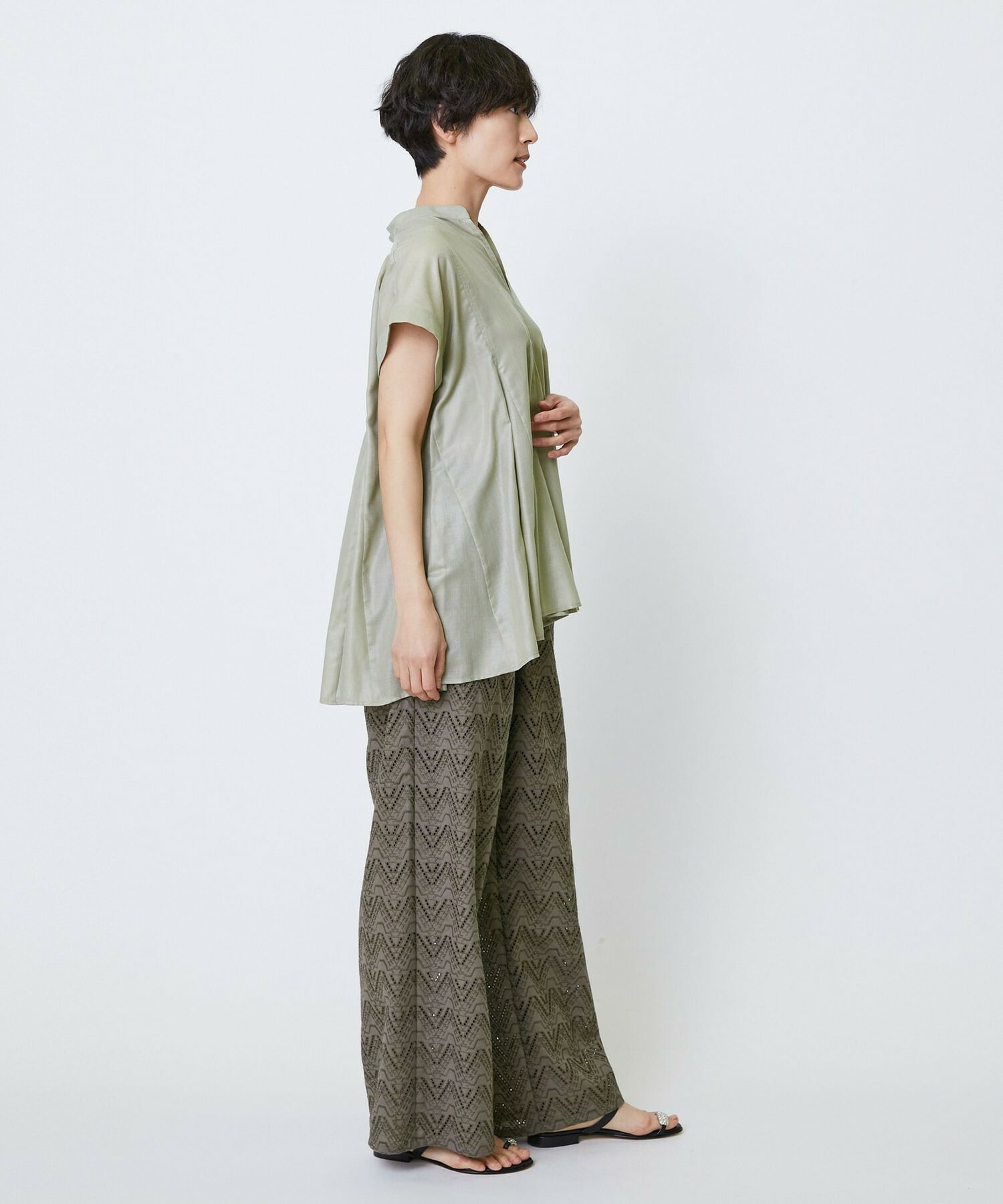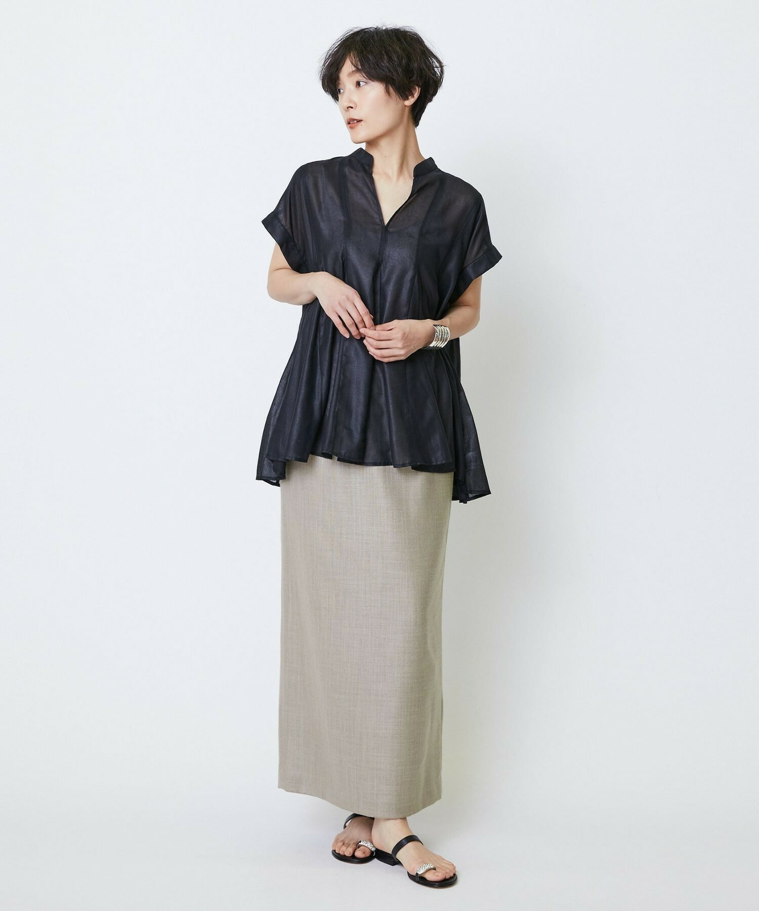 切り替えをふんだんに入れてドラマティックなシルエットを出したブラウス。生地が軽く落ち感があるのでボリュームがあってもおさまりが良く、動いたときにひらひらと表情が出て気分が上がります!夏に涼しく着られて着映えするブラウスです。