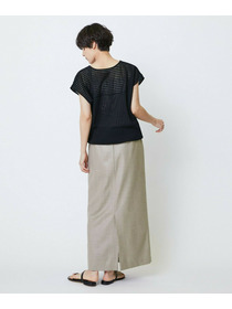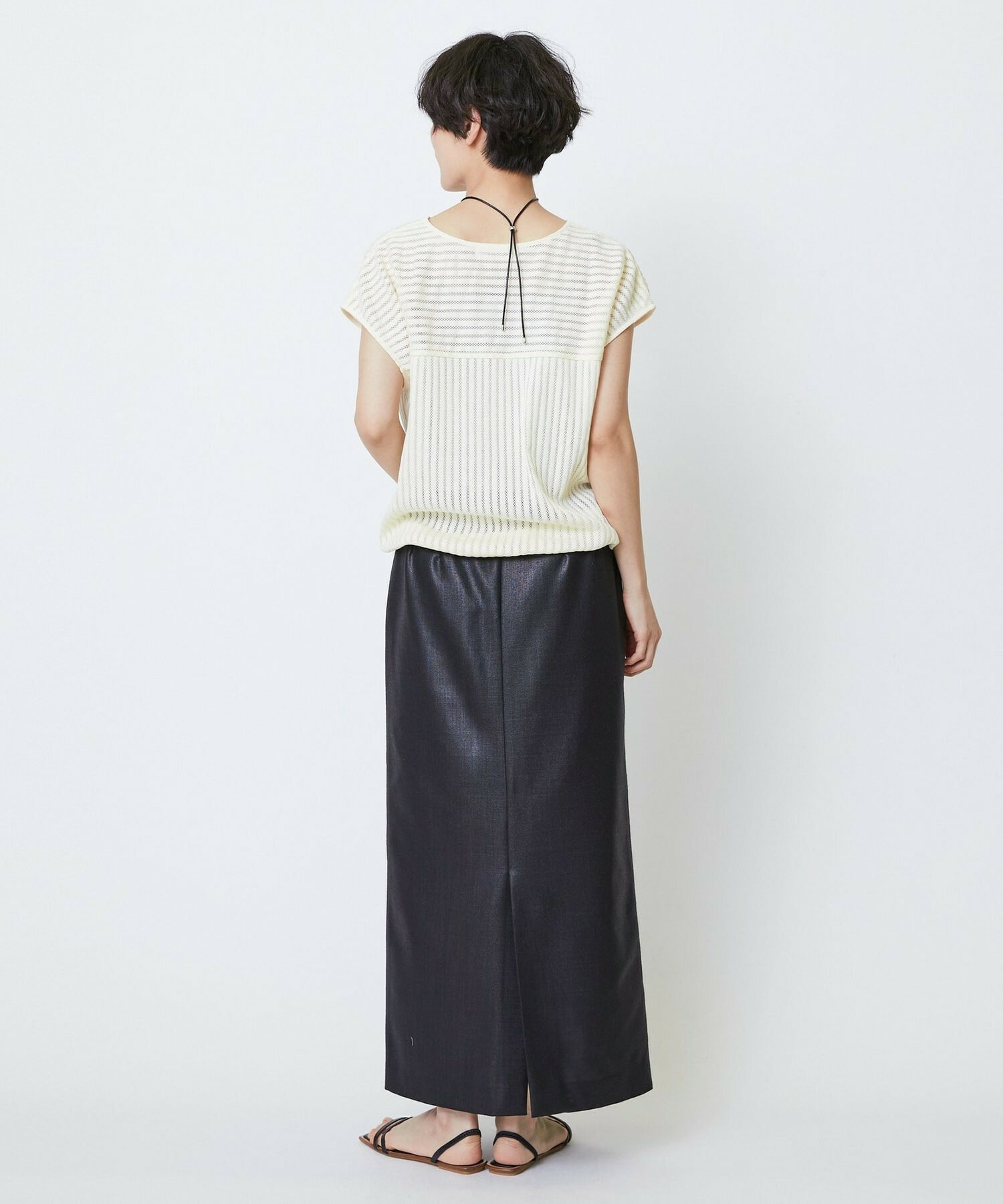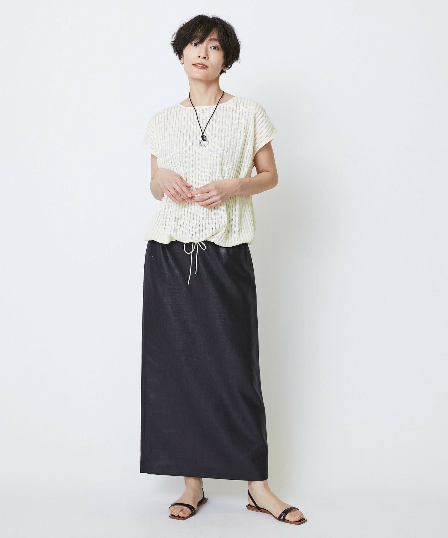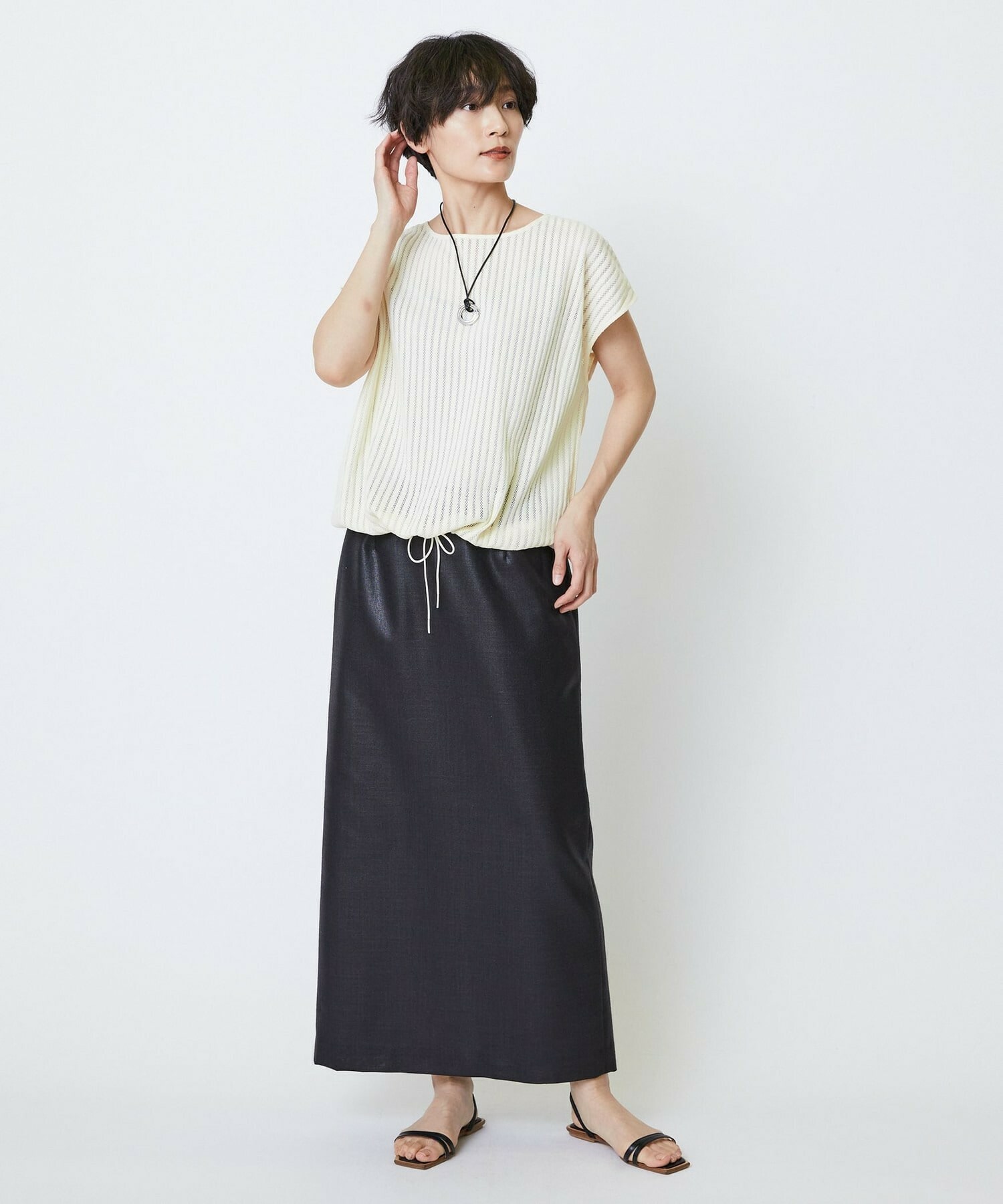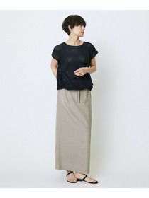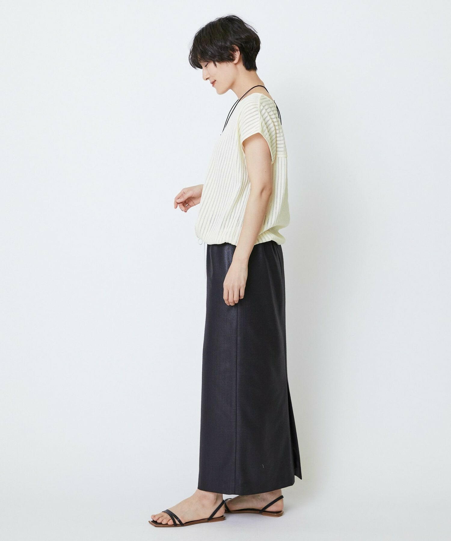 ラッセルメッシュストライプのトップスと好相性のシンプルなマキシタイトスカート。ウエストベルトを異素材にしただけのシンプルなデザイン。なんといっても素材感が特徴。ナチュラル感がありながら大人な表情のあるとても新鮮な素材です。
