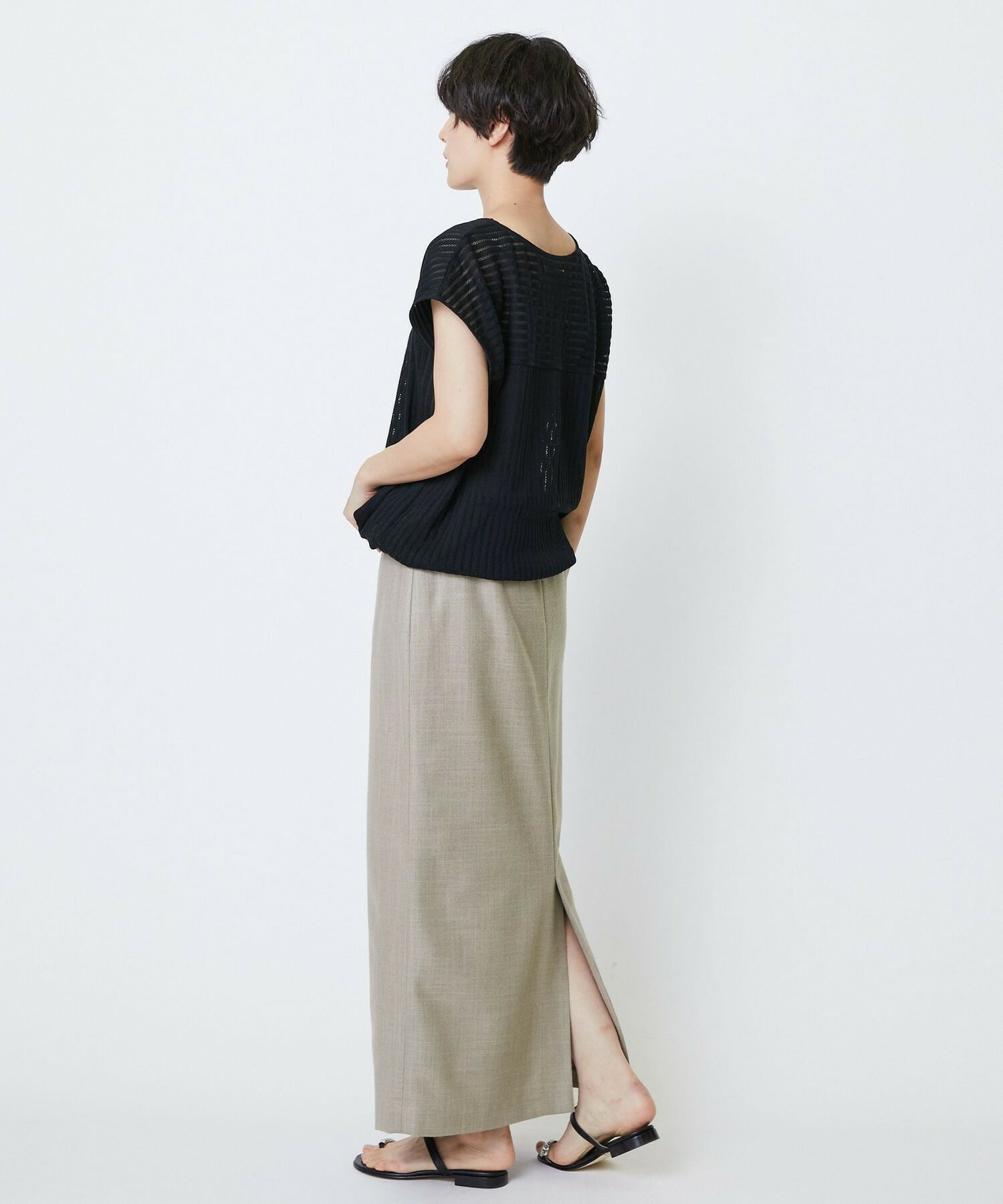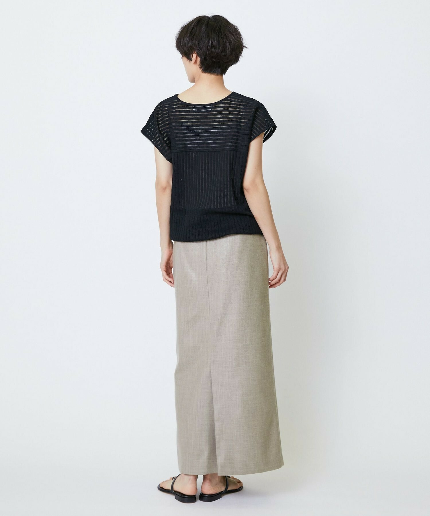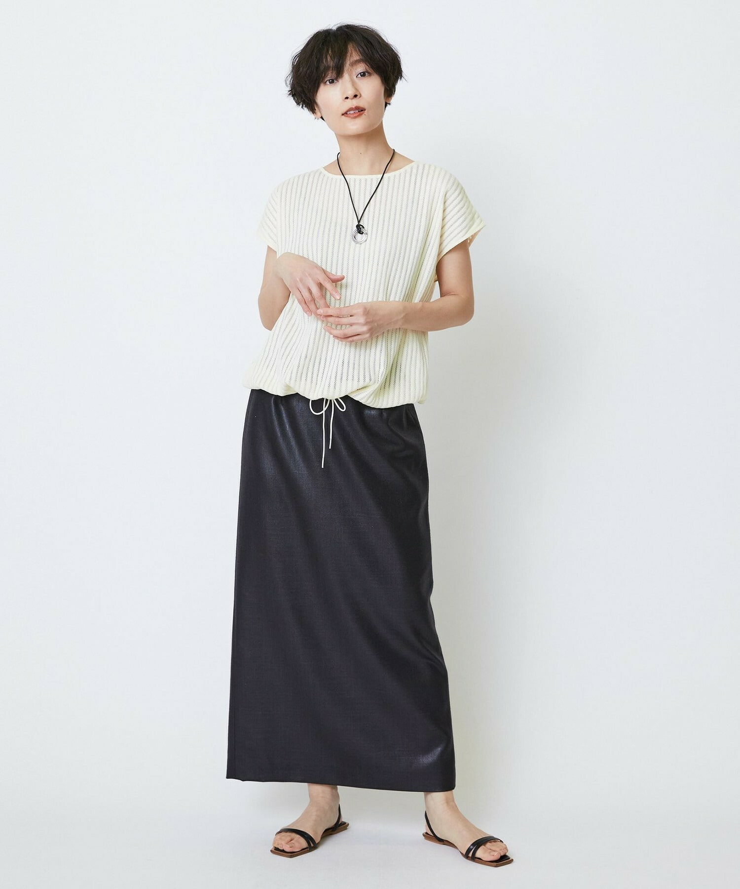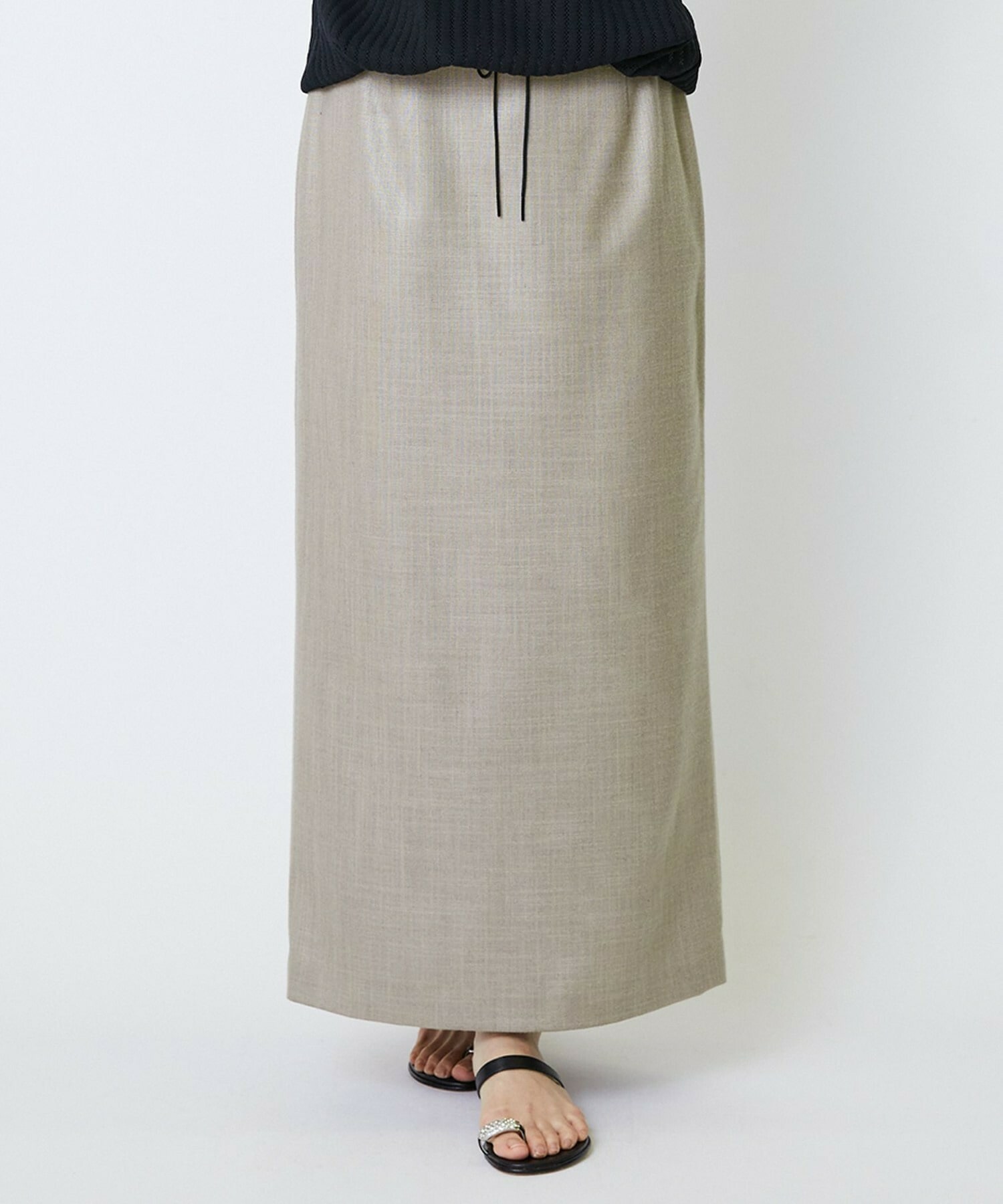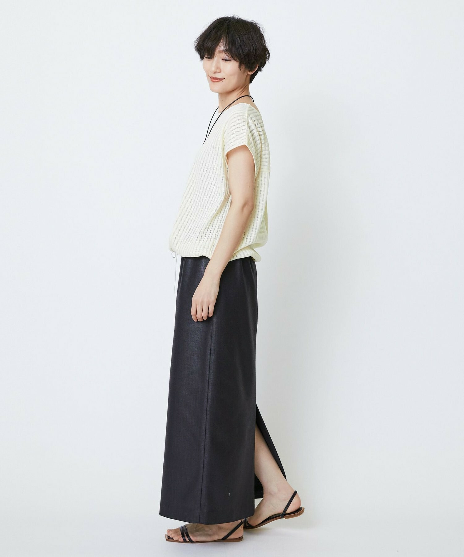 ラッセルメッシュストライプのトップスと好相性のシンプルなマキシタイトスカート。ウエストベルトを異素材にしただけのシンプルなデザイン。なんといっても素材感が特徴。ナチュラル感がありながら大人な表情のあるとても新鮮な素材です。