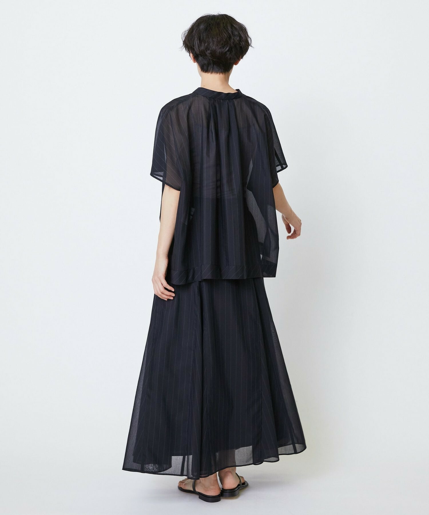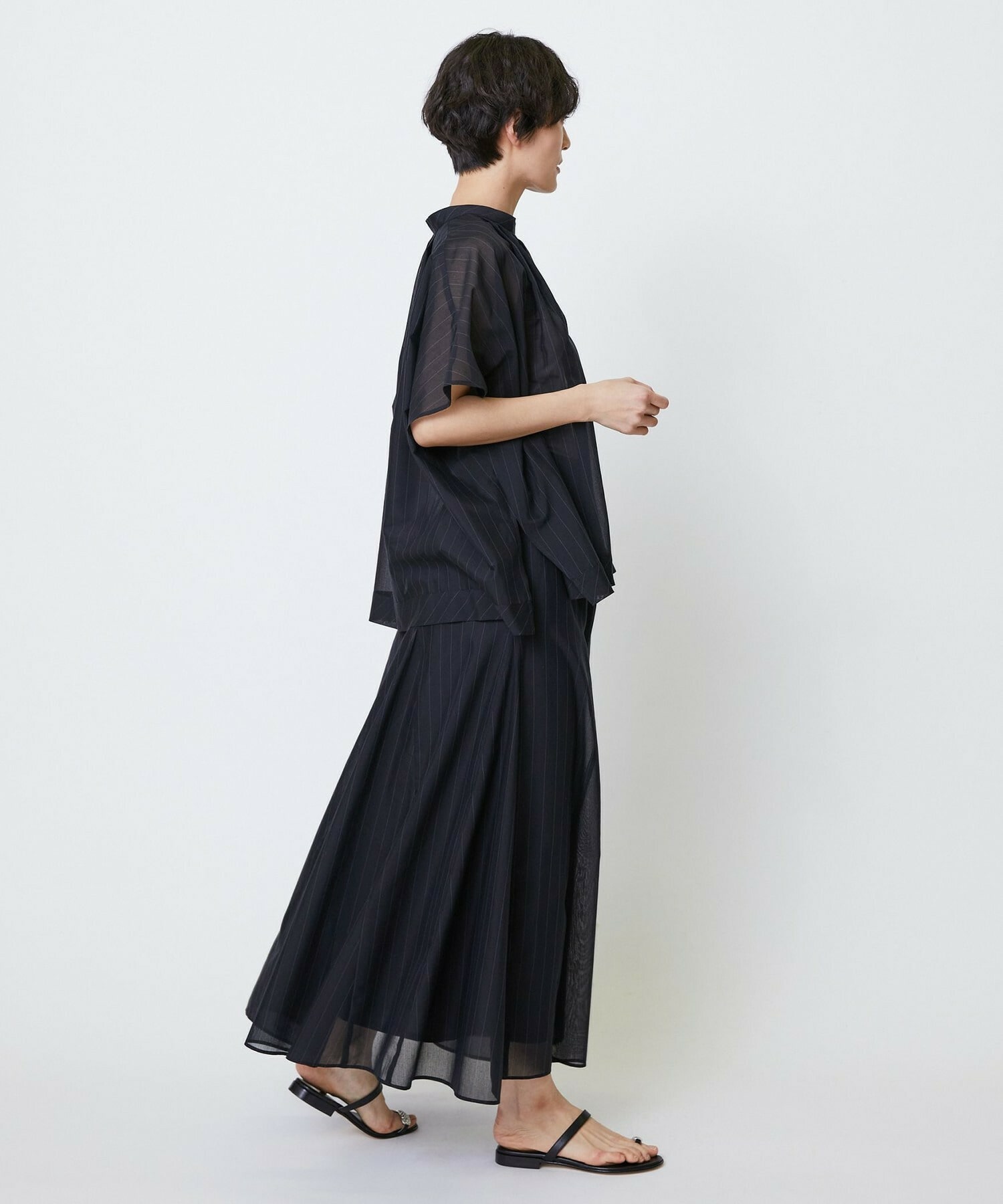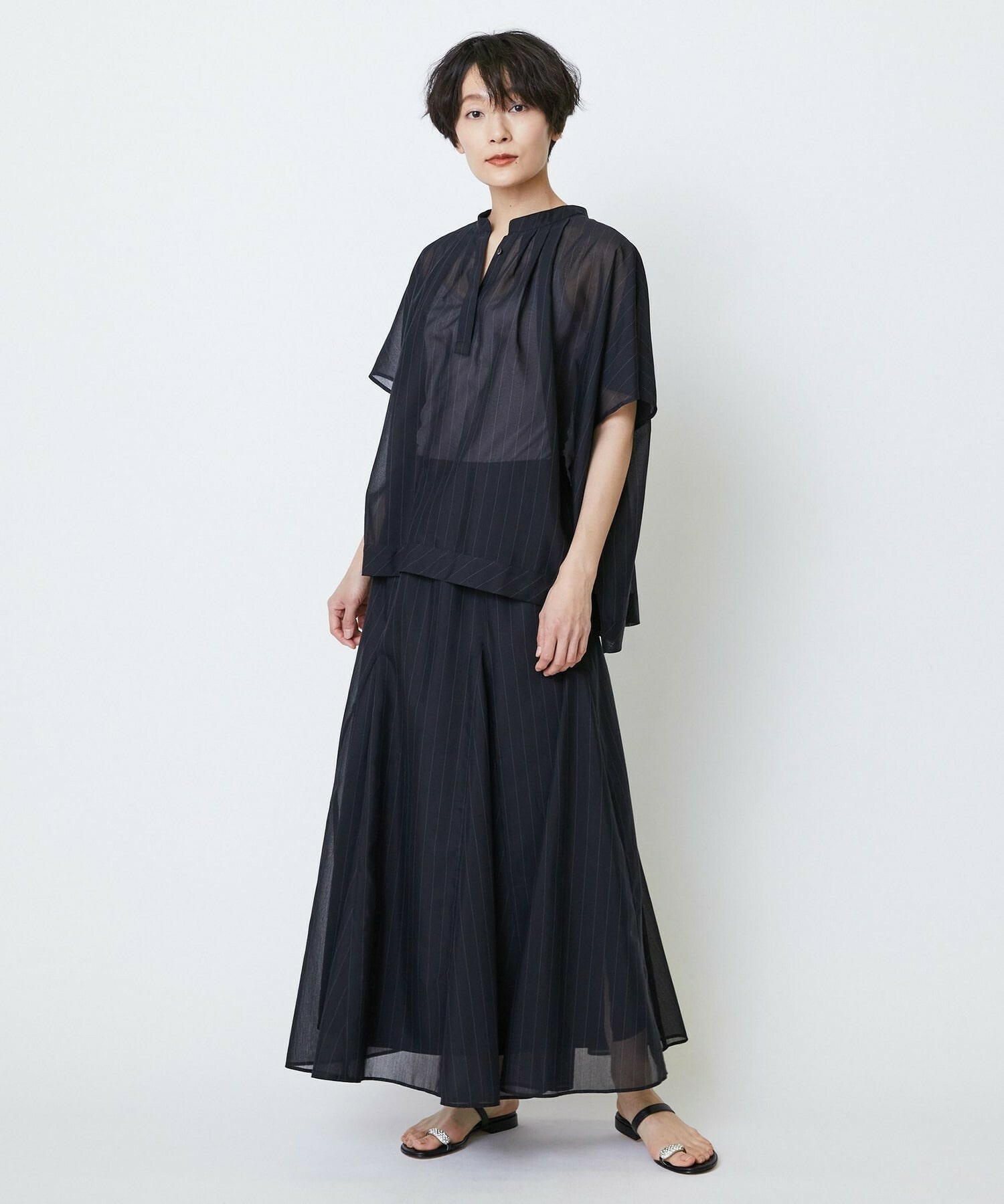 シャリみのあるポリエステル混のボイル素材。透け感のある軽い素材。あえてメンズライクなピンストライプ柄なのが新鮮です。