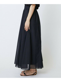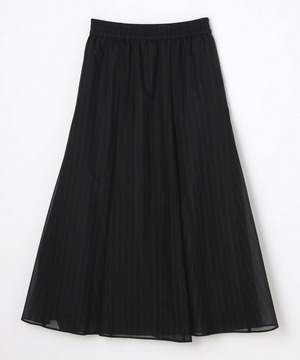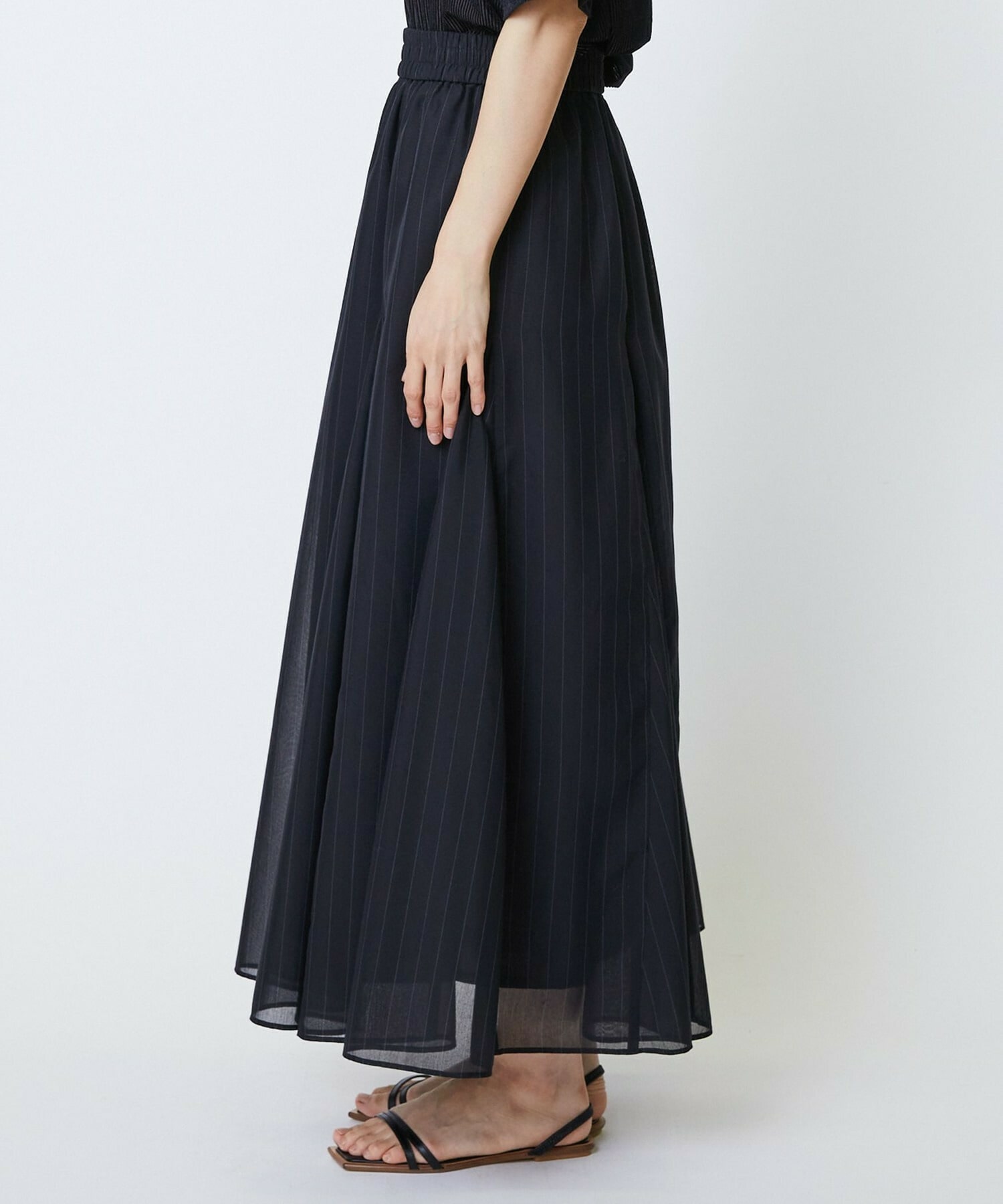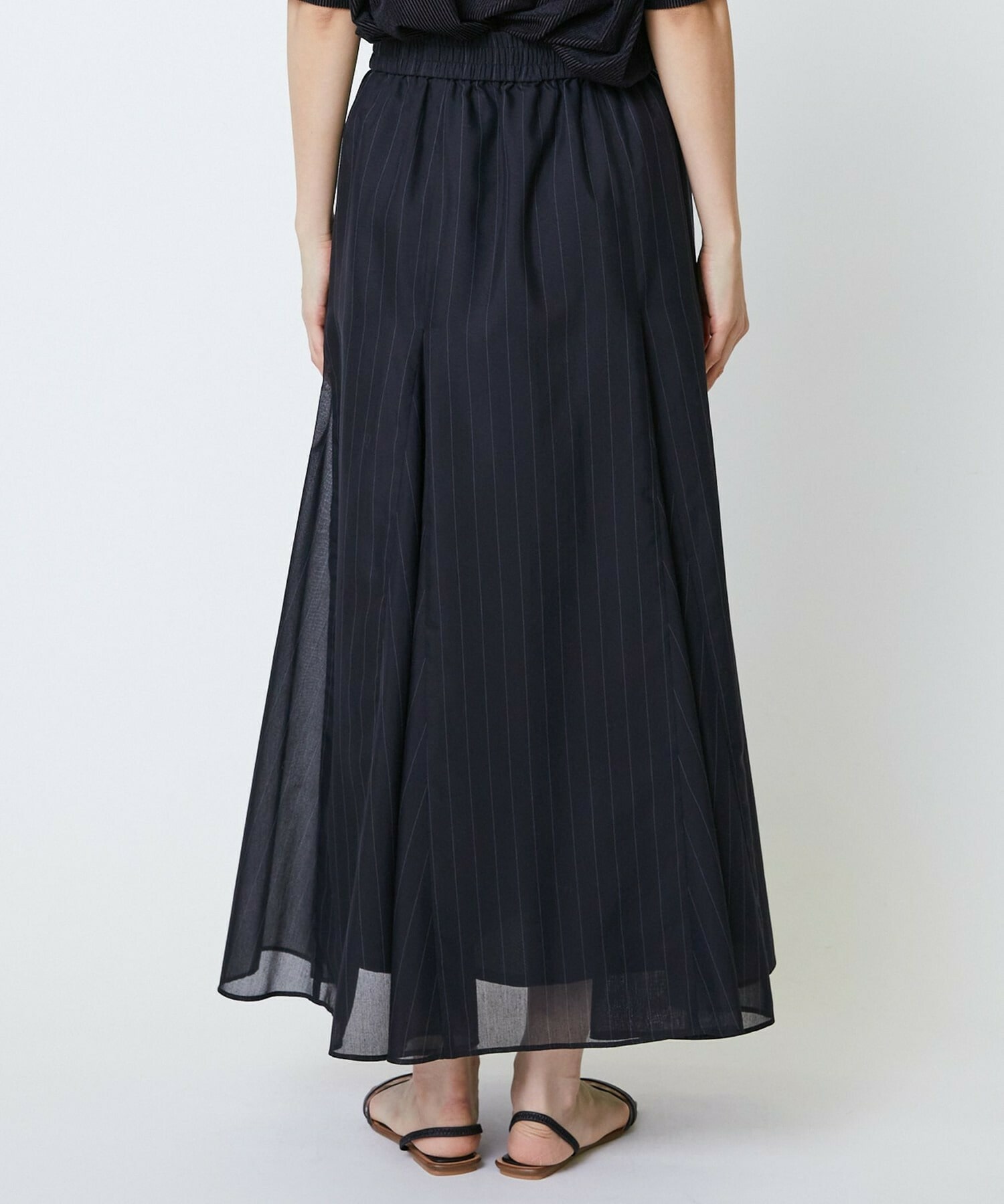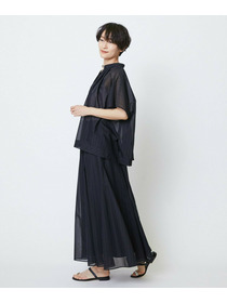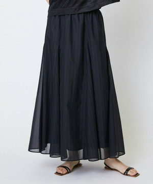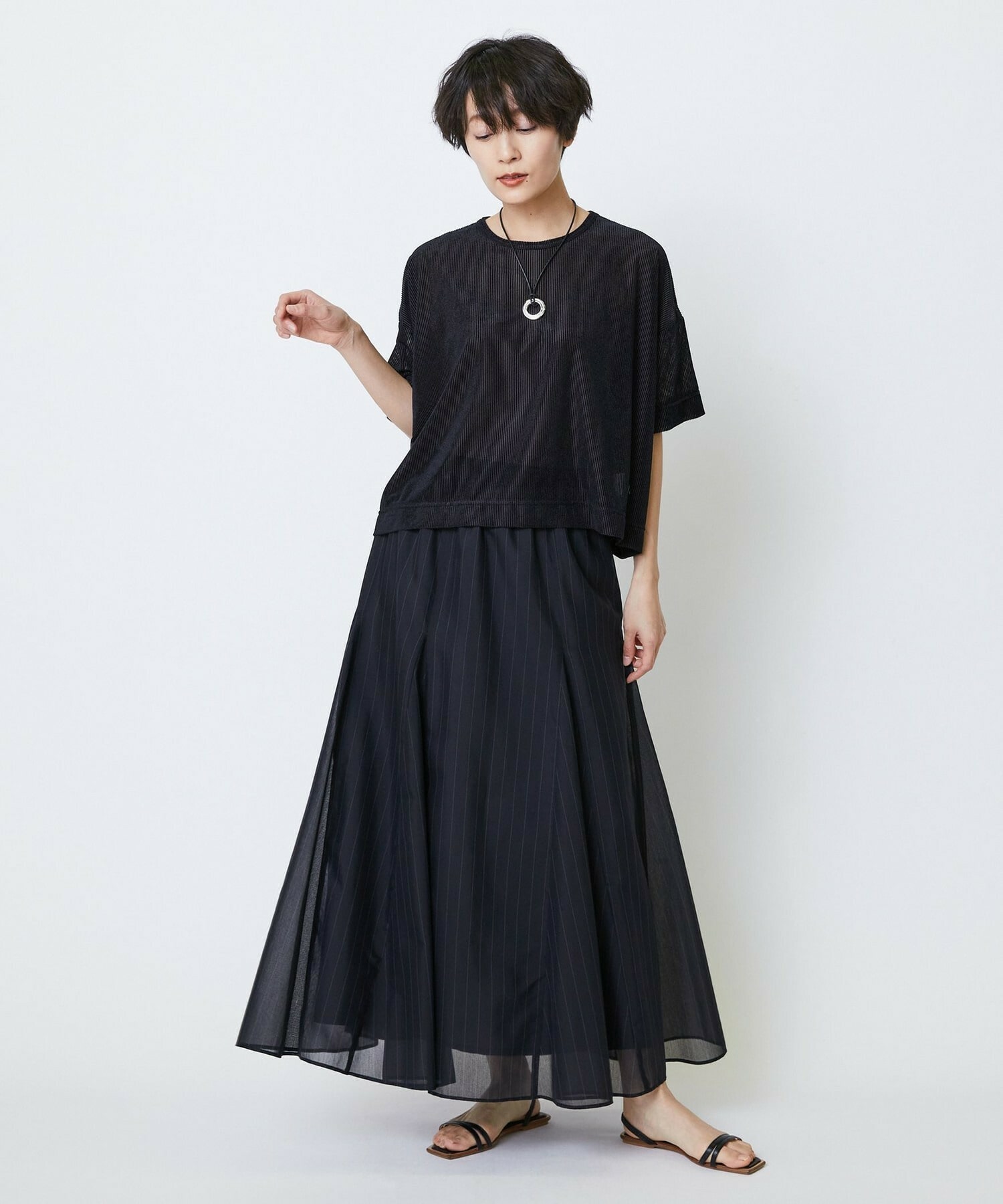 シャリみのあるポリエステル混のボイル素材。透け感のある軽い素材。あえてメンズライクなピンストライプ柄なのが新鮮です。