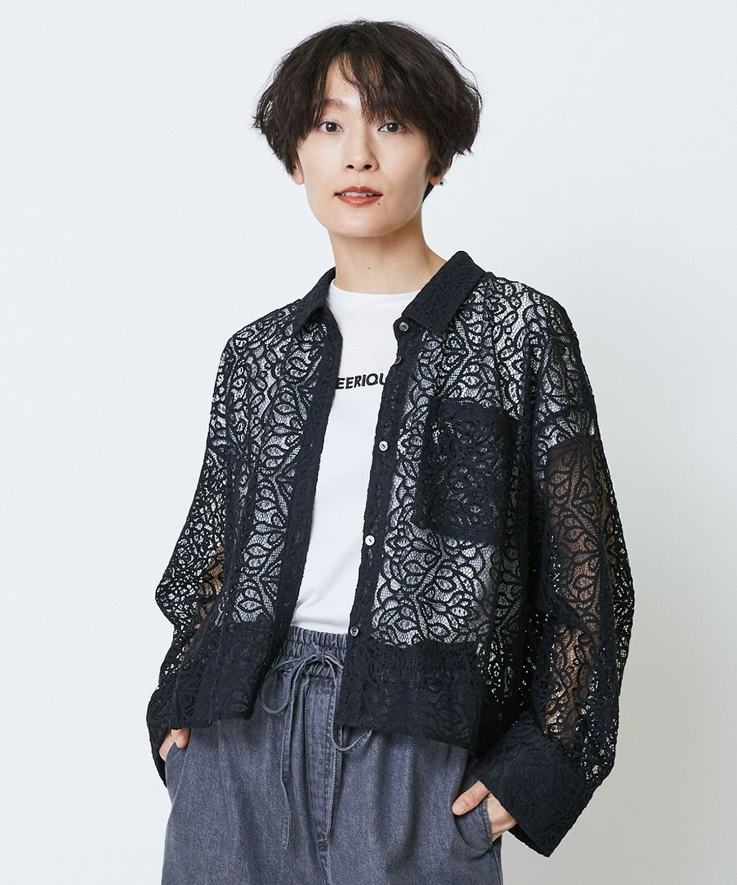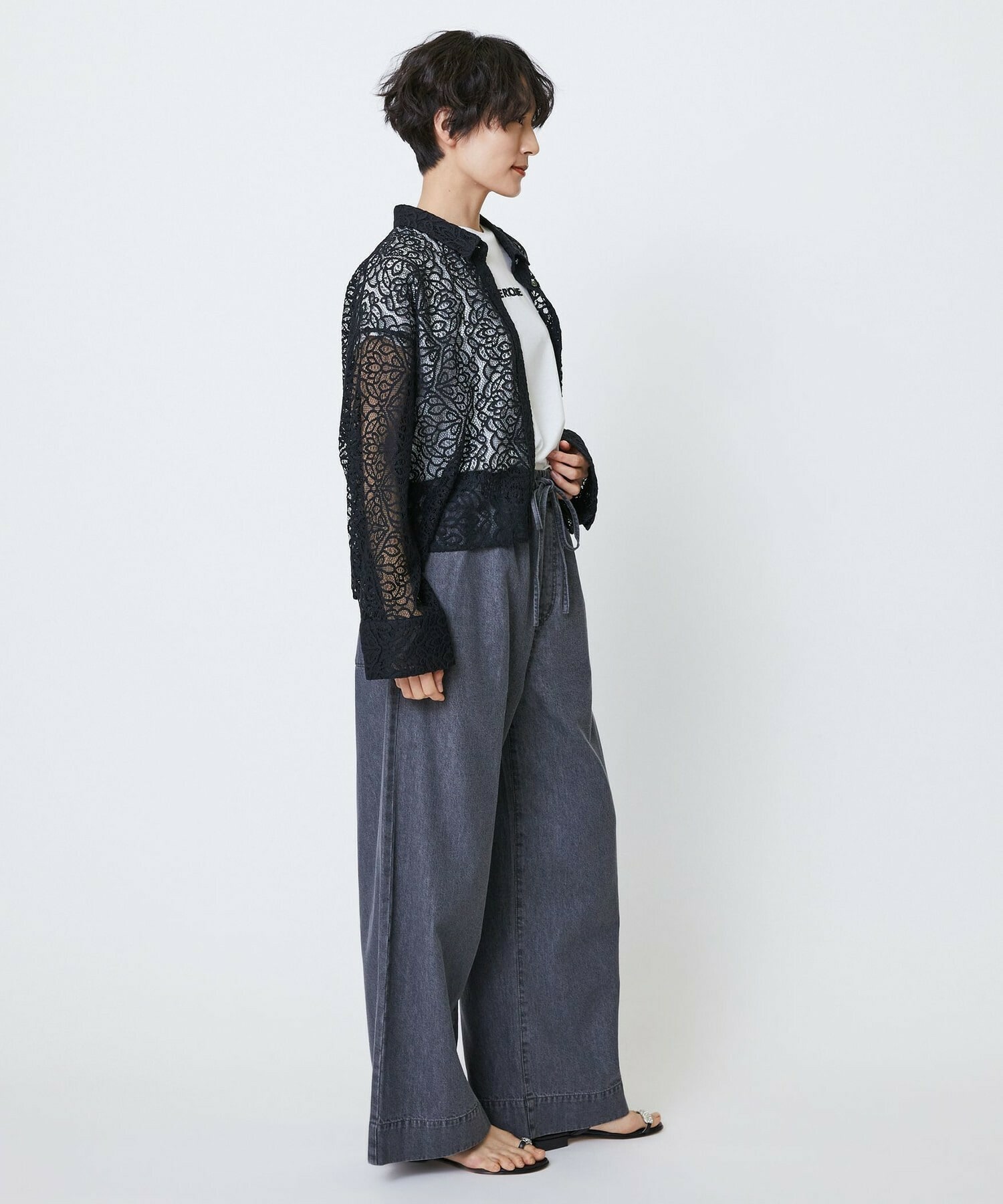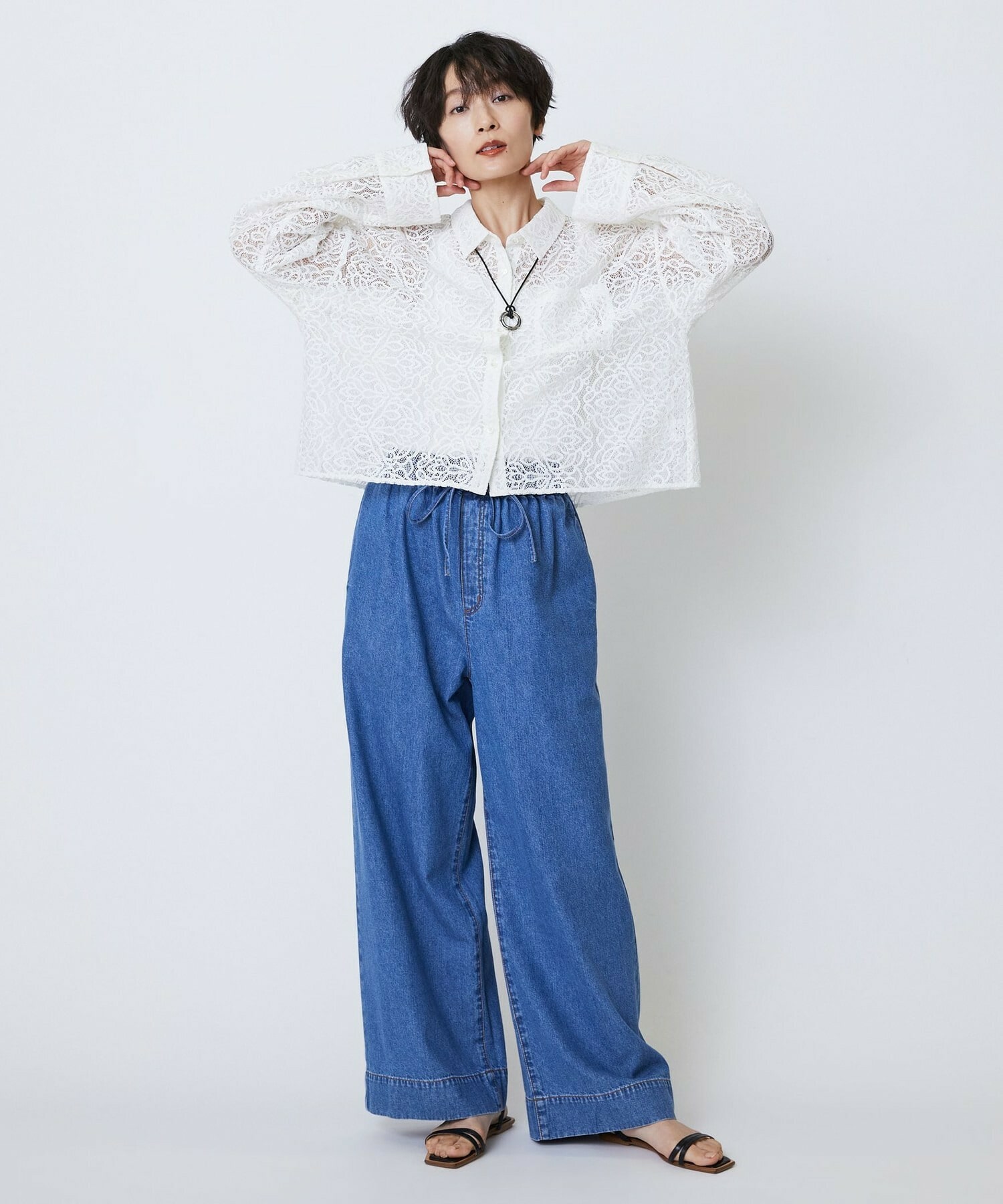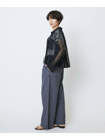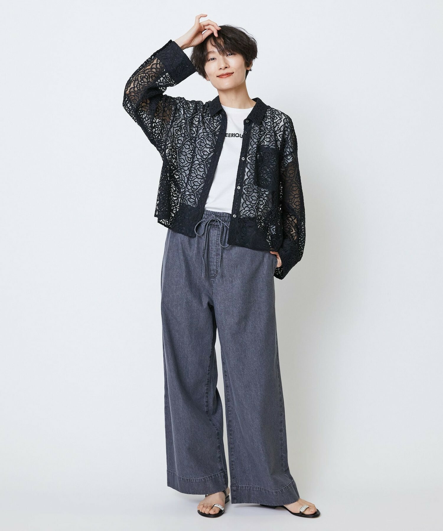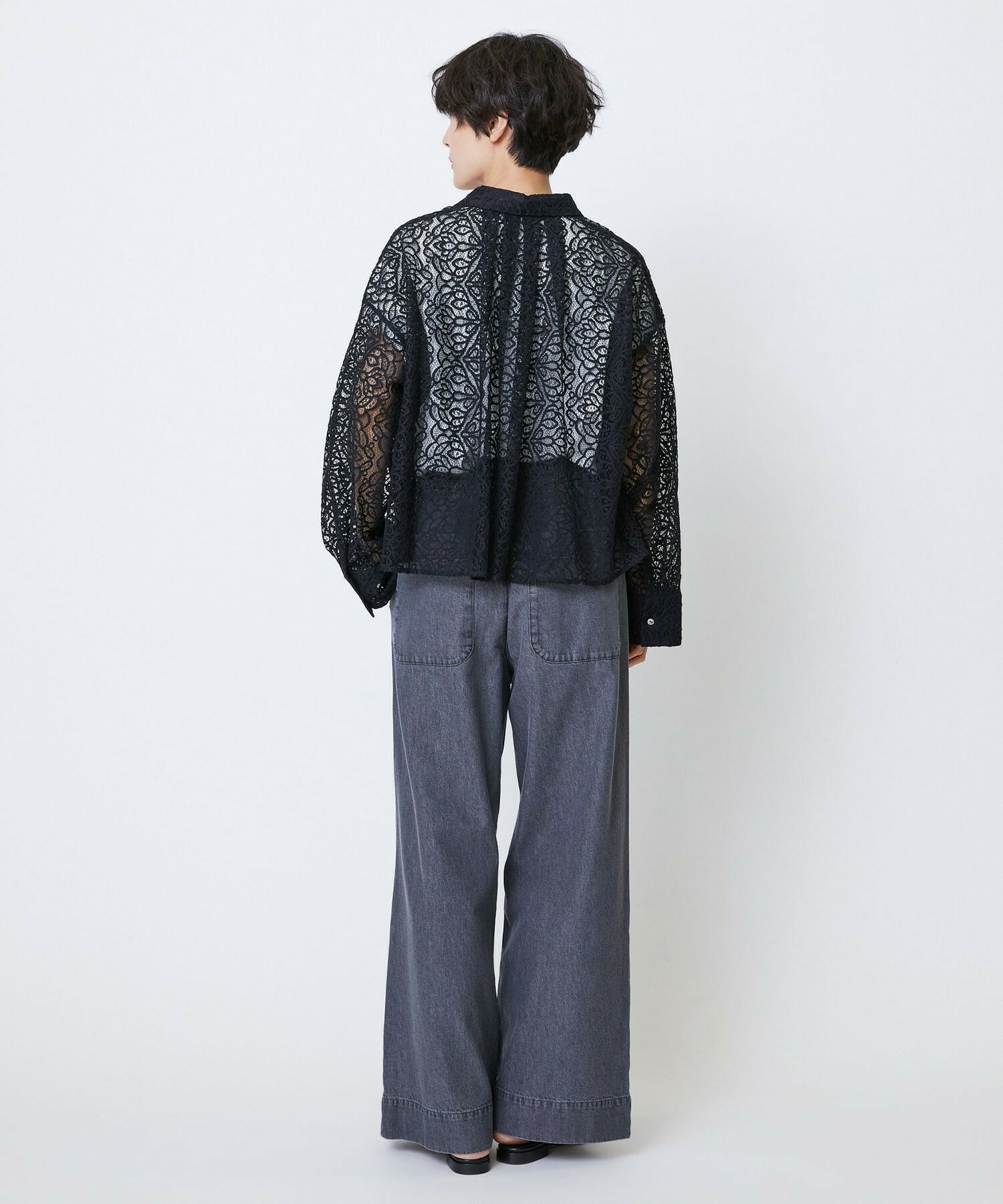 レースシャツを短丈にしてカジュアル感を出し、バランスを取りやすくしています。後身はタック仕様で少し広がるシルエット。短丈なのでワイドパンツとバランス◎です。涼しく着られるので真夏の羽織としても重宝します。