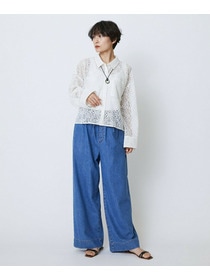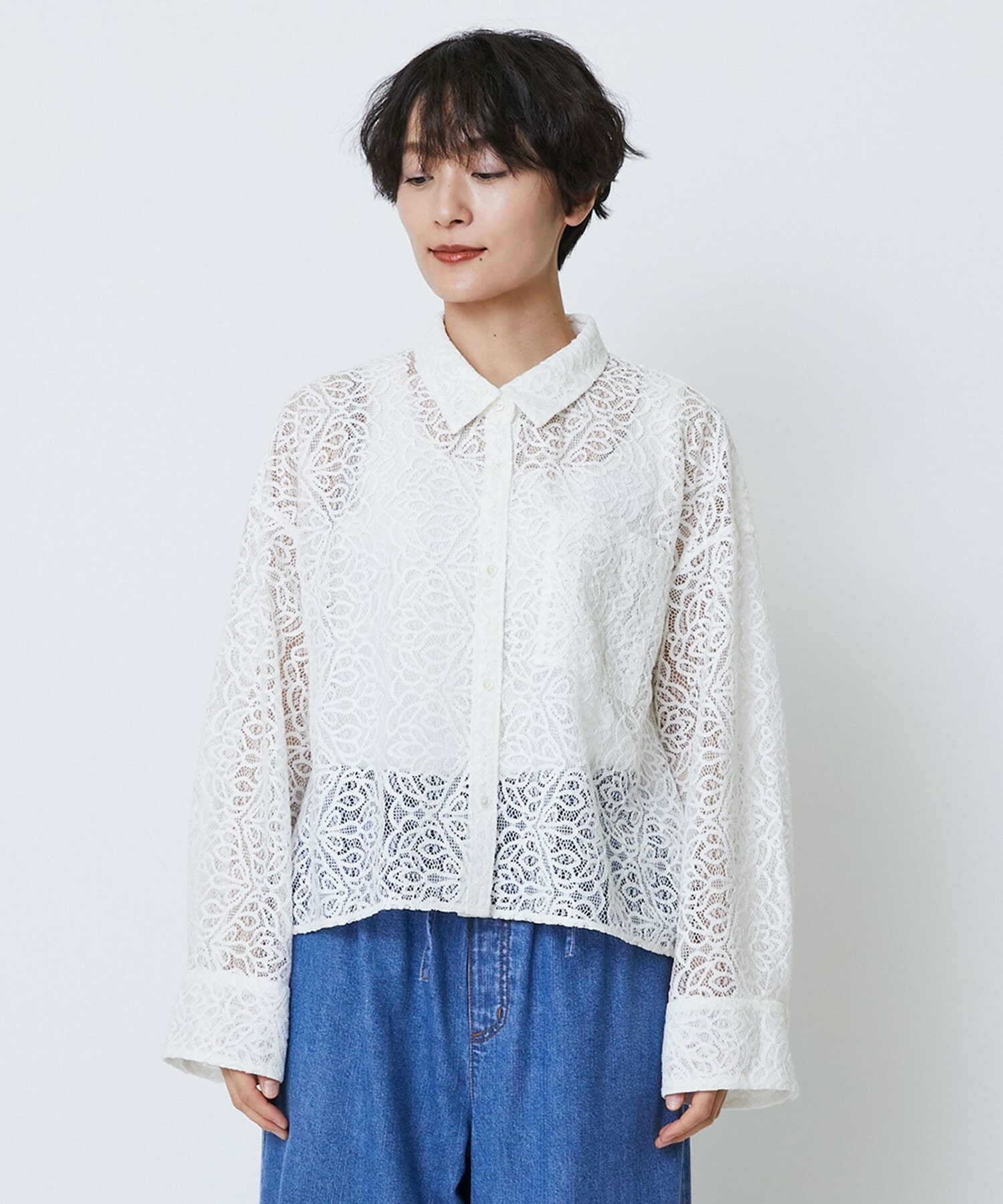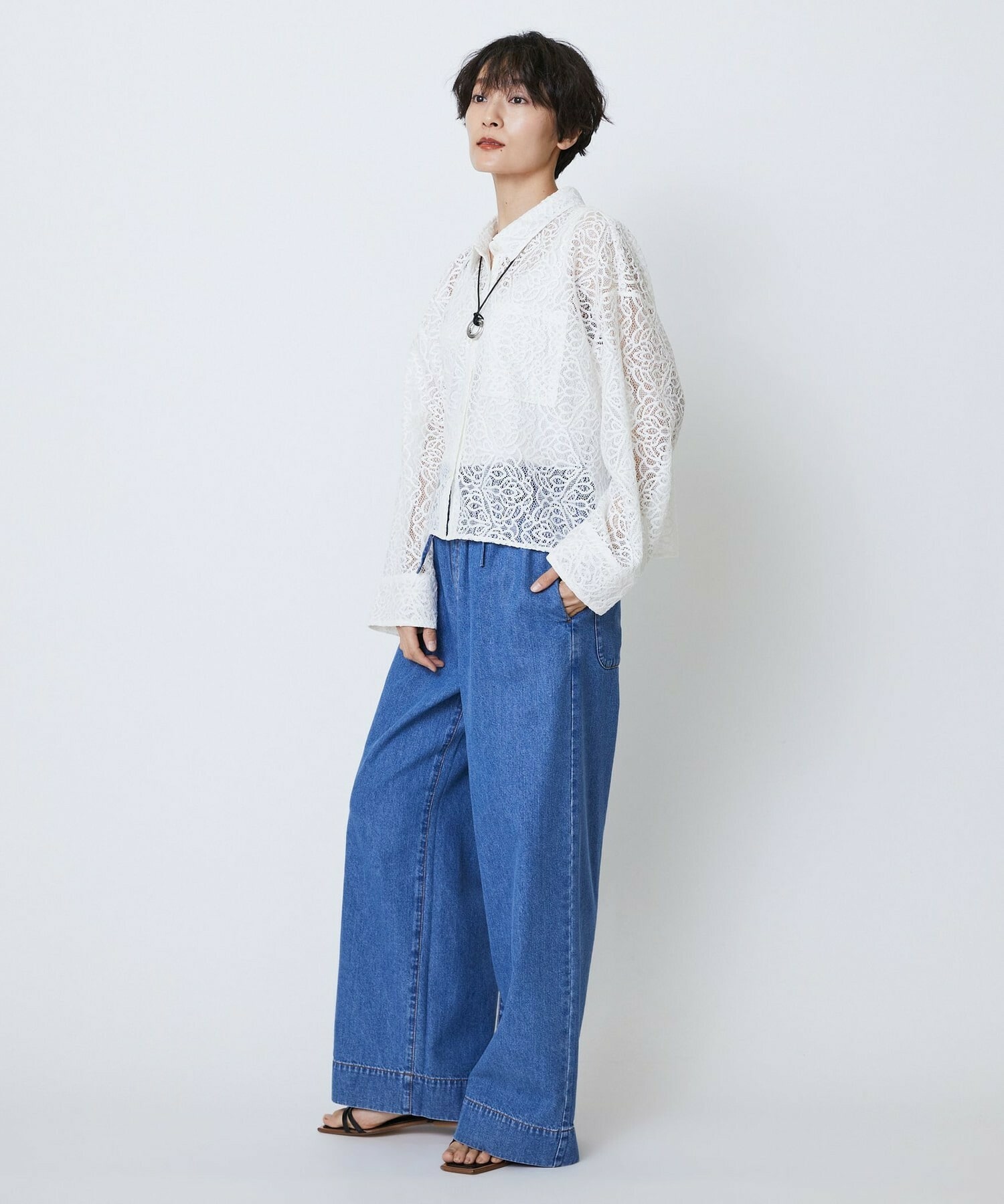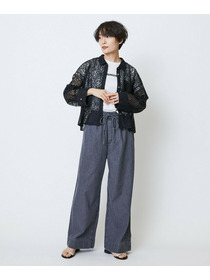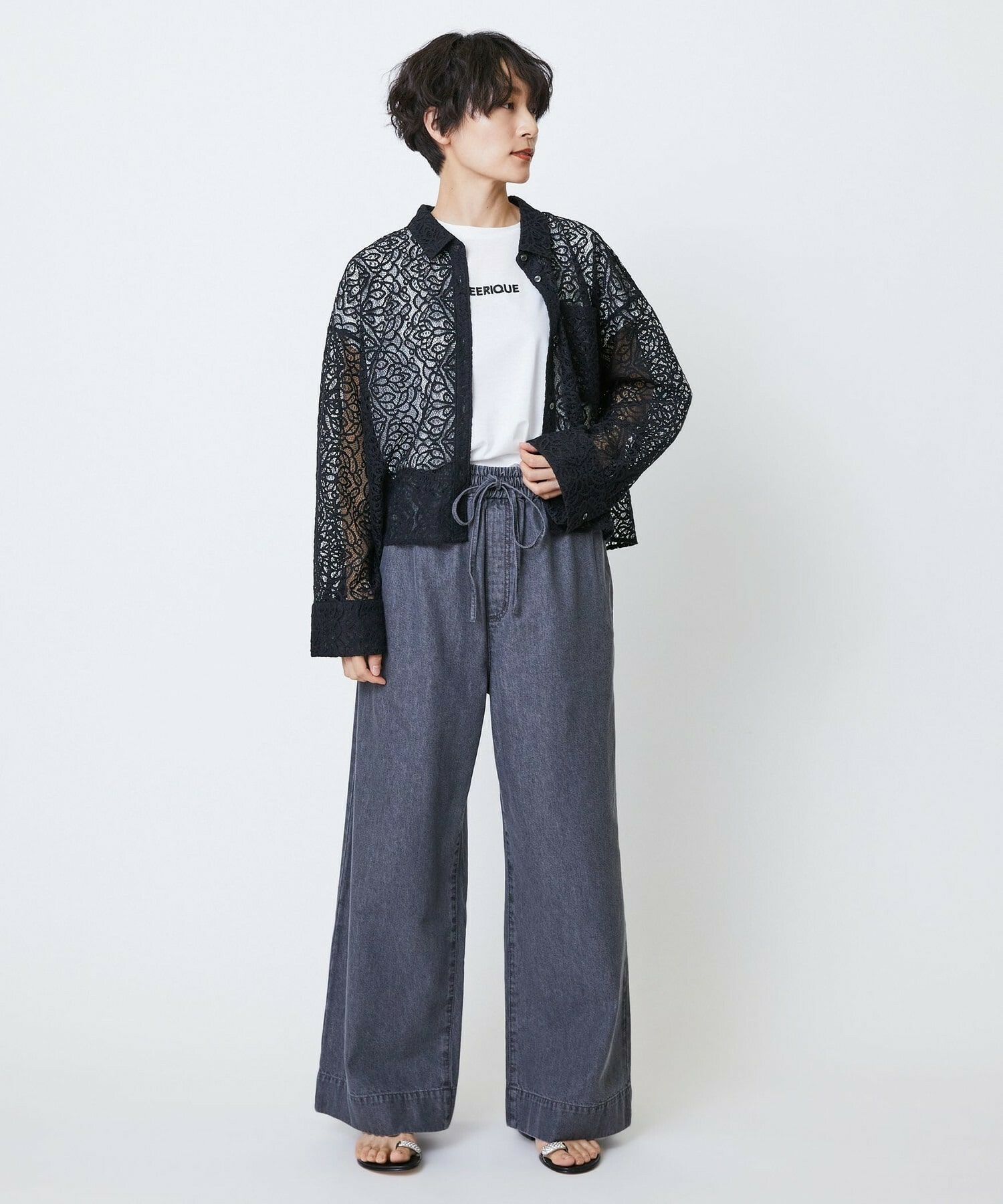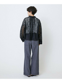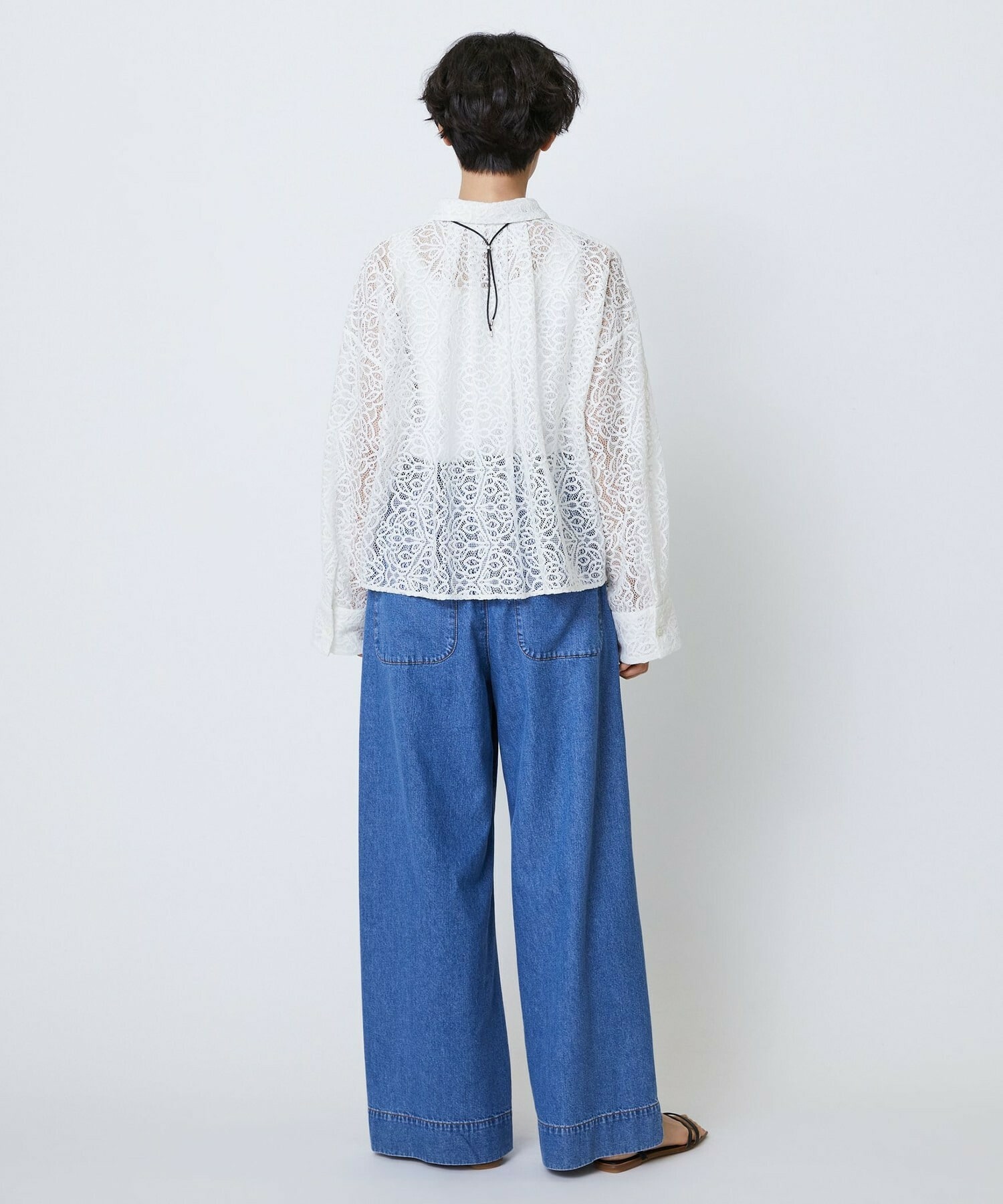 レースシャツを短丈にしてカジュアル感を出し、バランスを取りやすくしています。後身はタック仕様で少し広がるシルエット。短丈なのでワイドパンツとバランス◎です。涼しく着られるので真夏の羽織としても重宝します。