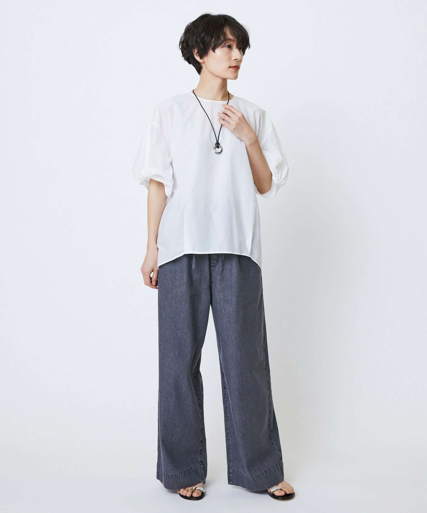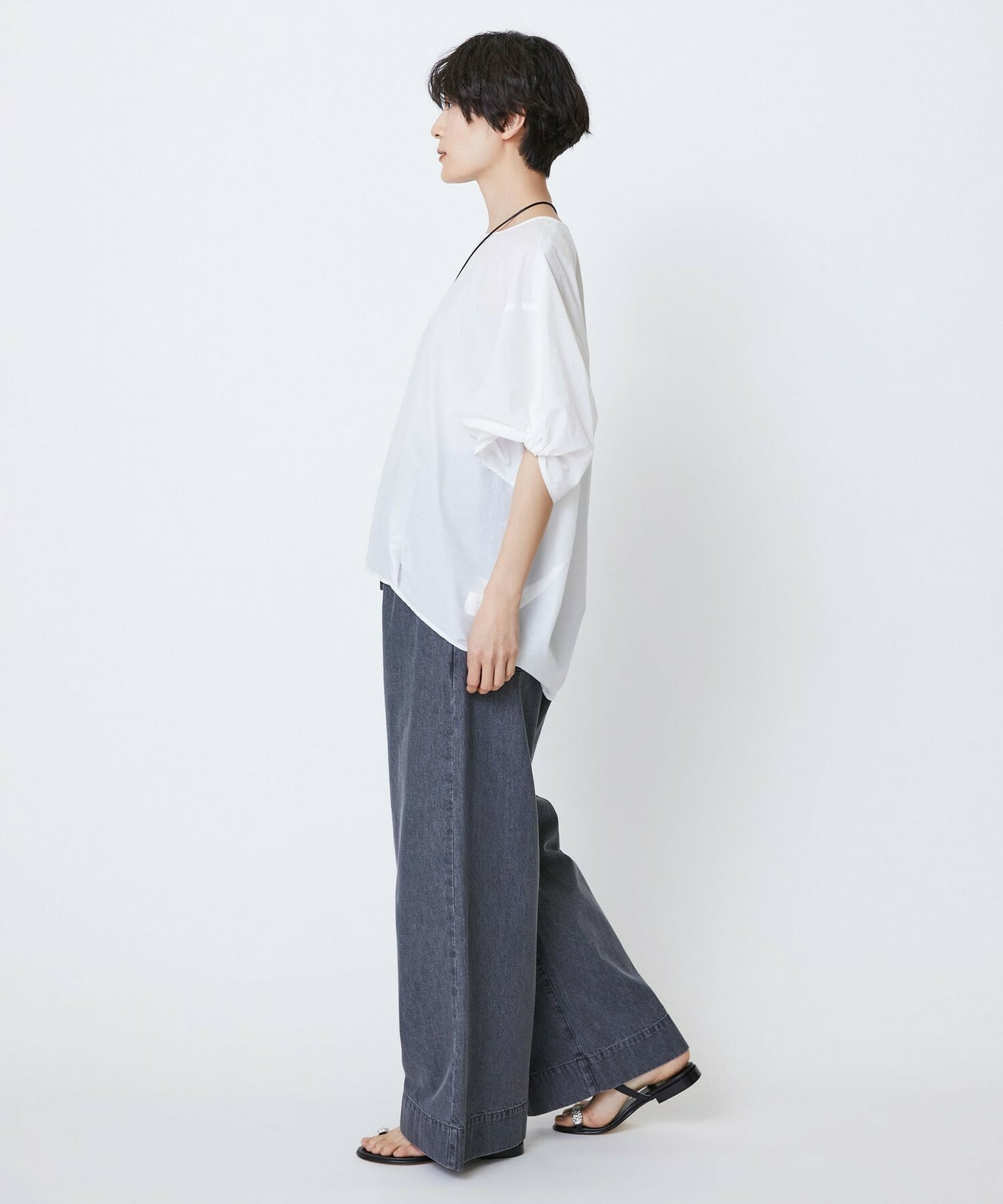 デニム素材をあえてイージー型で仕上げたパンツ。加工を入れてカジュアルな表情も加えたデニムなので、何にでも合わせやすいです!すらっとしたワイド型。薄手なので夏でも着やすく、定番の5PKデニム(B0246FFP191)のネクストとしておすすめです!