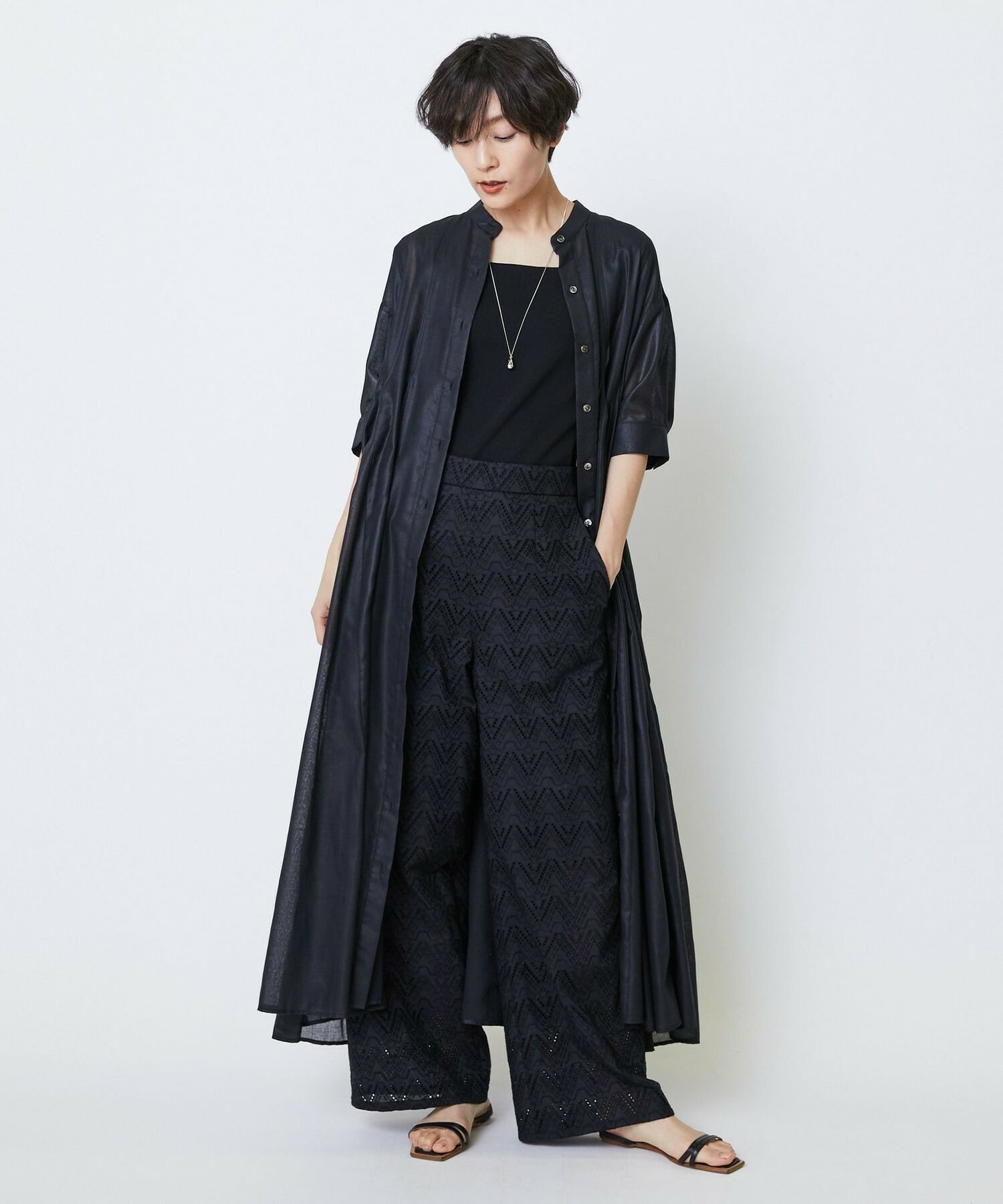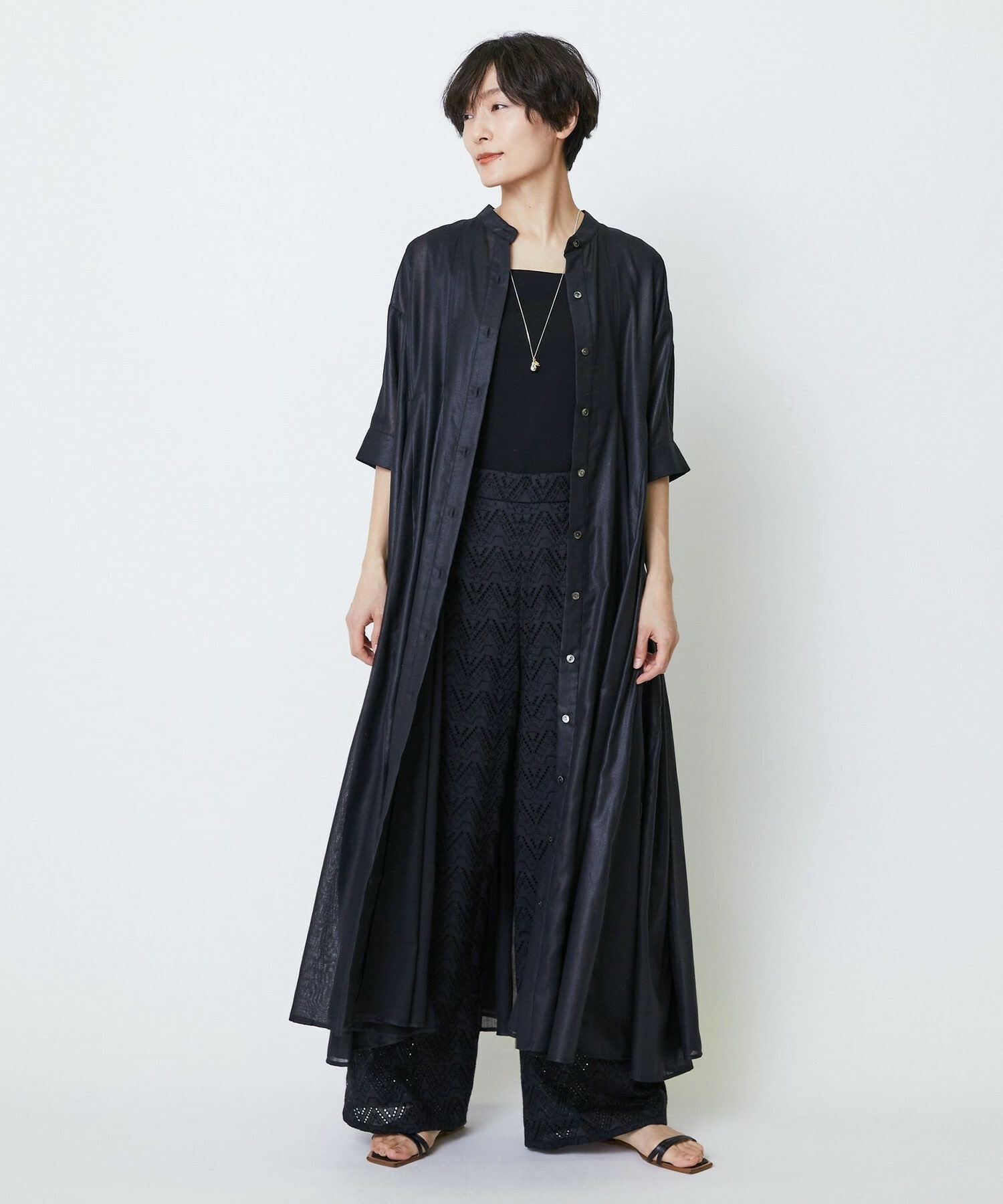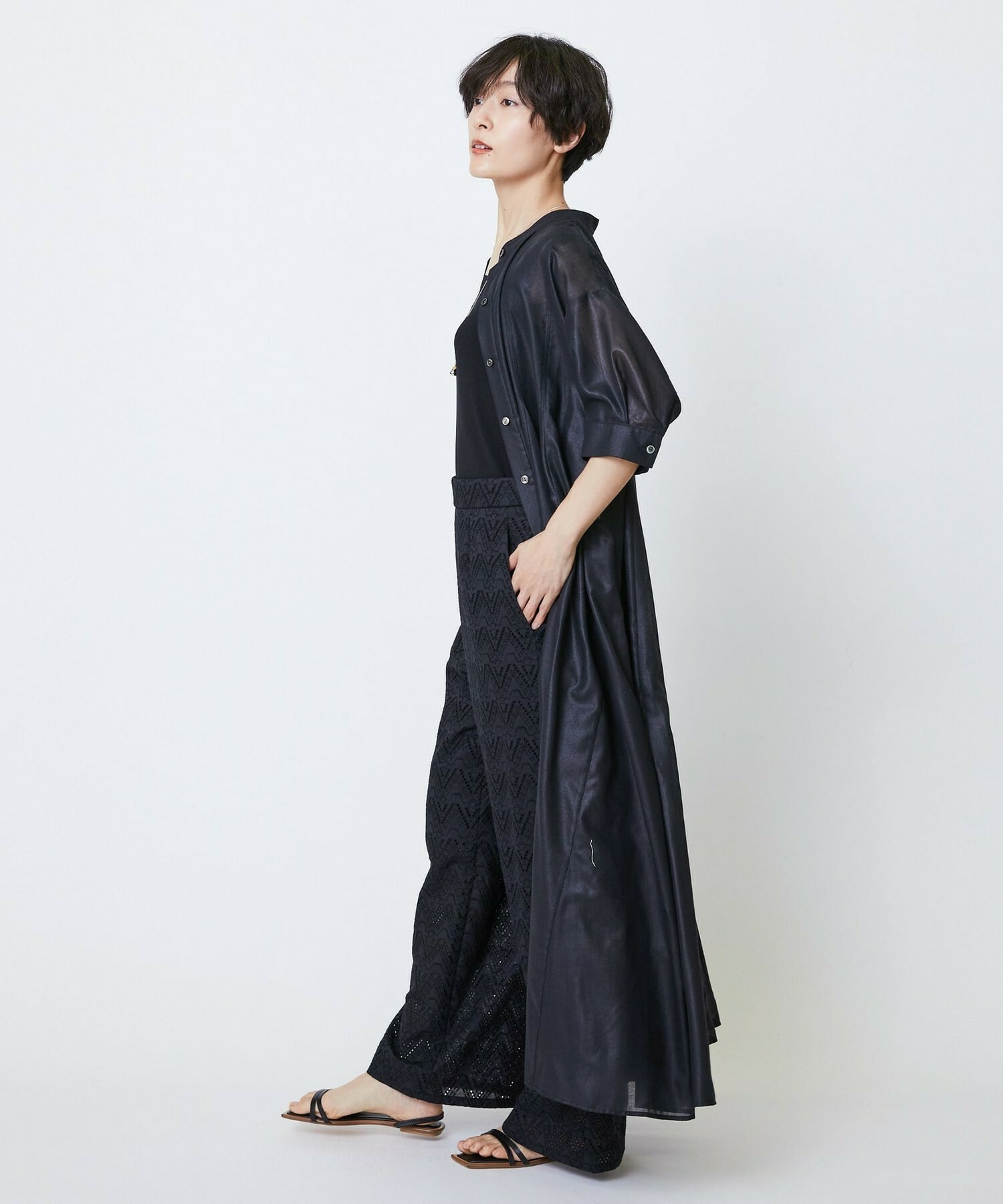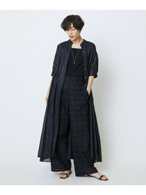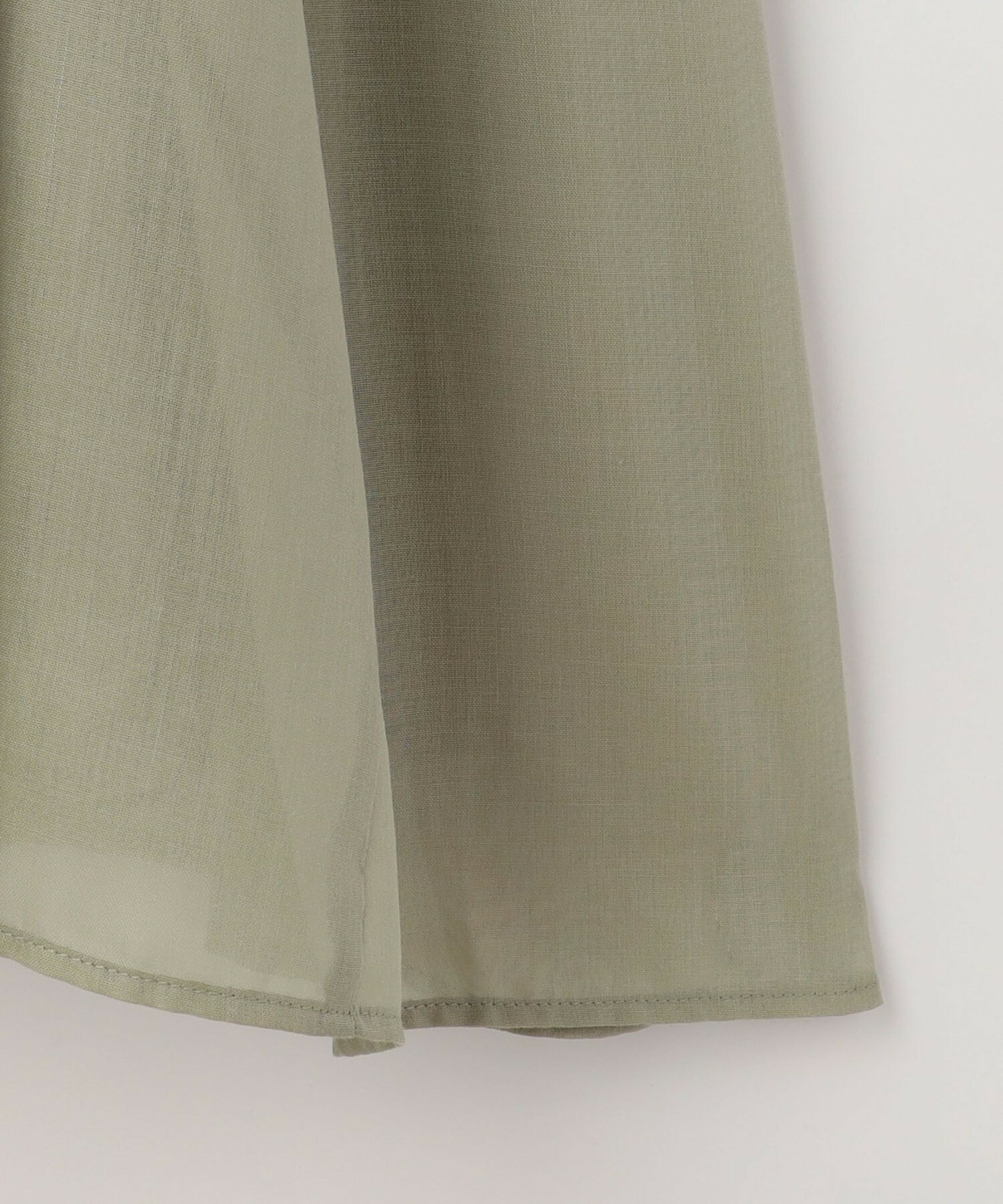 透け感のあるポリエステル100パーセントのボイル素材。手触りが柔らかく、落ち感のある体になじむ素材。分量の割には重さの気にならない素材です。