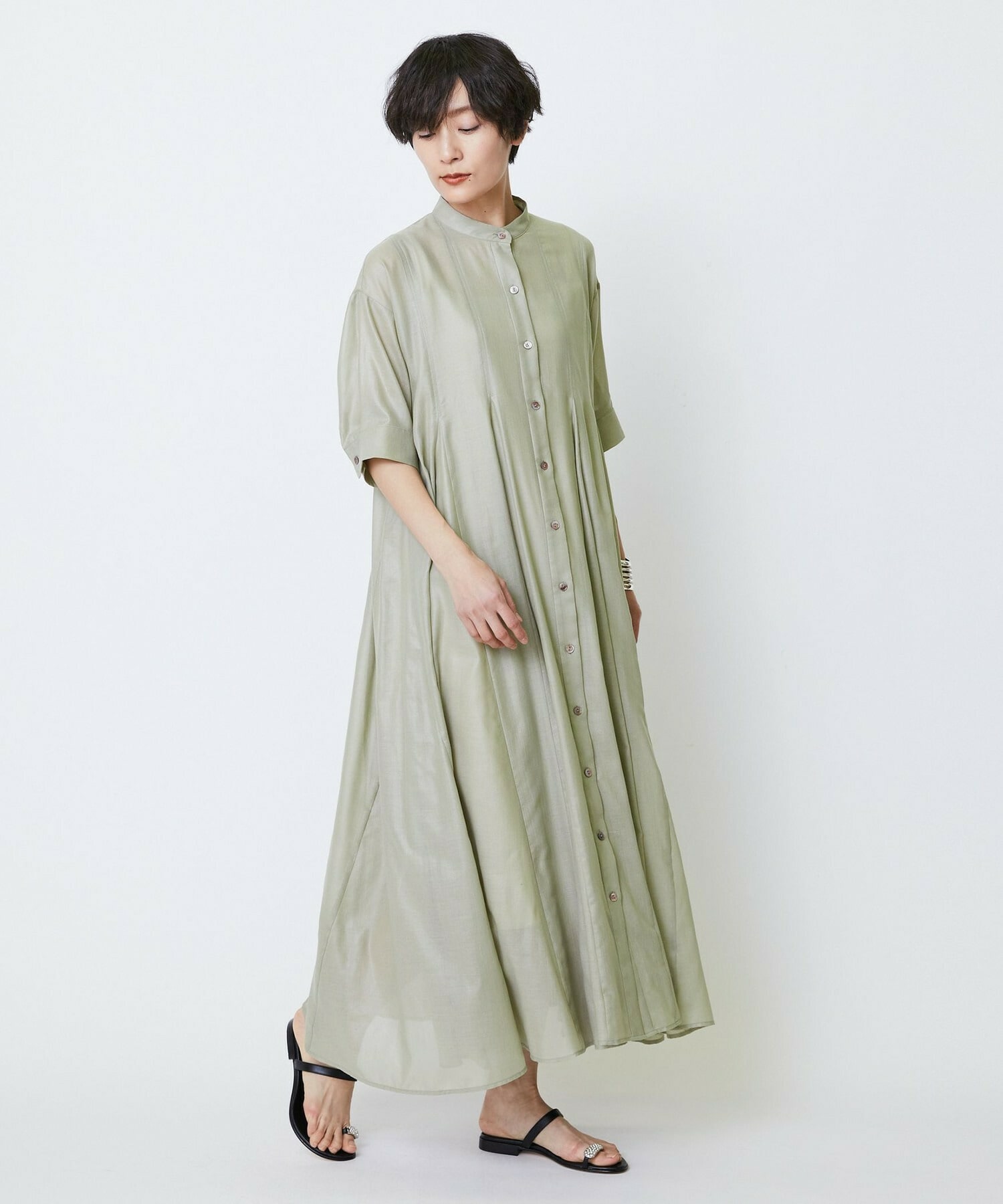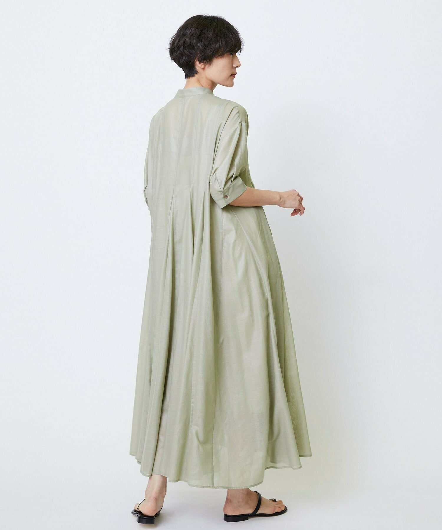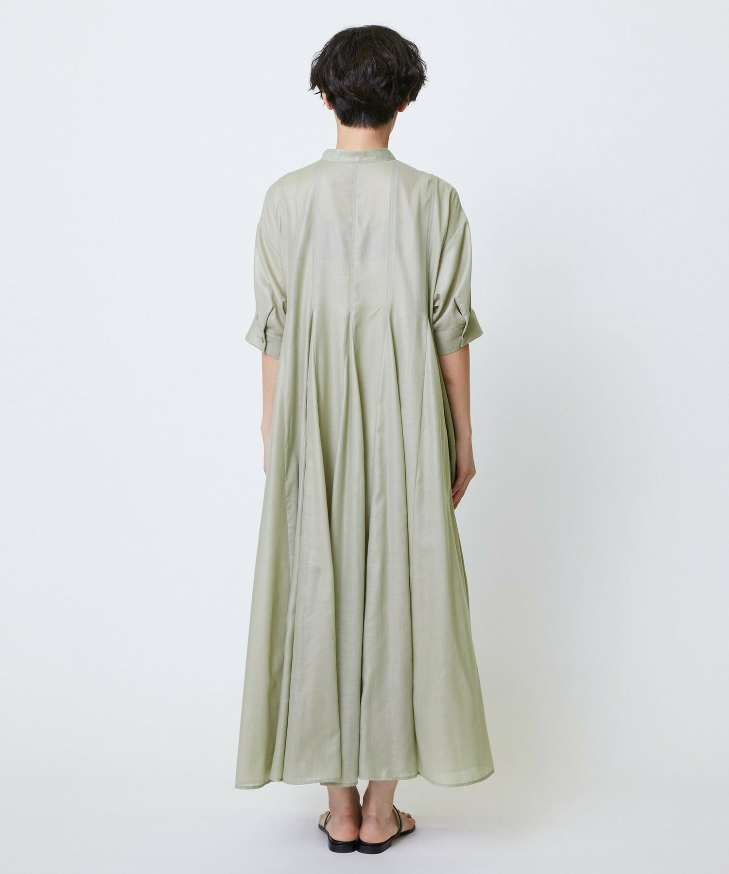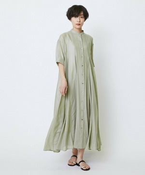 切り替えをふんだんに入れてドラマティックなシルエットを出したワンピース。生地が軽く落ち感があるのでボリュームがあってもおさまりが良く、動いたときにひらひらと表情が出て気分が上がります!