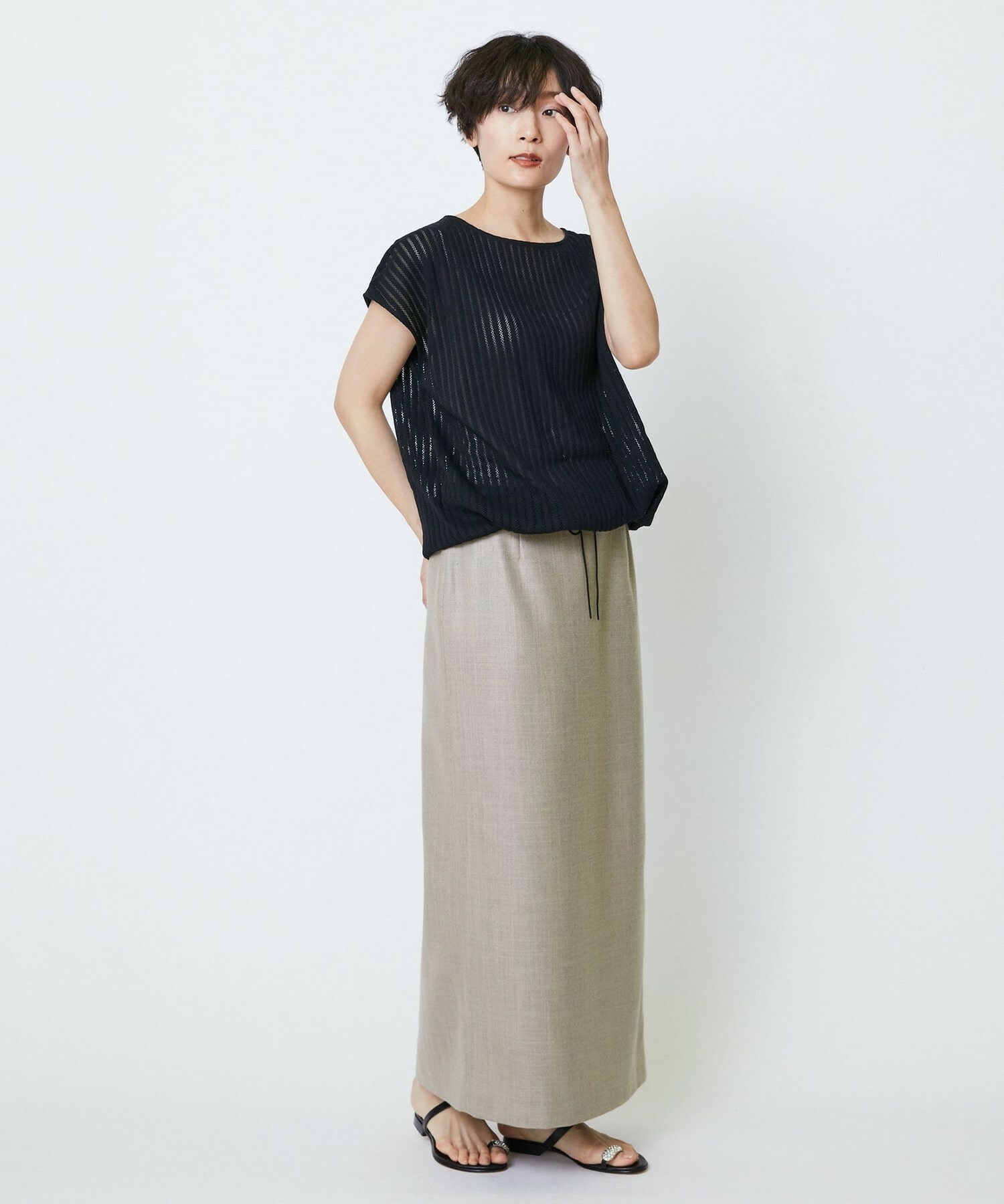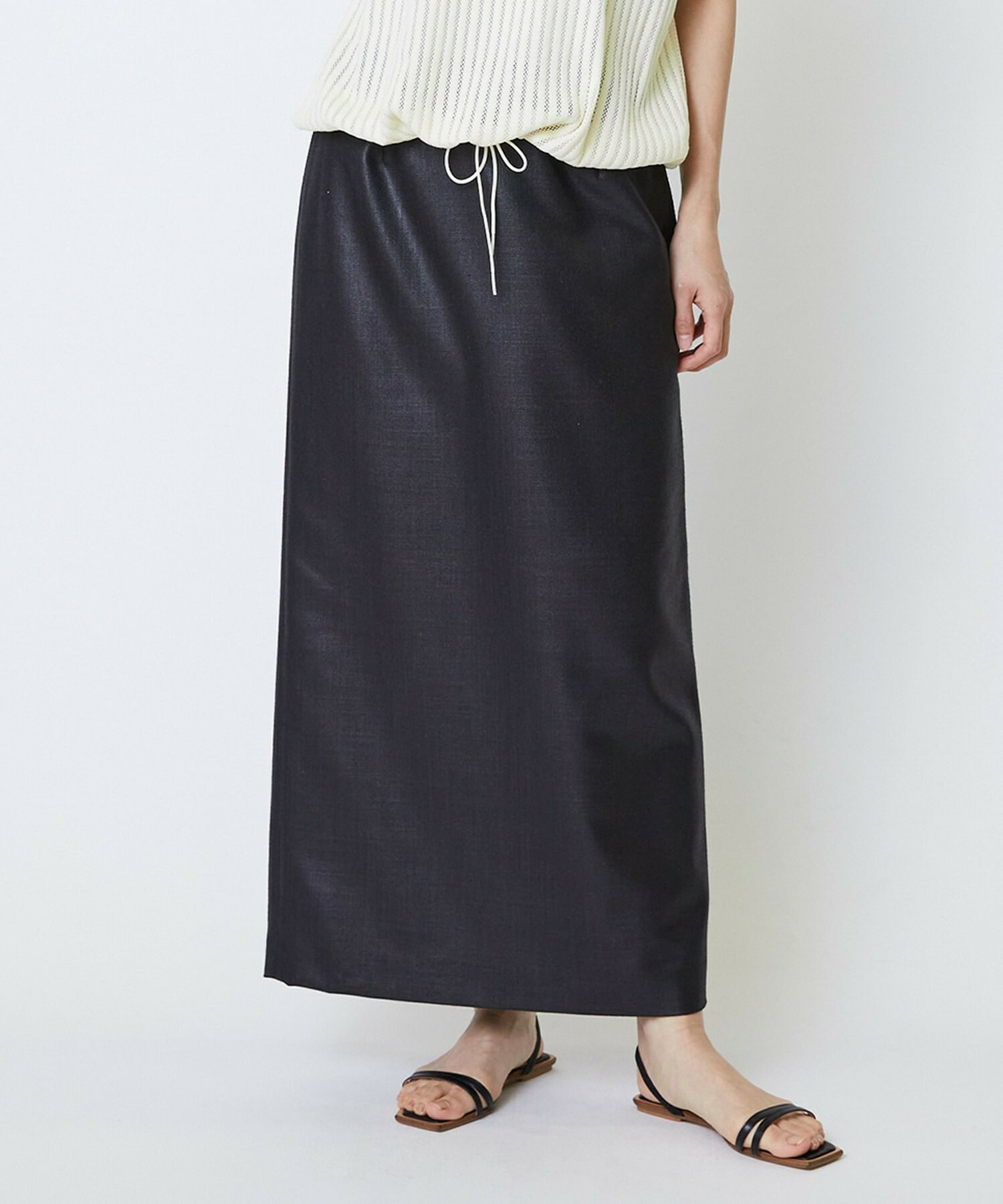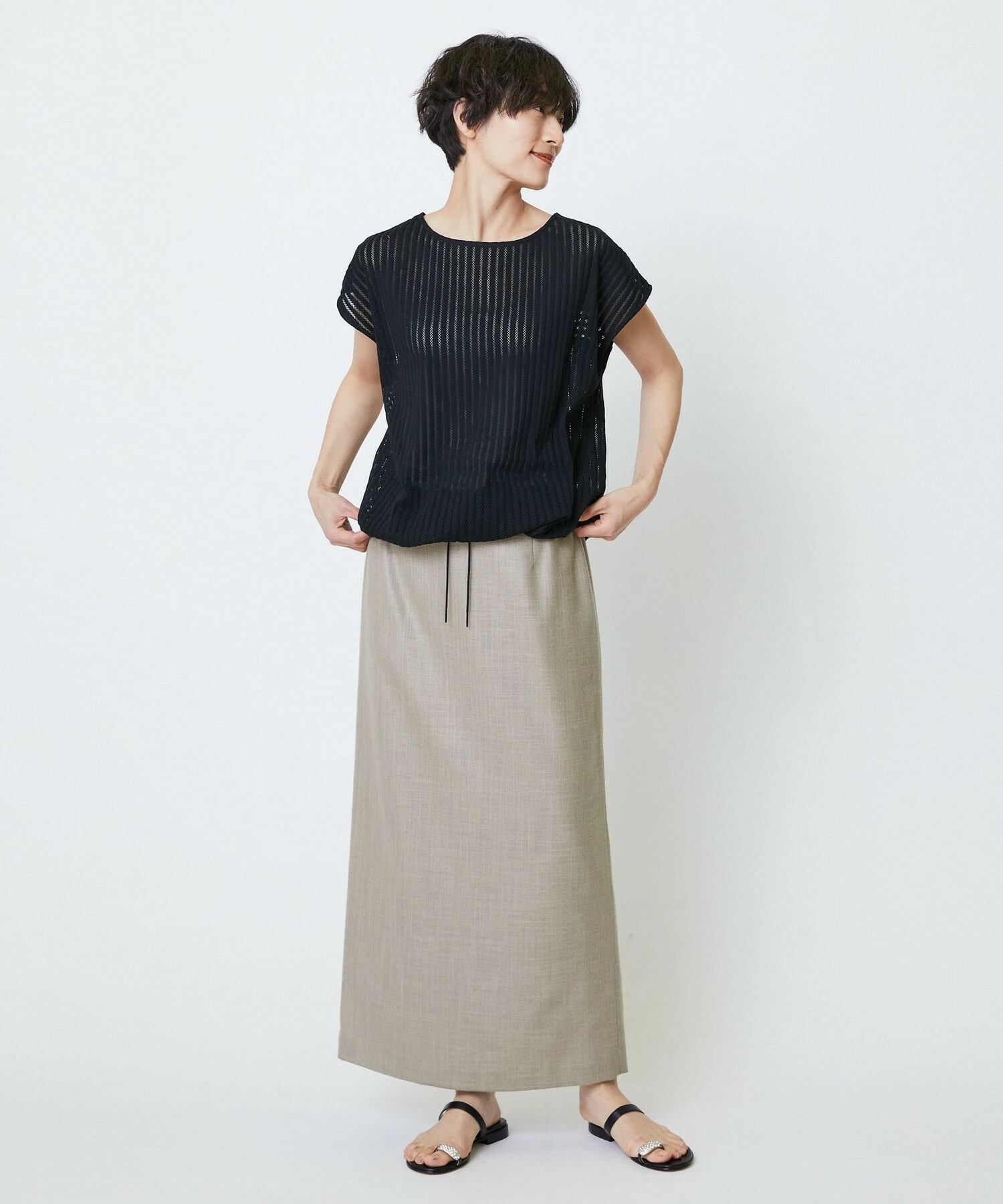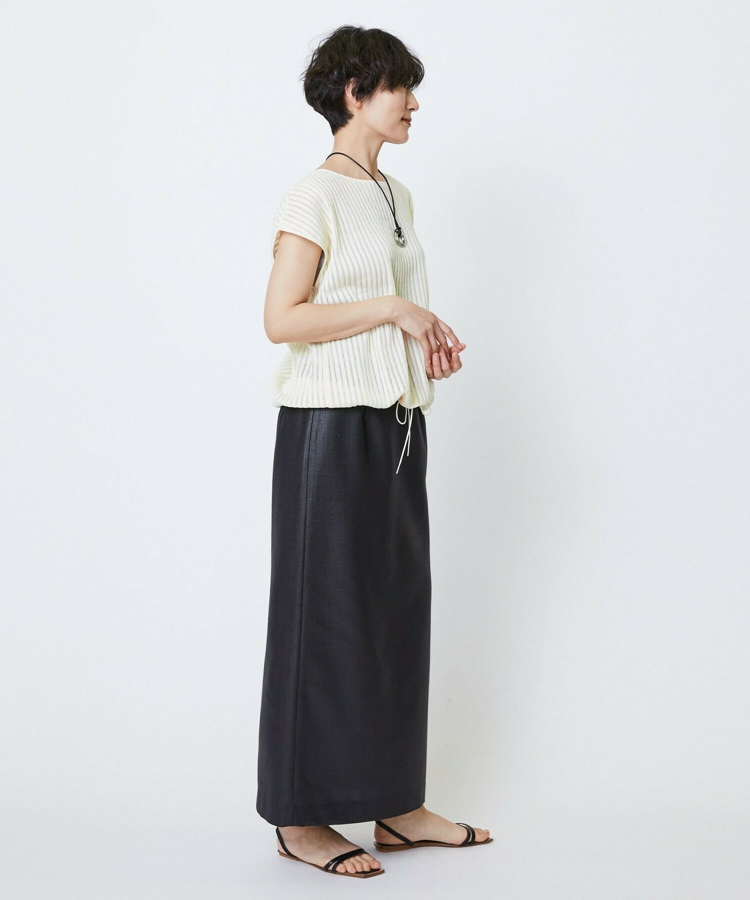 ラッセルメッシュストライプのトップスと好相性のシンプルなマキシタイトスカート。ウエストベルトを異素材にしただけのシンプルなデザイン。なんといっても素材感が特徴。ナチュラル感がありながら大人な表情のあるとても新鮮な素材です。