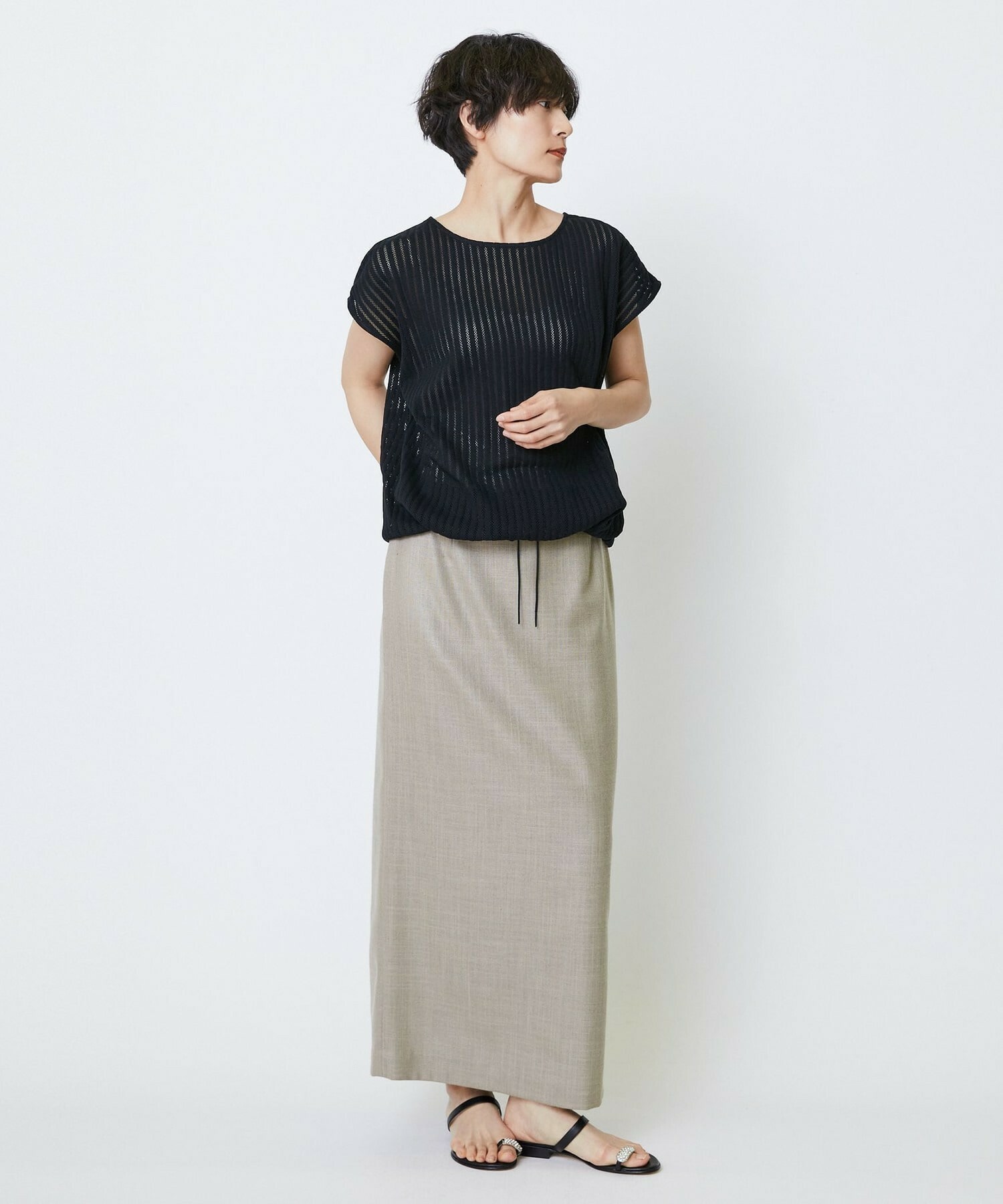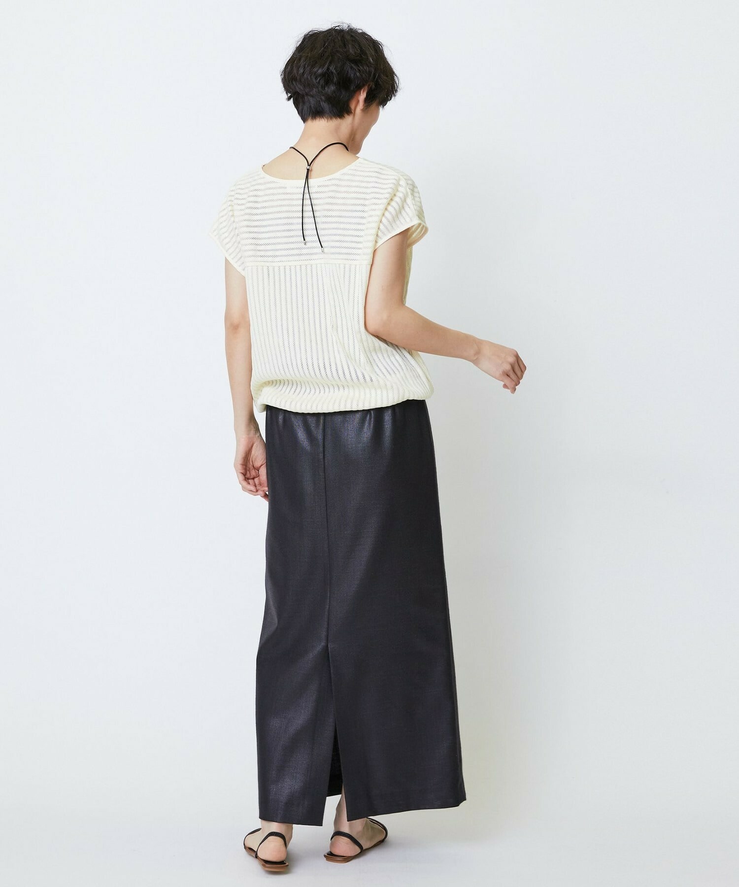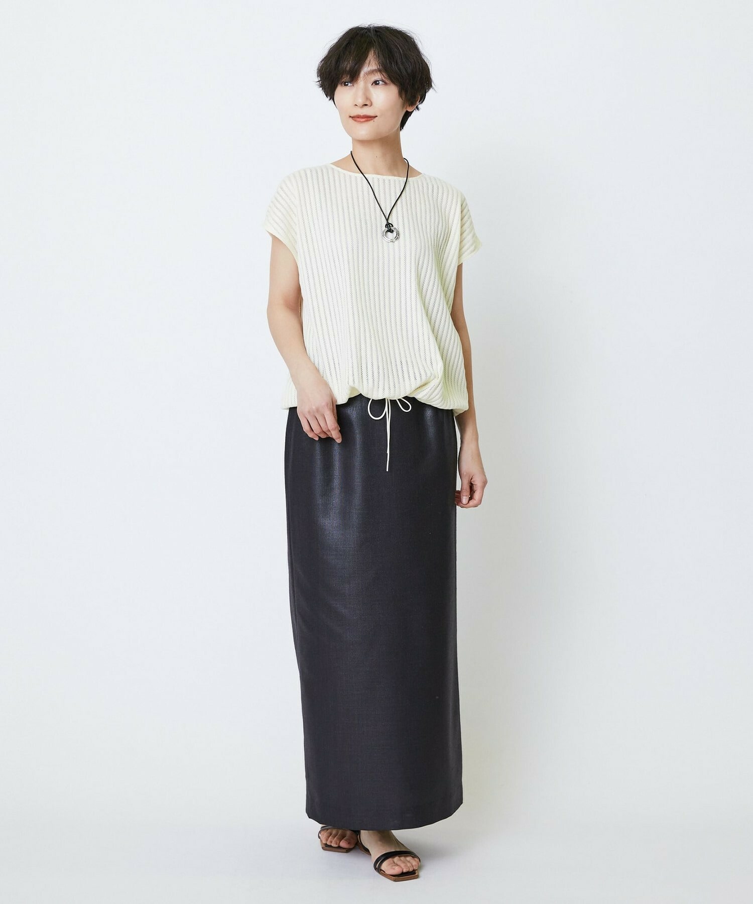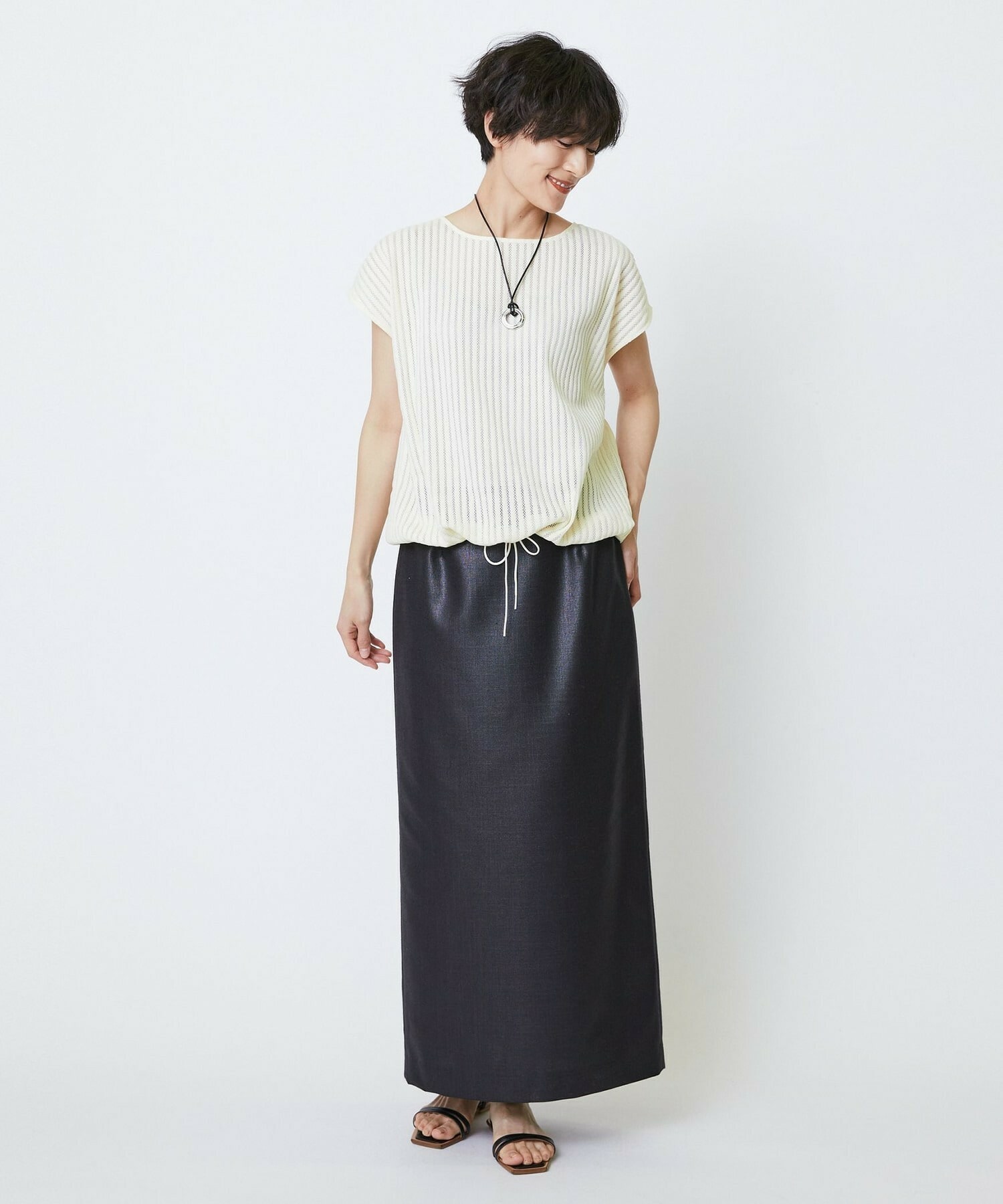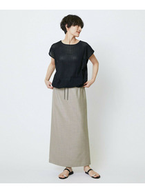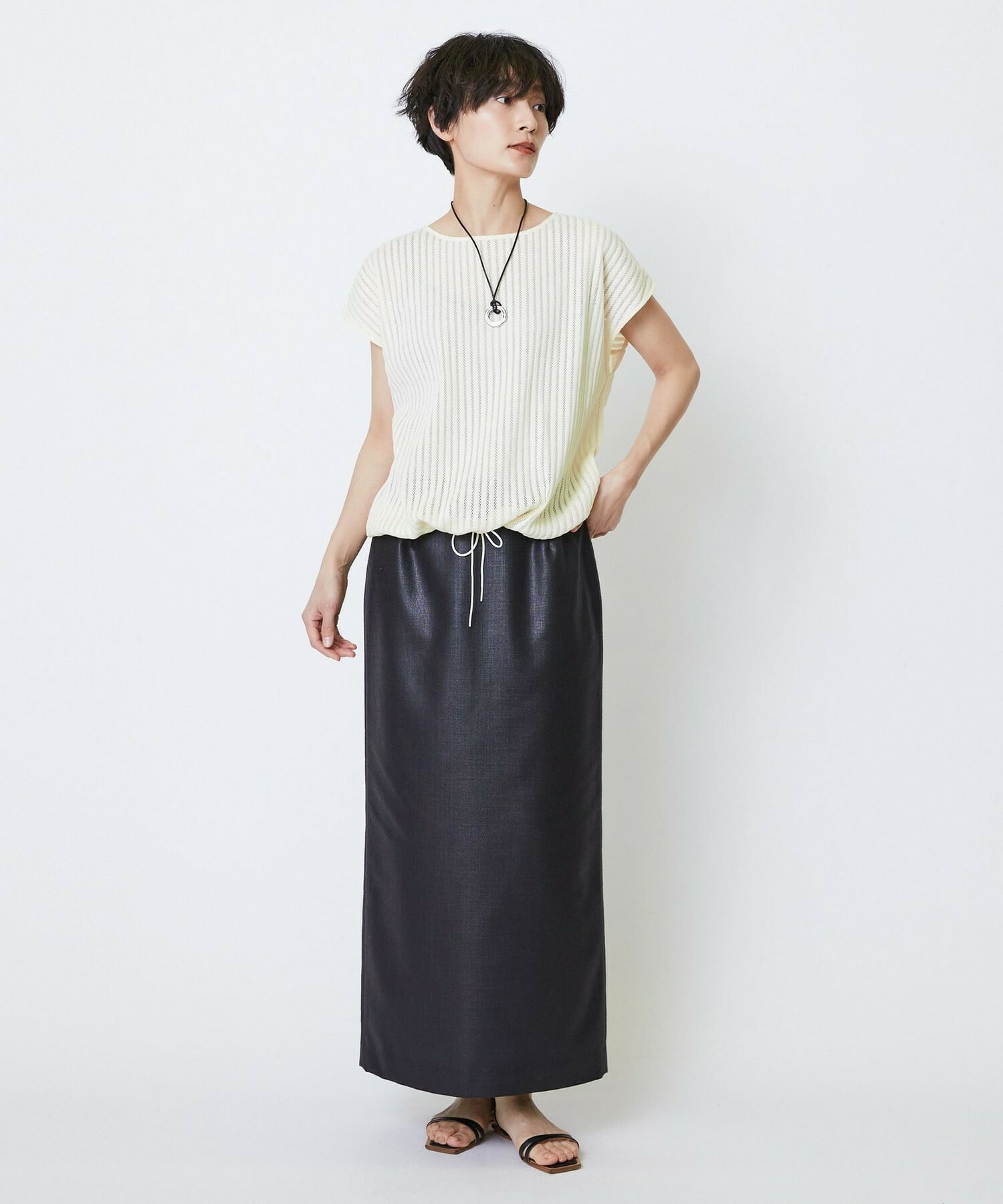 ラッセルメッシュストライプのトップスと好相性のシンプルなマキシタイトスカート。ウエストベルトを異素材にしただけのシンプルなデザイン。なんといっても素材感が特徴。ナチュラル感がありながら大人な表情のあるとても新鮮な素材です。