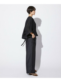 襟ぐり、前端、袖口には別布のアクセント。裾口はアレンジ可能なリボン付きです。
