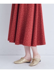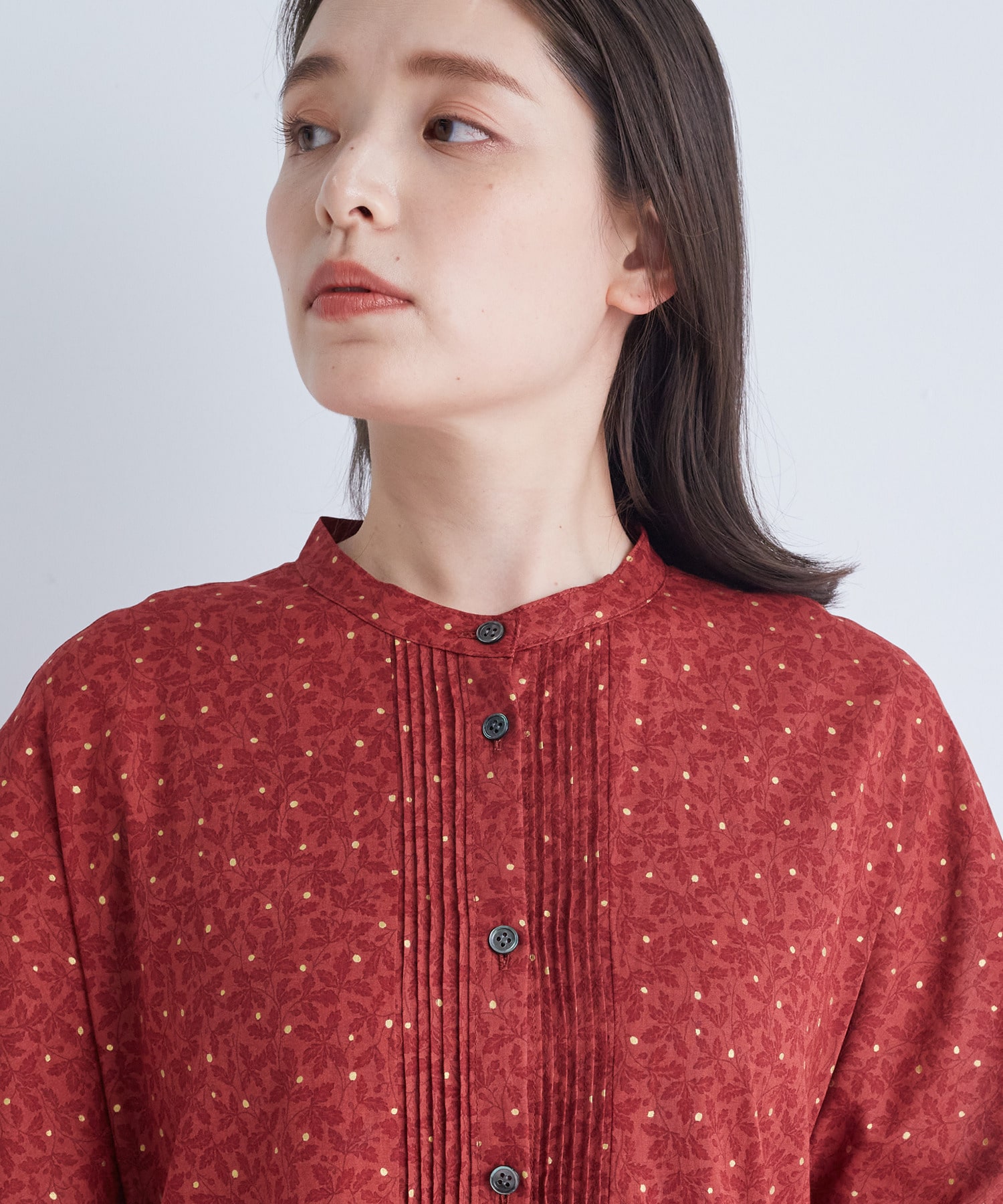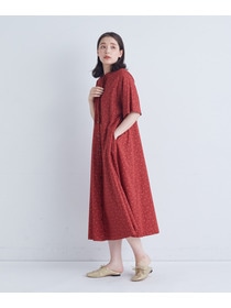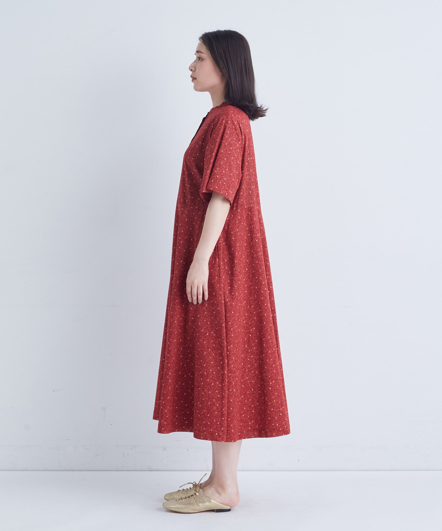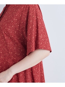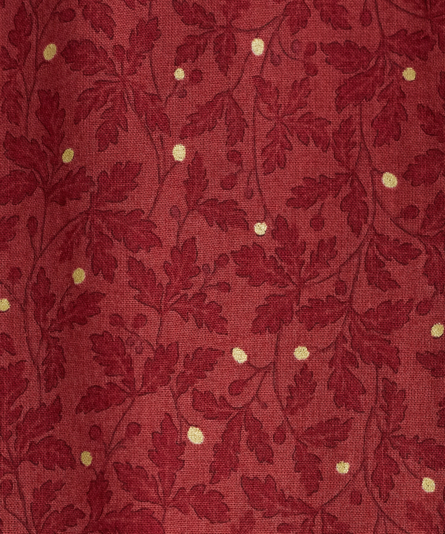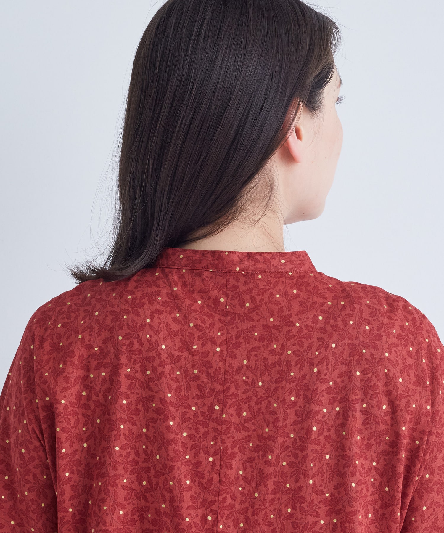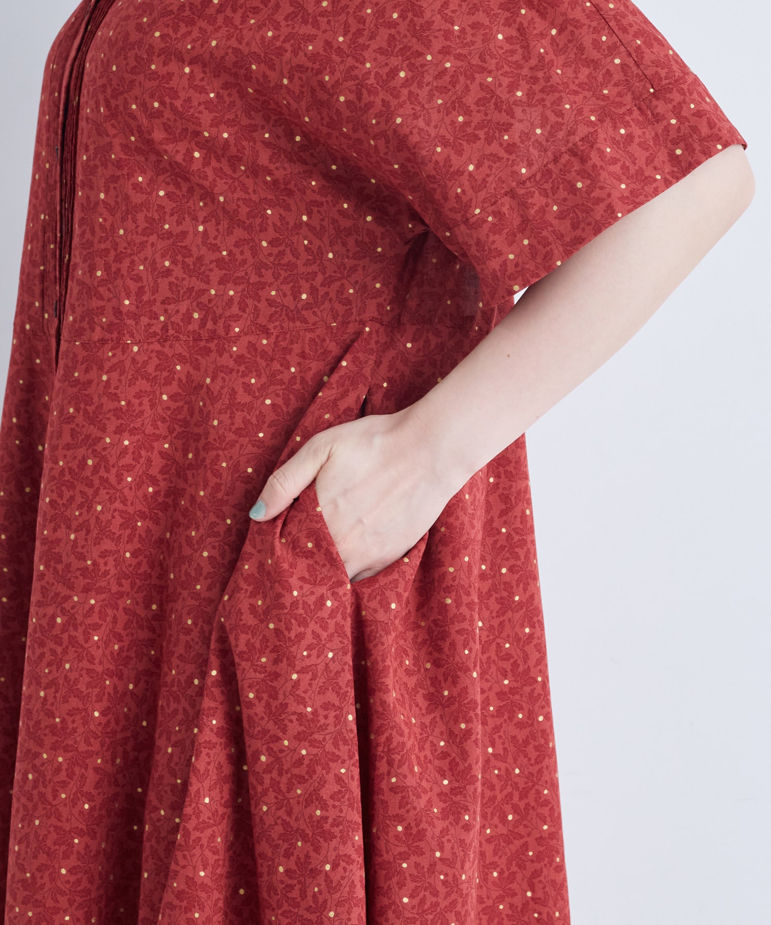 レッド系と言っても、ギラギラしておらず、非常にシックなレッドです。リーフ柄が少しクリスマスの香りもあって、晩夏、秋、コートを羽織って冬もいけるかも。