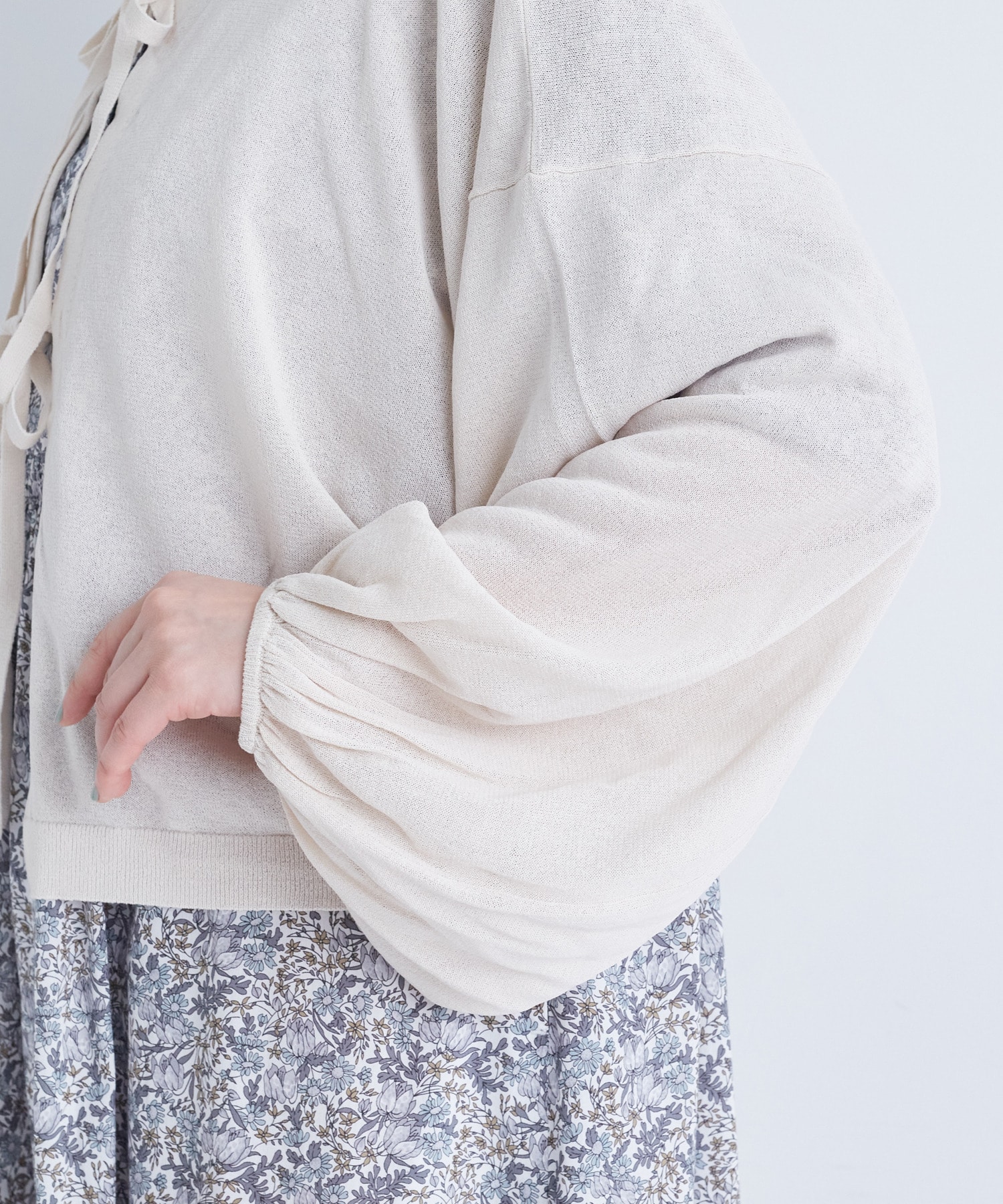 リボン使いがポイントで、広めの袖幅で様々なアイテムの羽織に使えます。