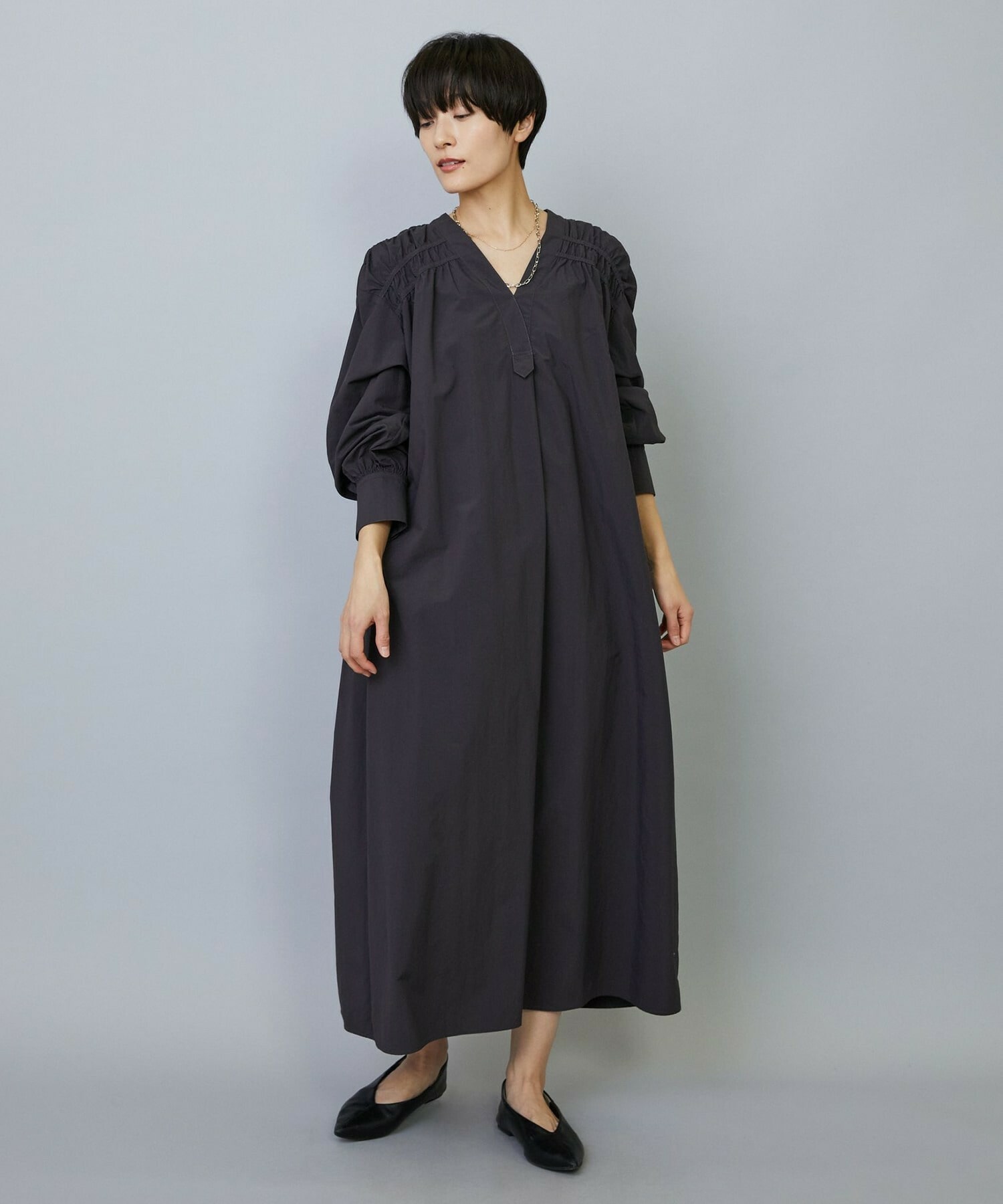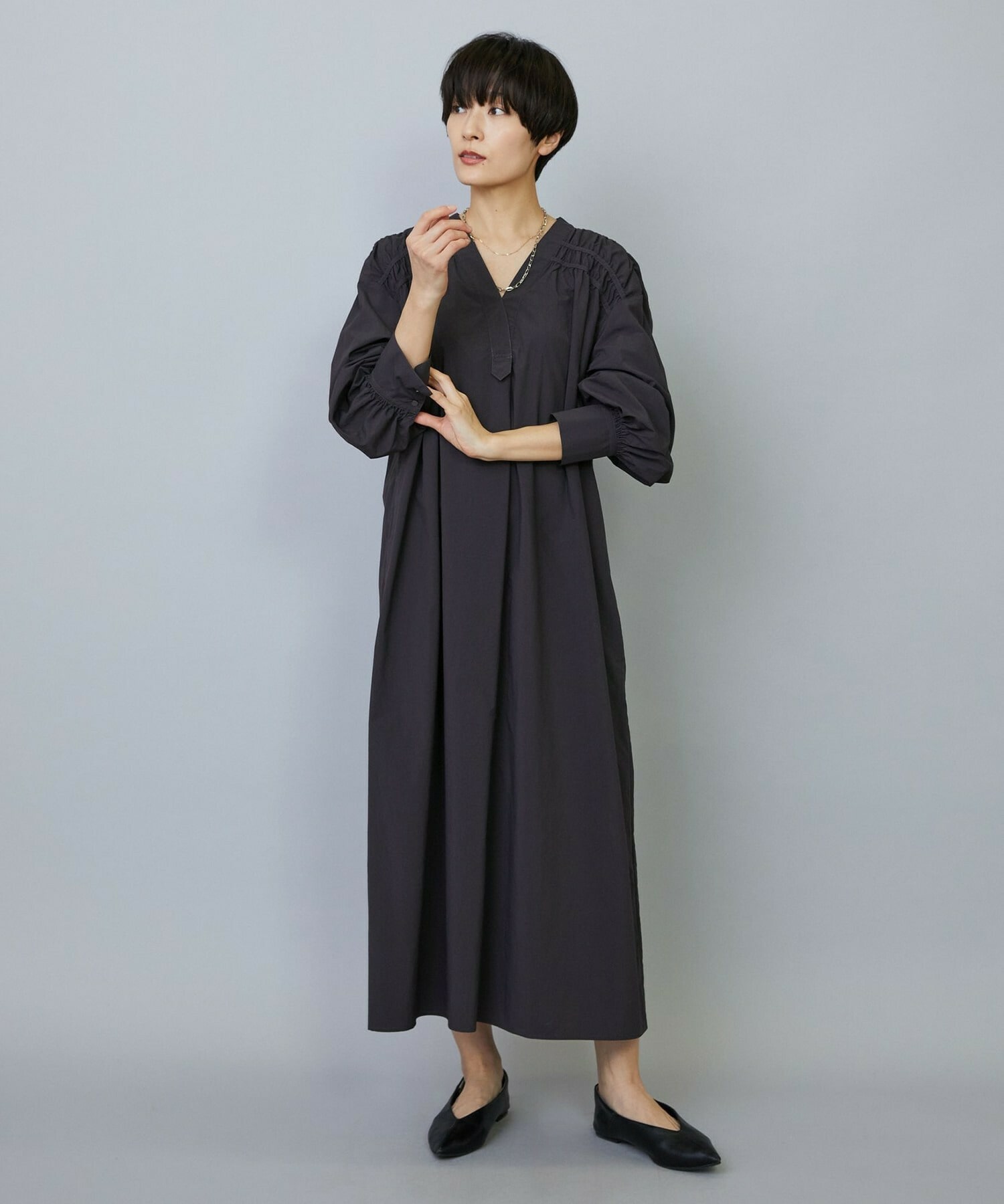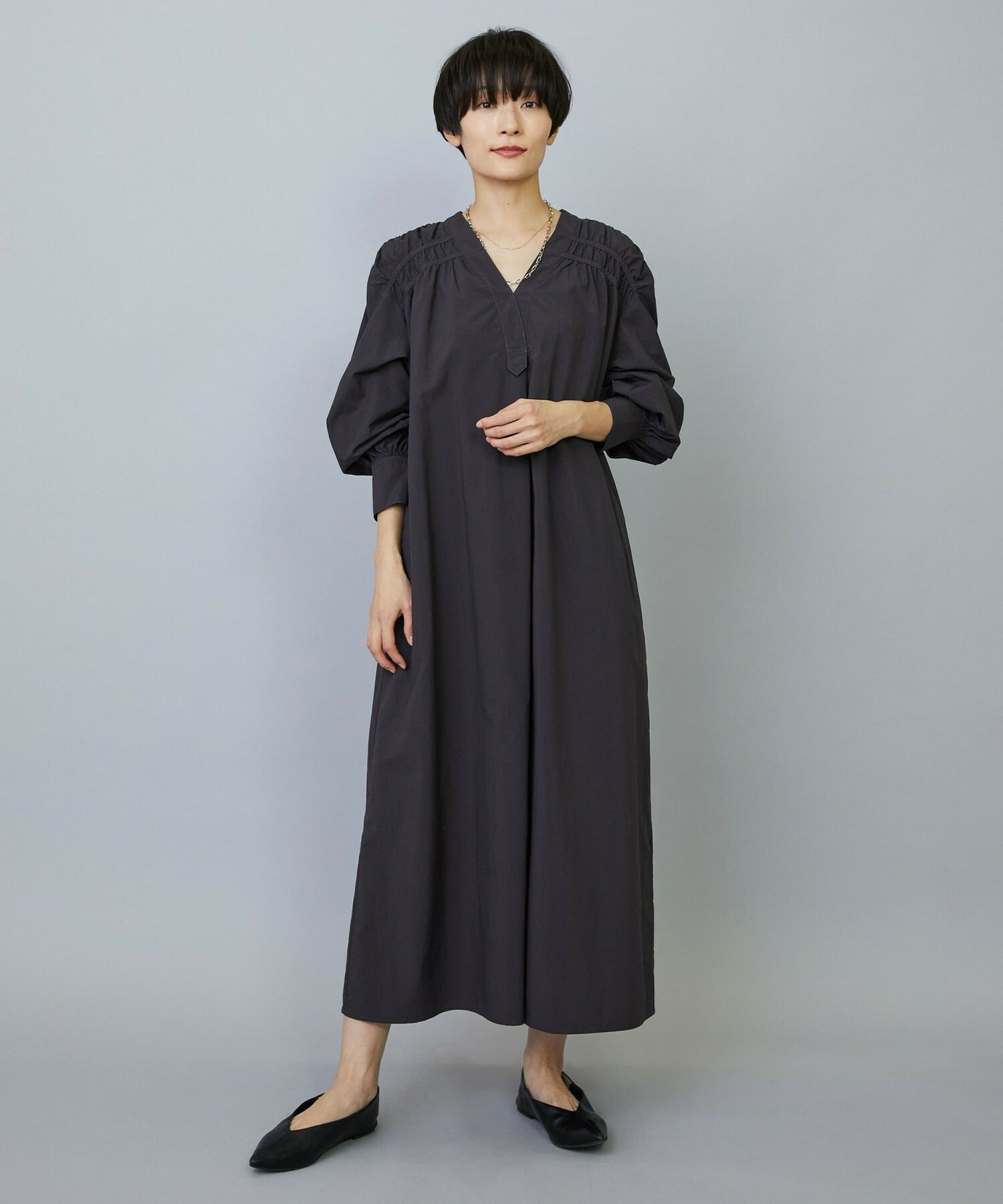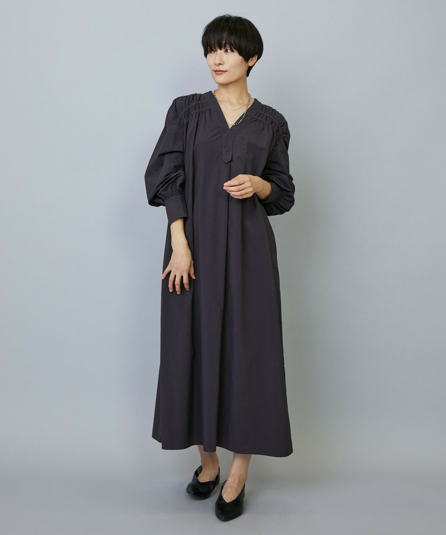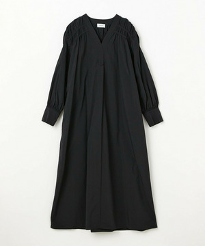抜け感のあるVネックのスキッパーにふんだんに取り入れたギャザーとシャーリングがポイントのIラインワンピース。ギャザーは共生地のテープでボリュームを抑え、立体感のあるメリハリを出しています。程良く体離れするシルエットでボリューム袖とのバランスが良い1枚です。