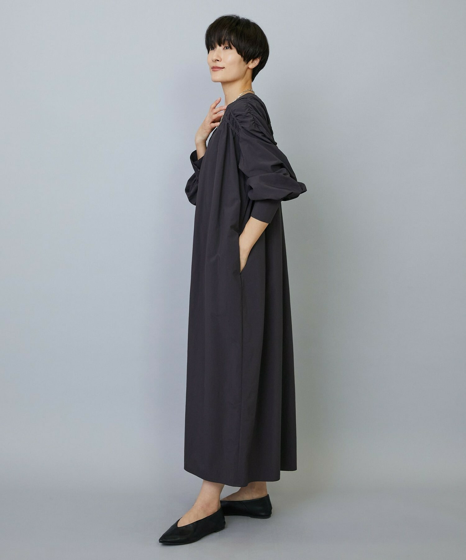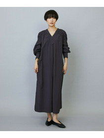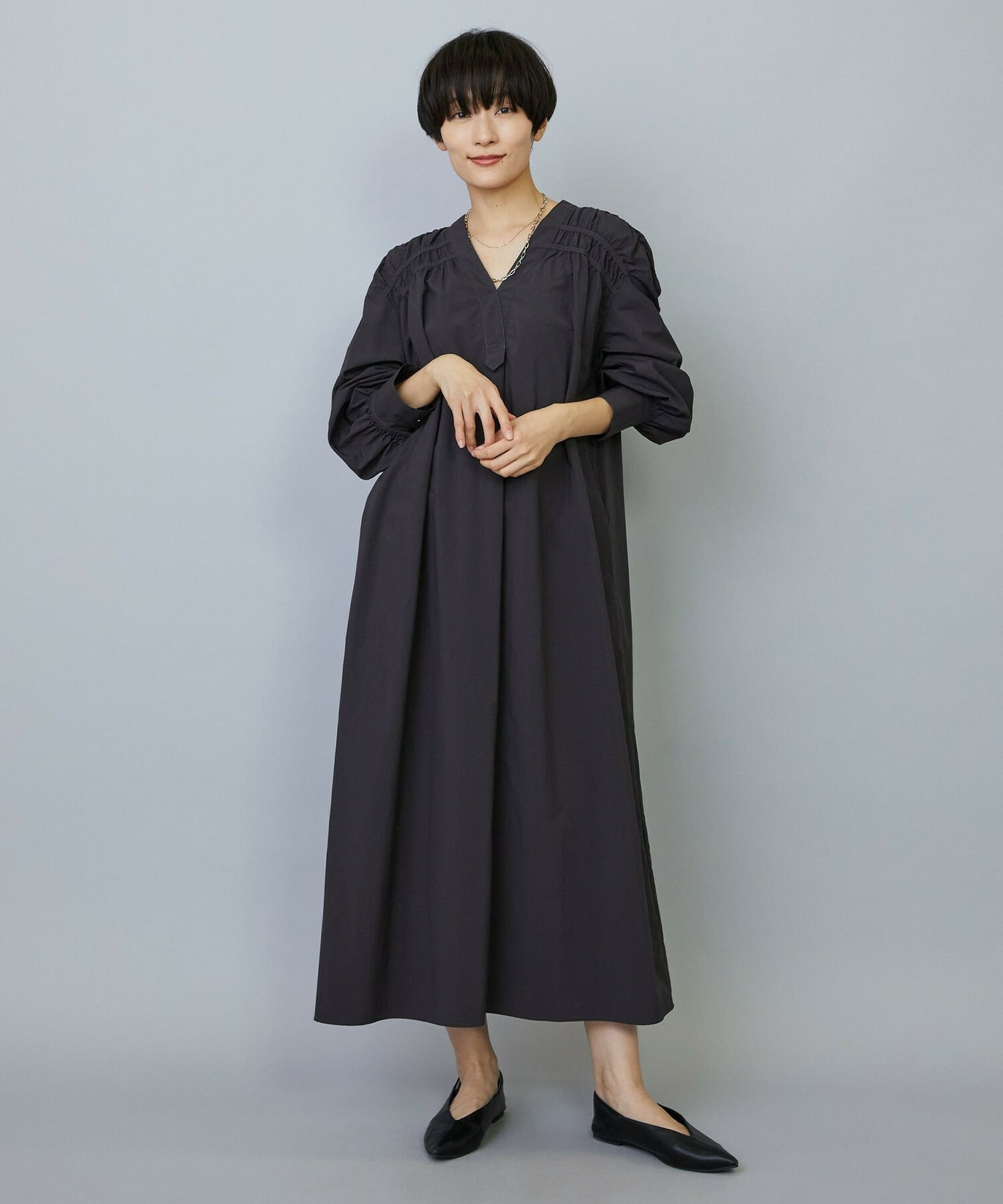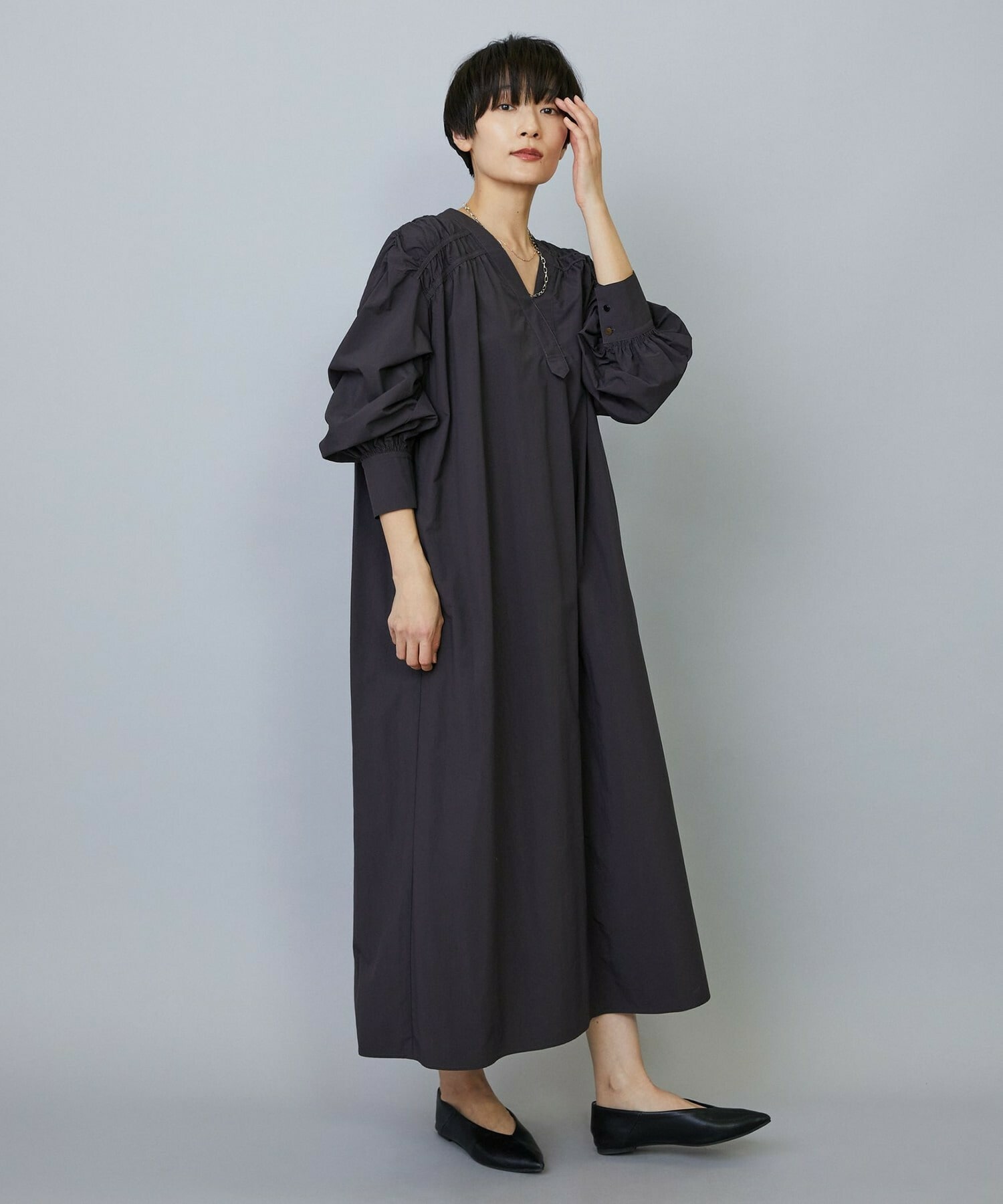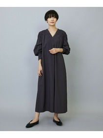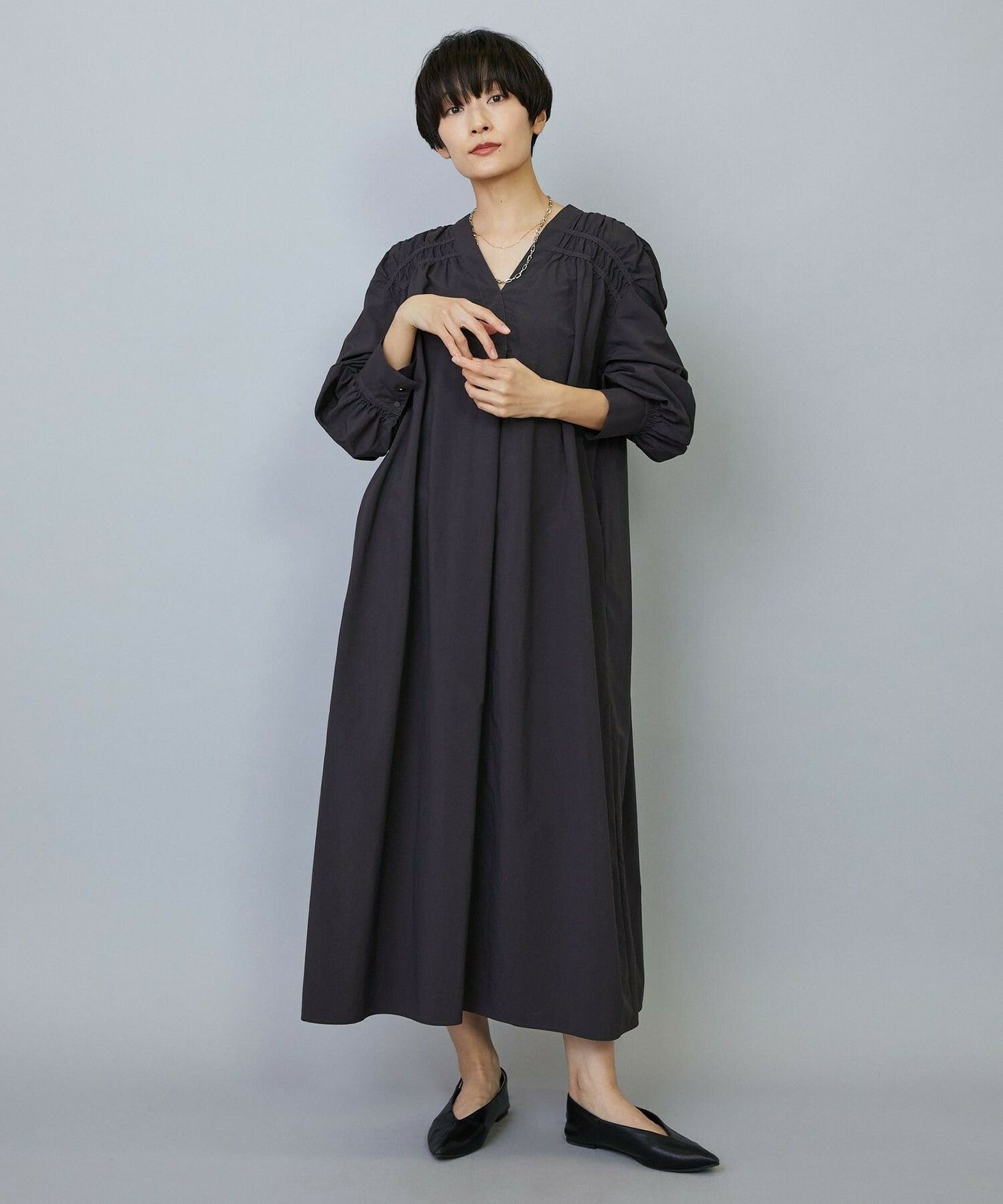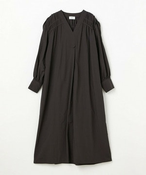 抜け感のあるVネックのスキッパーにふんだんに取り入れたギャザーとシャーリングがポイントのIラインワンピース。ギャザーは共生地のテープでボリュームを抑え、立体感のあるメリハリを出しています。程良く体離れするシルエットでボリューム袖とのバランスが良い1枚です。