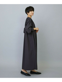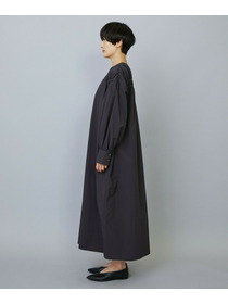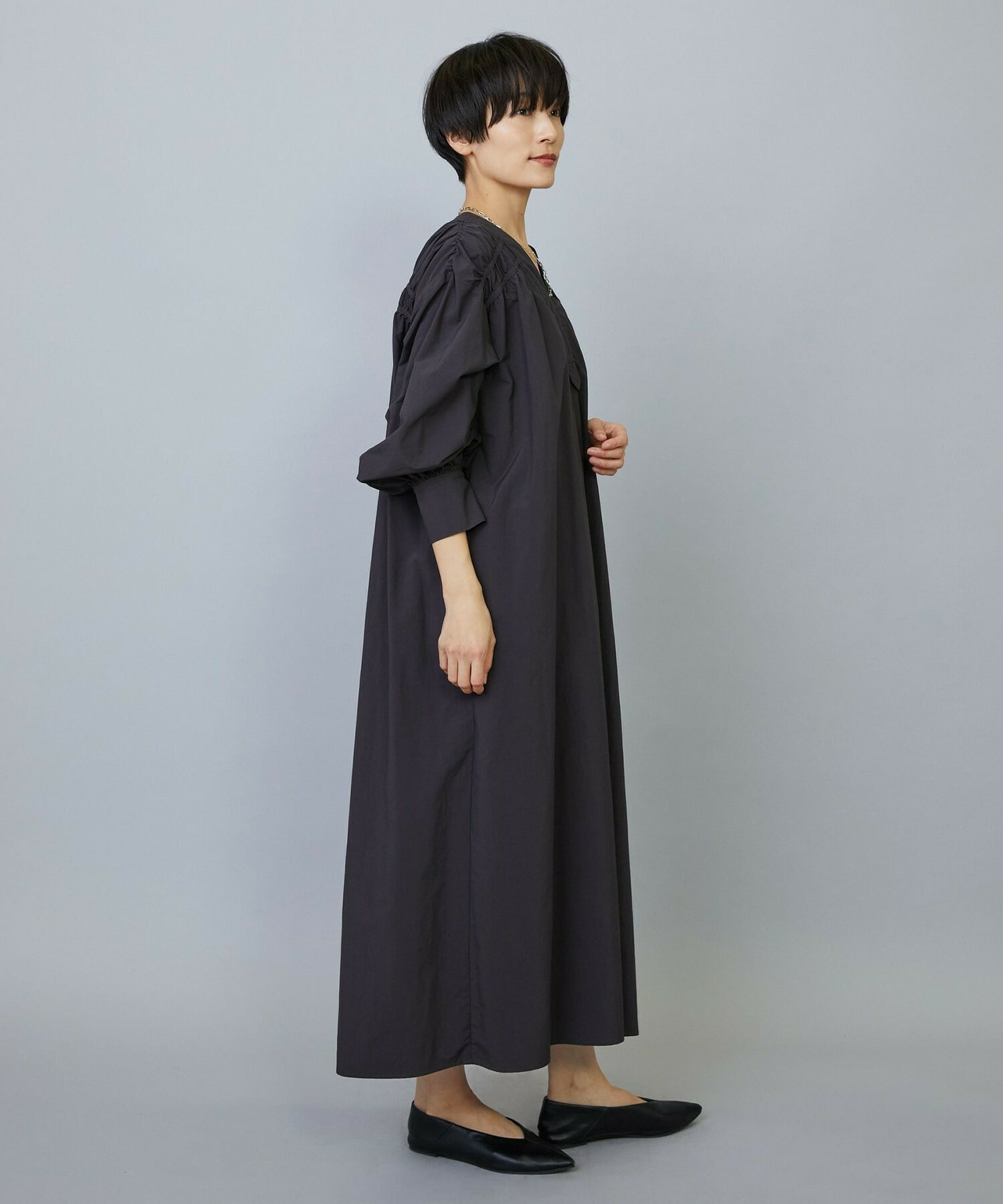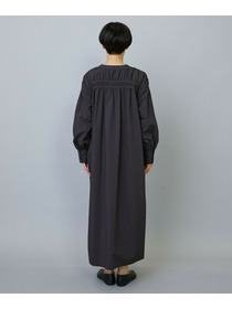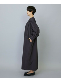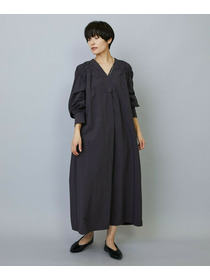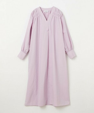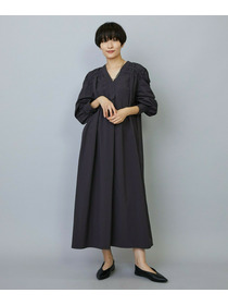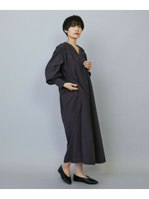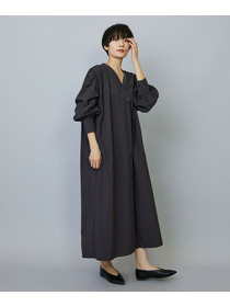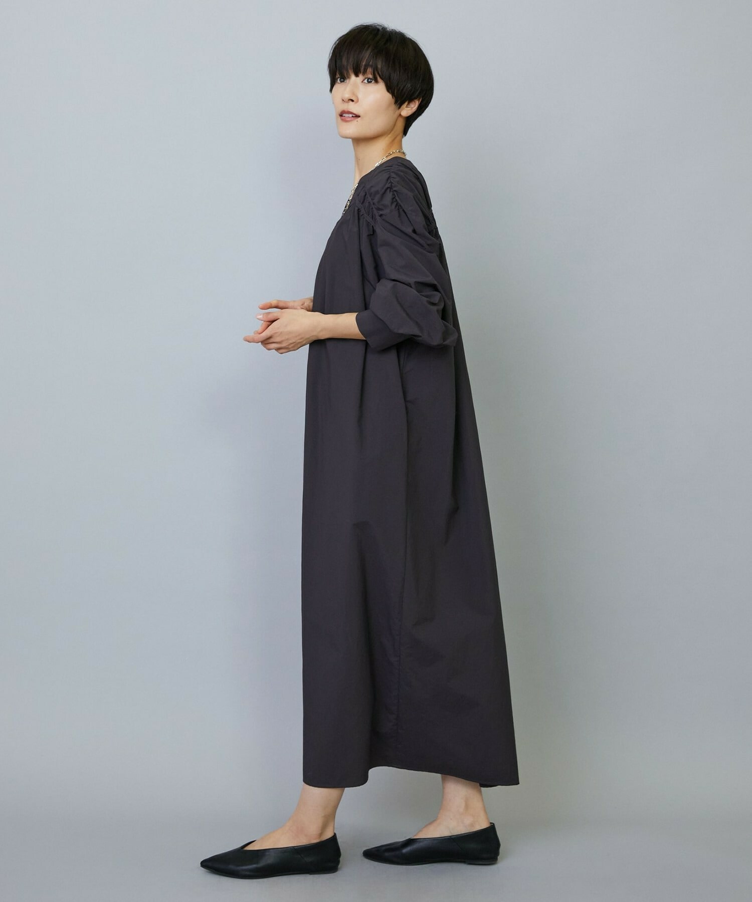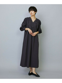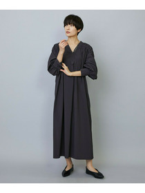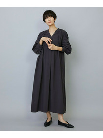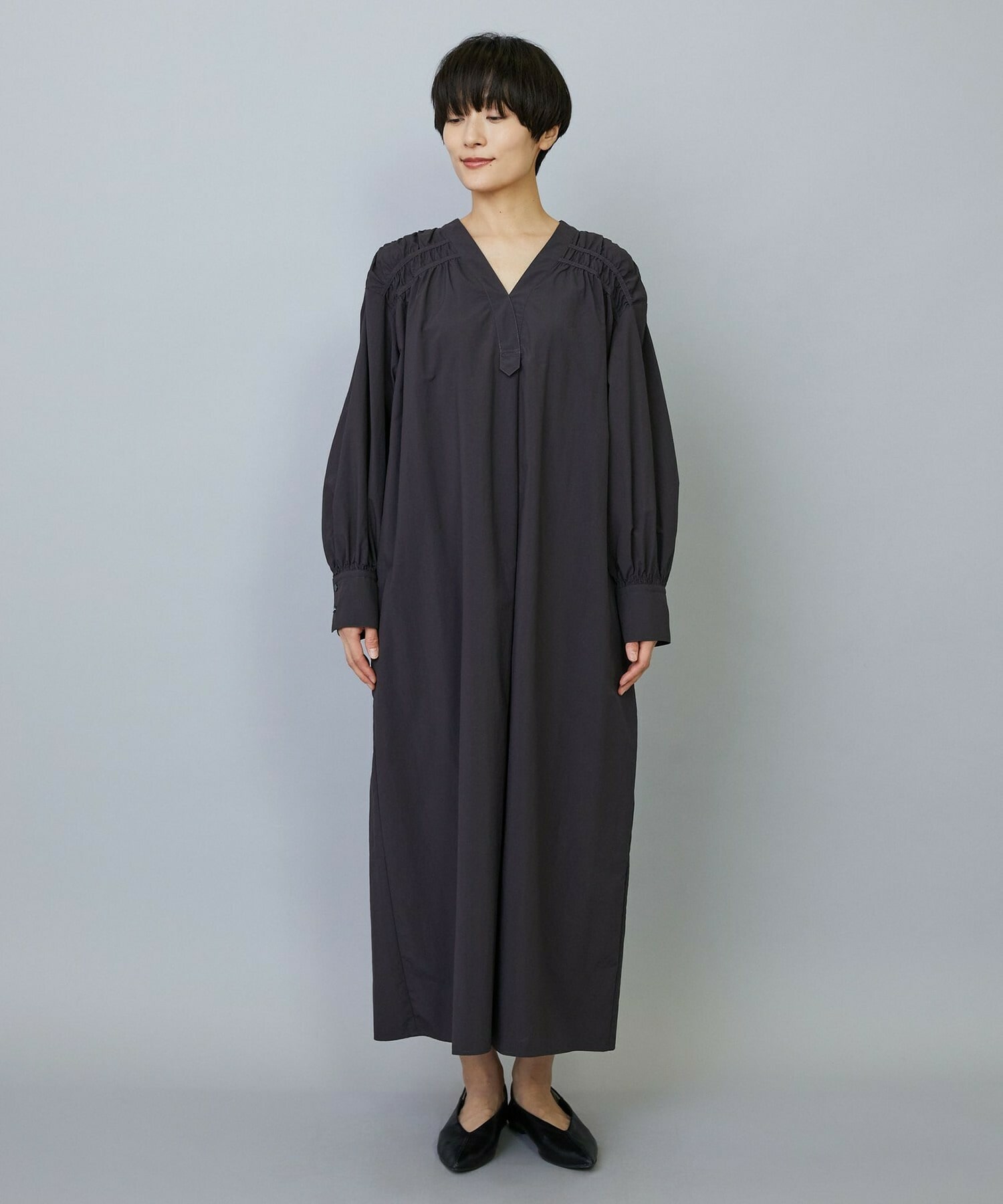 抜け感のあるVネックのスキッパーにふんだんに取り入れたギャザーとシャーリングがポイントのIラインワンピース。ギャザーは共生地のテープでボリュームを抑え、立体感のあるメリハリを出しています。程良く体離れするシルエットでボリューム袖とのバランスが良い1枚です。