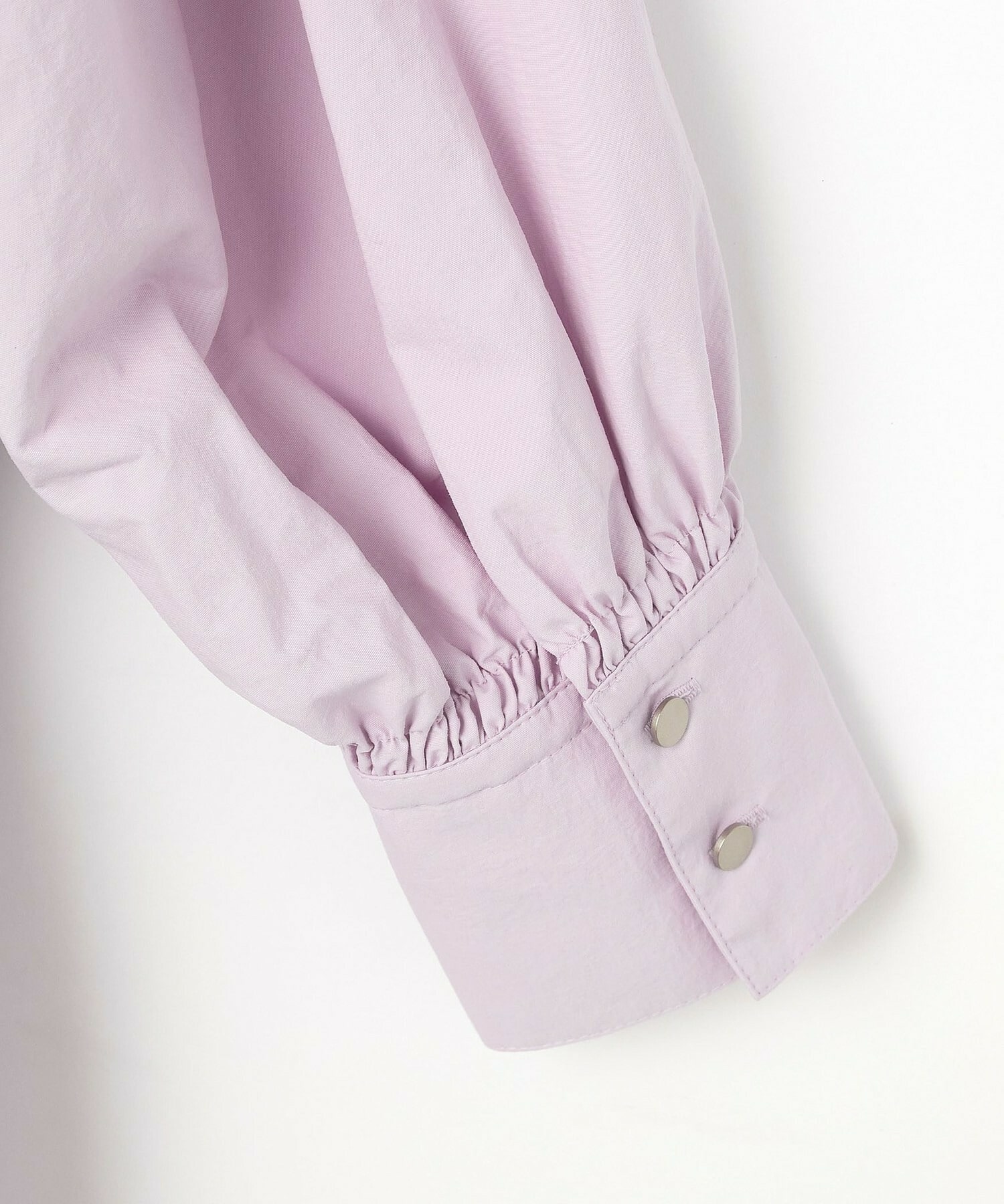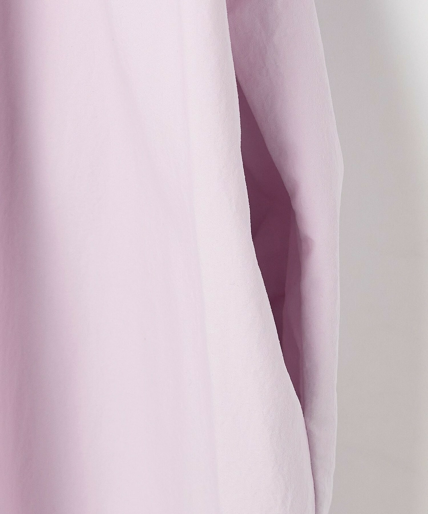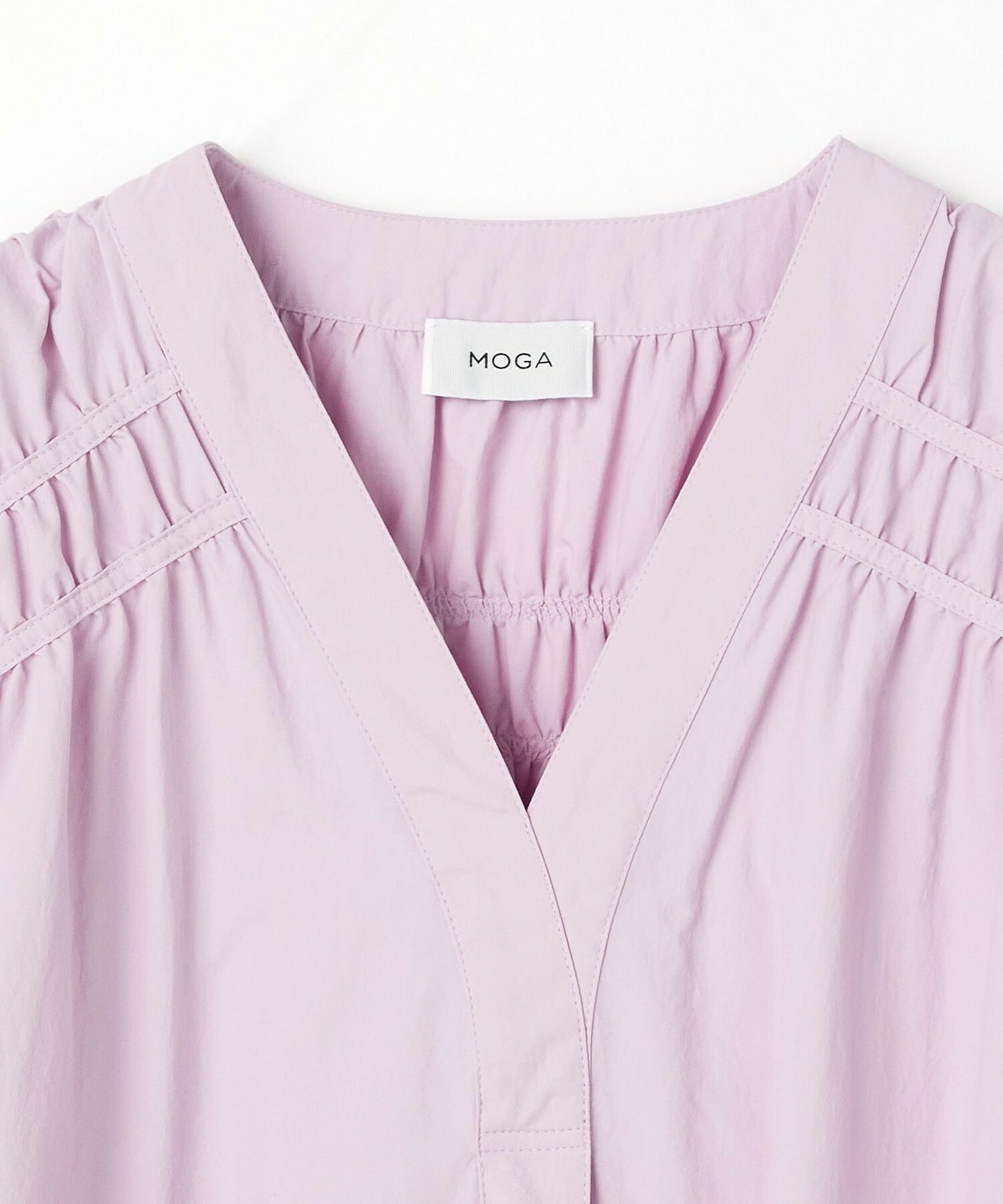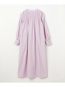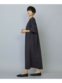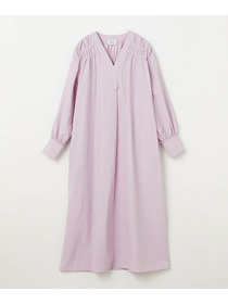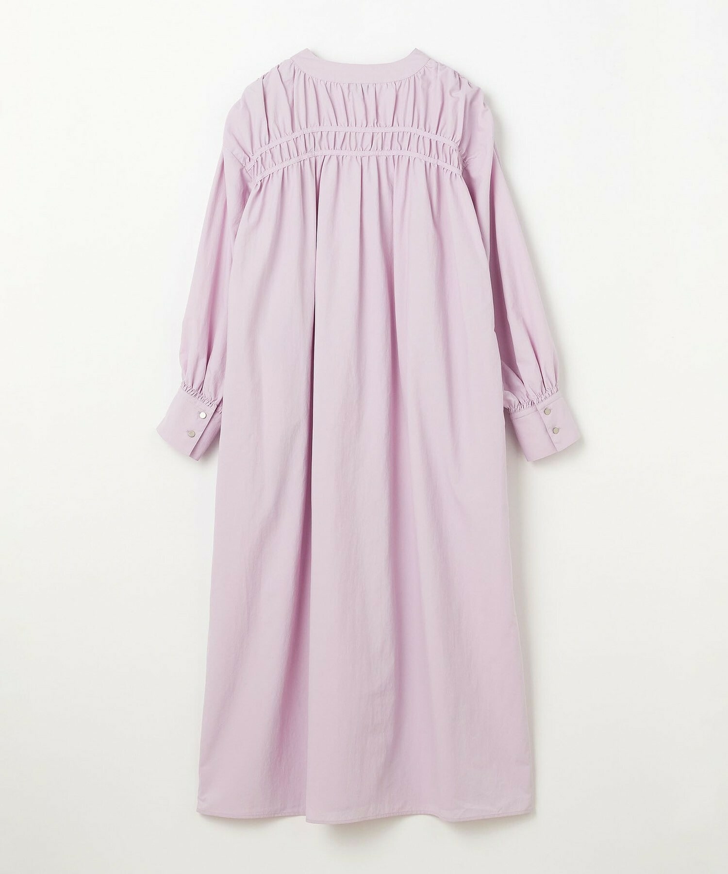 抜け感のあるVネックのスキッパーにふんだんに取り入れたギャザーとシャーリングがポイントのIラインワンピース。ギャザーは共生地のテープでボリュームを抑え、立体感のあるメリハリを出しています。程良く体離れするシルエットでボリューム袖とのバランスが良い1枚です。