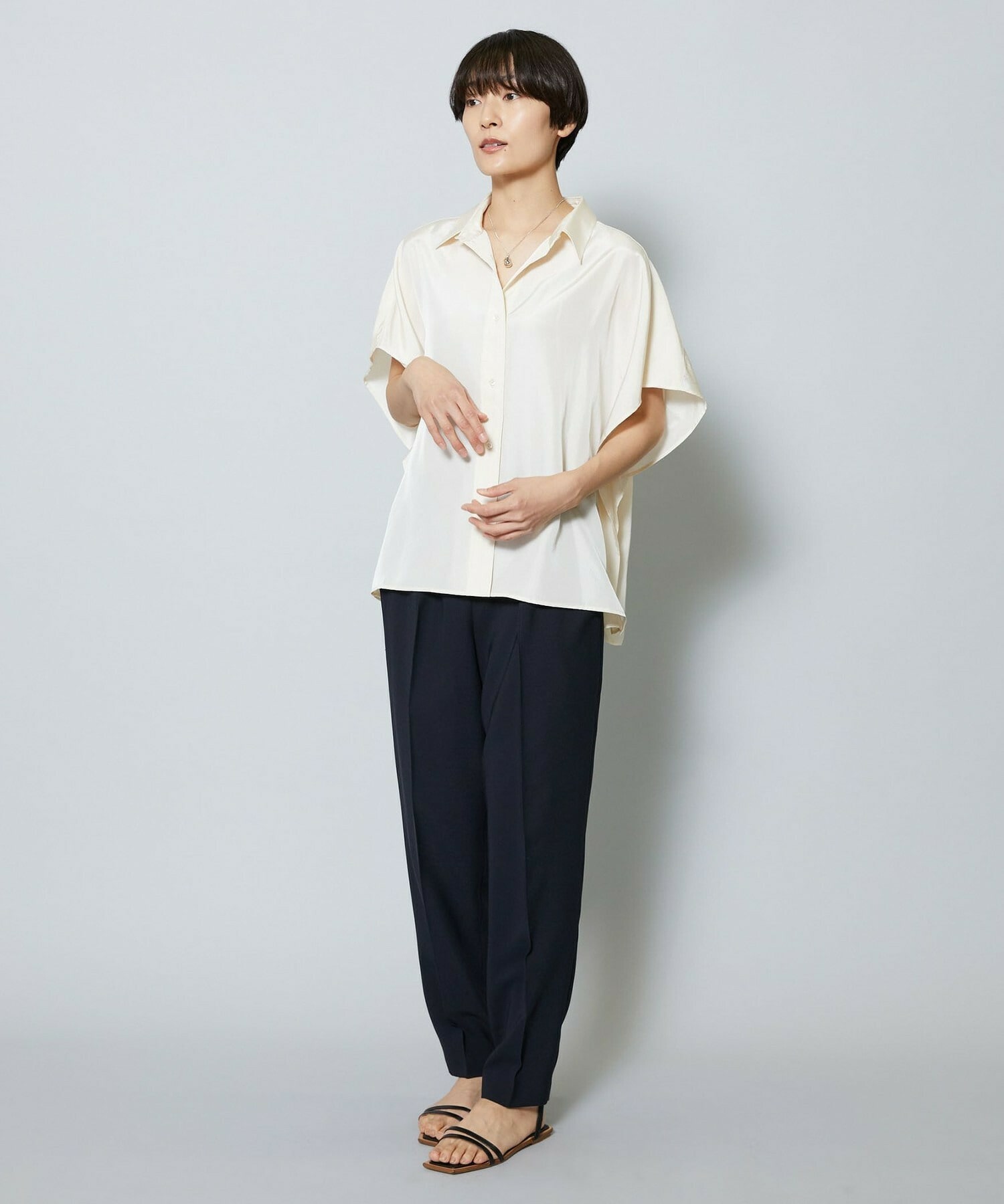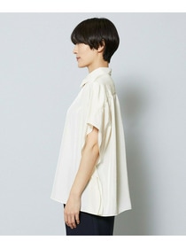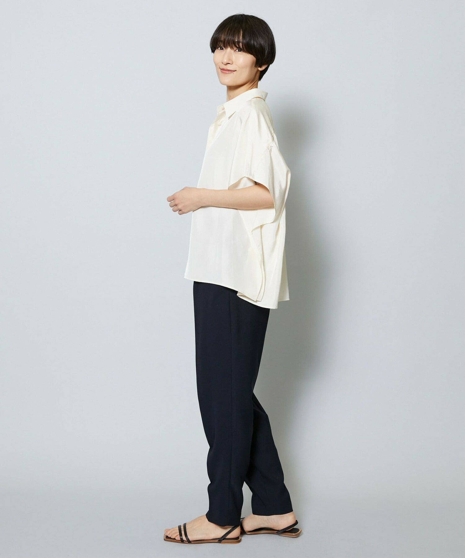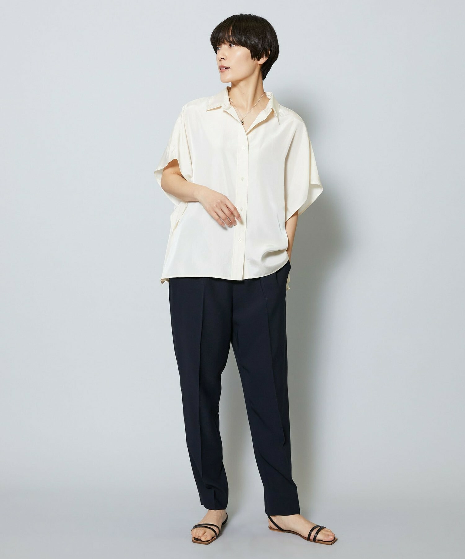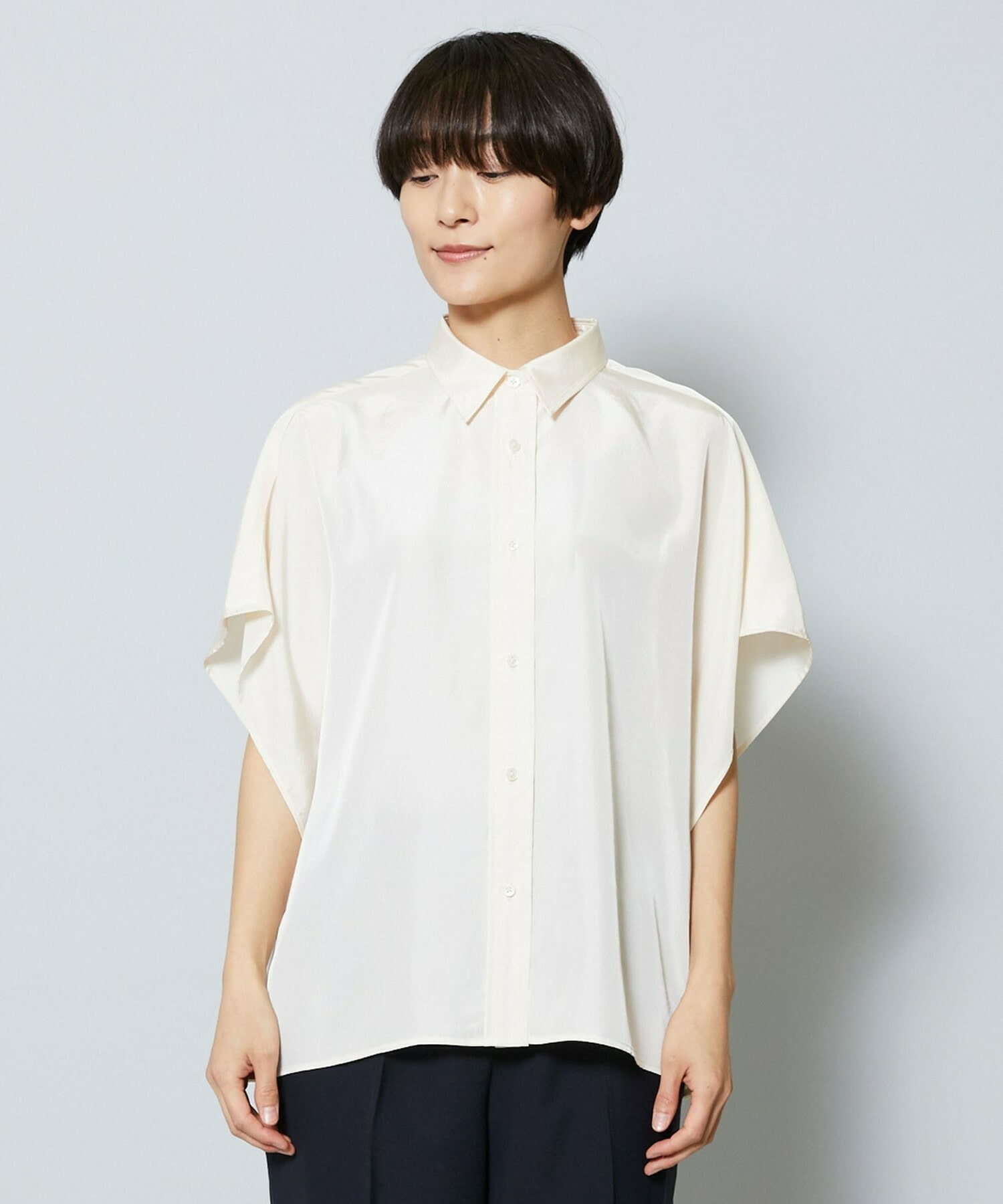 1枚着で映えるケープシャツです。暑い日にはサラッと羽織っていただけるアイテムです。二の腕を強調しないデザインになっており、アームホールがない設計なので汗染みも気になりにくいです。サイドにはケープならではのドレープ感がアクセントに。襟や前立てはしっかり決めているので、緩くなりすぎないキレイめな見え方です。